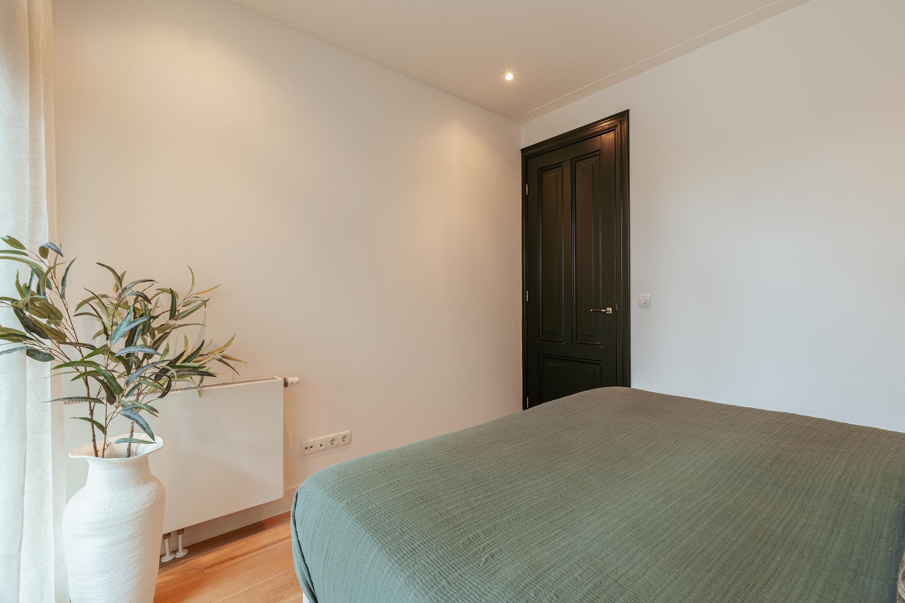 De trap aan de voorzijde leidt naar de eerste verdieping. Aan de voorzijde ligt de ruime hoofdslaapkamer met grote ramen en openslaande deuren die een prachtig uitzicht bieden over de gracht. De kamer is warm ingericht met een stijlvolle houten wand en beschikt over extra ruimte voor een eventuele werkplek. Aansluitend bevindt zich een moderne badkamer, voorzien van een inloopdouche, wastafelmeubel en luxe afwerking.