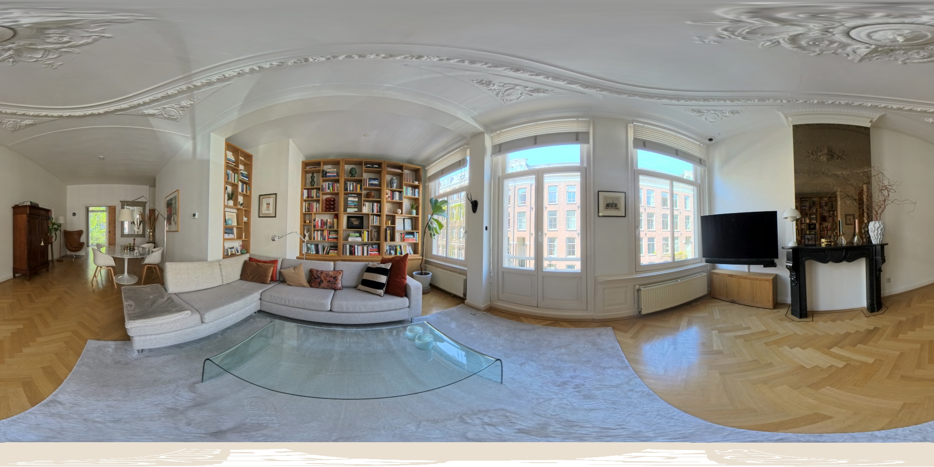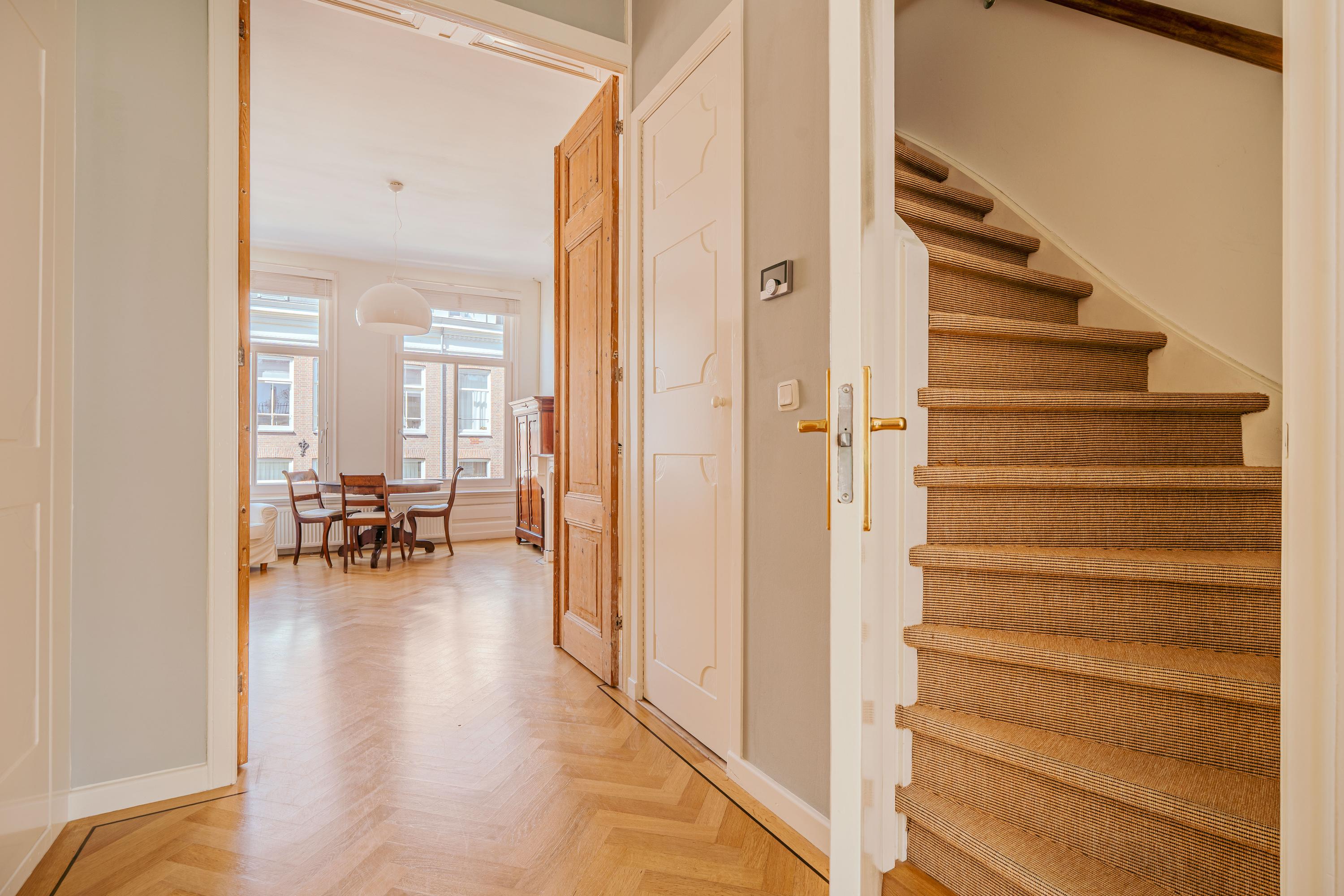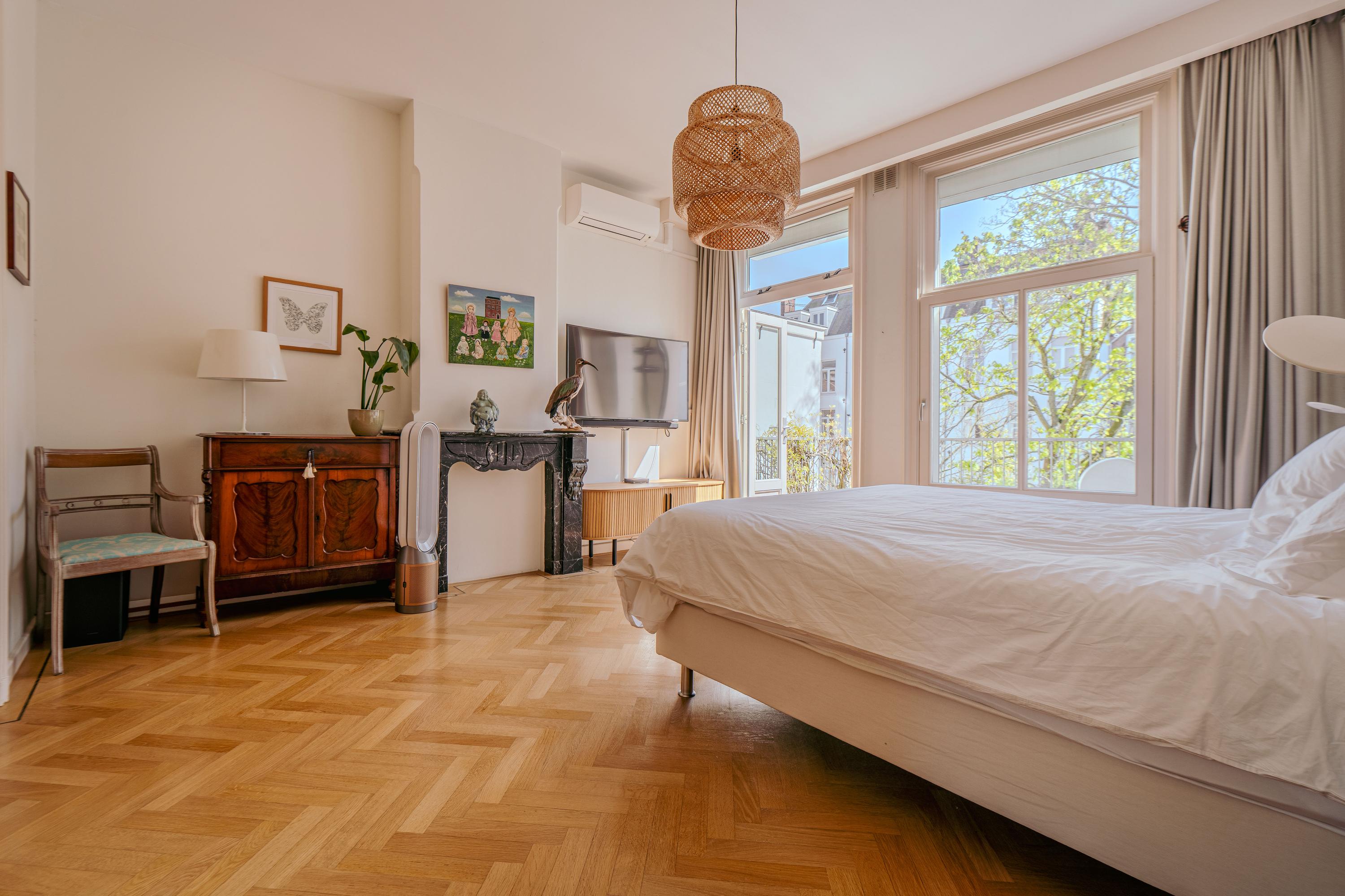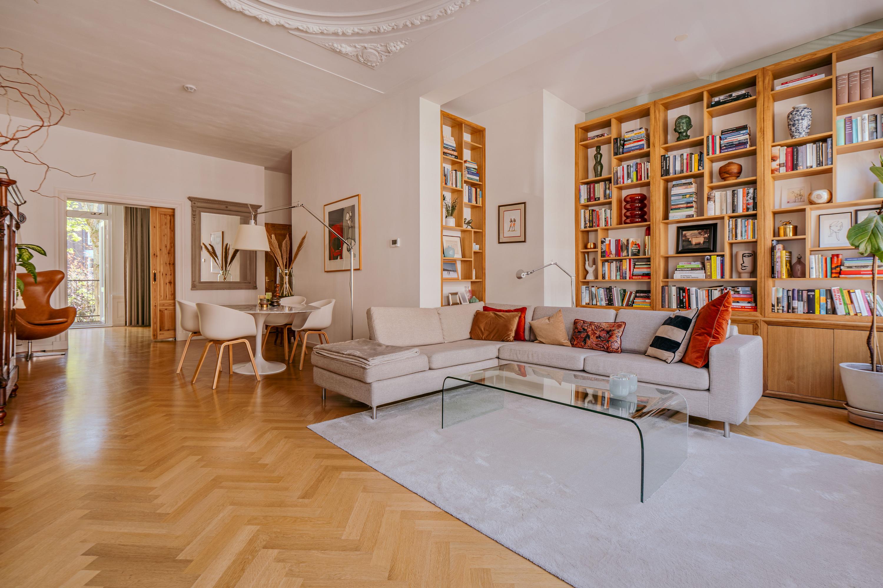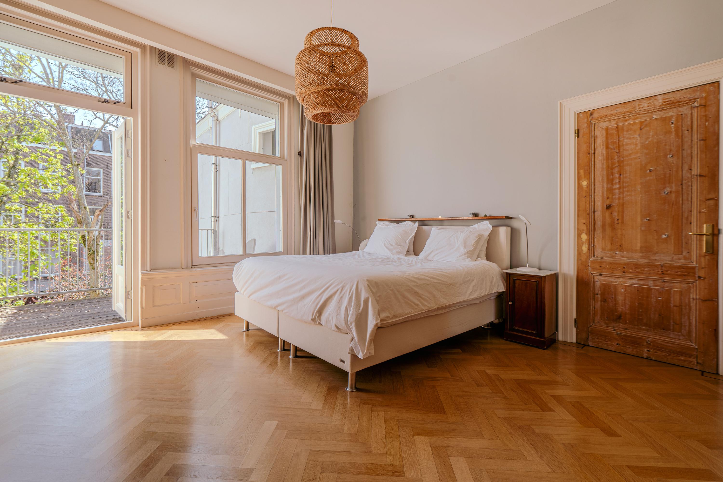 Vanuit de uitgestrekte hal heeft u toegang tot de royale woonkamer, gelegen aan de voorzijde van het appartement. De woonkamer beschikt over hoge plafonds met fraaie details en grote raampartijen, de eerste slaapkamer bevindt zich en-suite. Middels ingebouwde schuifdeuren bereikt u vanuit de woonkamer deze slaapkamer, gelegen aan de achterzijde van de woning. Deze slaapkamer biedt tevens toegang tot het diepe balkon van circa 7 m², gelegen op het zuid oosten. De keuken bevindt zich evenals aan de achterzijde en beschikt over luxe inbouwapparatuur zoals een 5-pits gasfornuis met afzuiger en een brede oven, een koel- en vriescombinatie en een vaatwasser. Aan de gehele achterzijde van het appartement beschikt u over elektrische rolluiken. Naast de keuken treft u nog een separaat toilet met fontein en een handige berging.