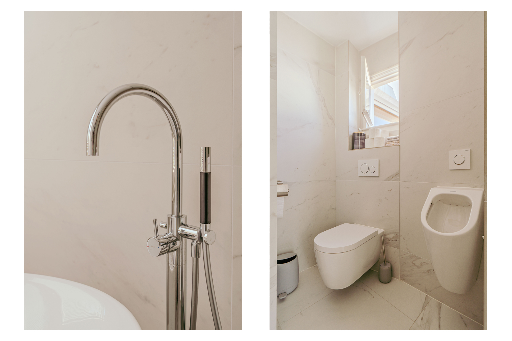 Een trap naar boven leidt u naar de overloop op de tweede verdieping. Aan de voorzijde van de tweede verdieping bevindt zich de tweede goed bemeten slaapkamer, welke is voorzien van praktische inbouwkasten en een airco-installatie. Tevens biedt deze slaapkamer toegang tot de riante inloopkast van ca. 9 m², evenals gelegen aan de voorzijde van het appartement en bereikbaar via de centrale overloop. Aan de achterzijde bevindt zich de master bedroom voorzien van openslaande deuren richting het heerlijke balkon, gelegen op het zuid oosten. Vanuit de slaapkamer treft u via de overloop de verhoogde badkamer aan de achterzijde. De badkamer beschikt over een ruim ligbad, inloopdouche, dubbele wastafel met meubel, een toilet, urinoir en aansluitingen voor wasmachine en droger. Deze verdieping beschikt aan de achterzijde tevens over elektrische rolluiken. De twee slaapkamers op deze verdieping zijn verbonden middels een centrale overloop voorzien van ruime ingebouwde kasten. Een tweede trap op deze verdieping brengt u naar de derde verdieping, tevens de bovenste verdieping van het appartement.