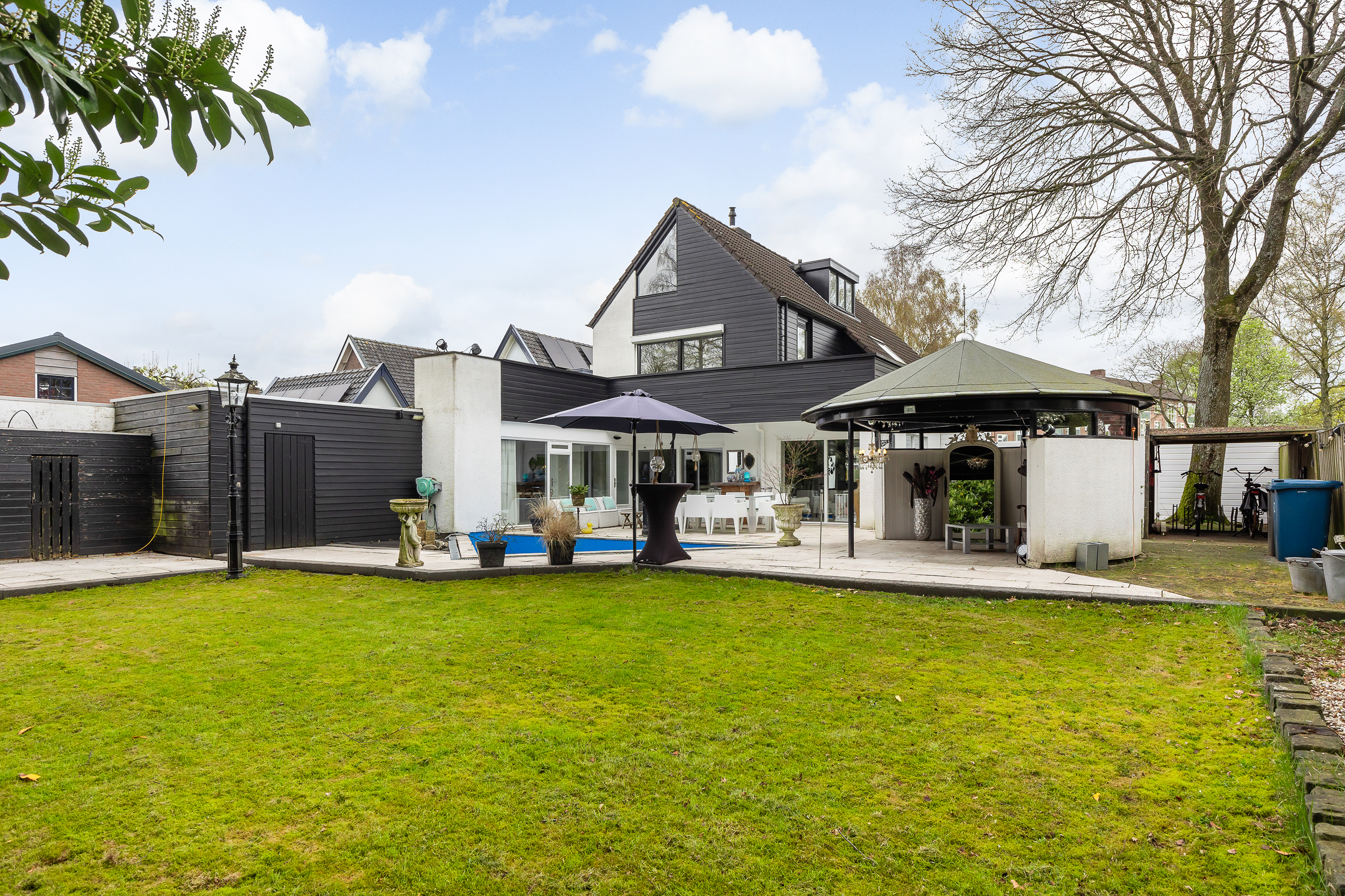 De tuin is één van de grote troeven van deze woning. Met een ligging op het zuiden en grenzend aan een gemeentelijke groenstrook met vijverpartij biedt de achtertuin rust, privacy en de hele dag zon. Het grote terras sluit aan op een sfeervol prieel met loungegedeelte. Daarnaast is er een speels vliegervormig zwembad, een barbecuehoek en een ruime houten berging. Dankzij het onderhoudsvriendelijke ontwerp is de tuin eenvoudig in te richten en te onderhouden.