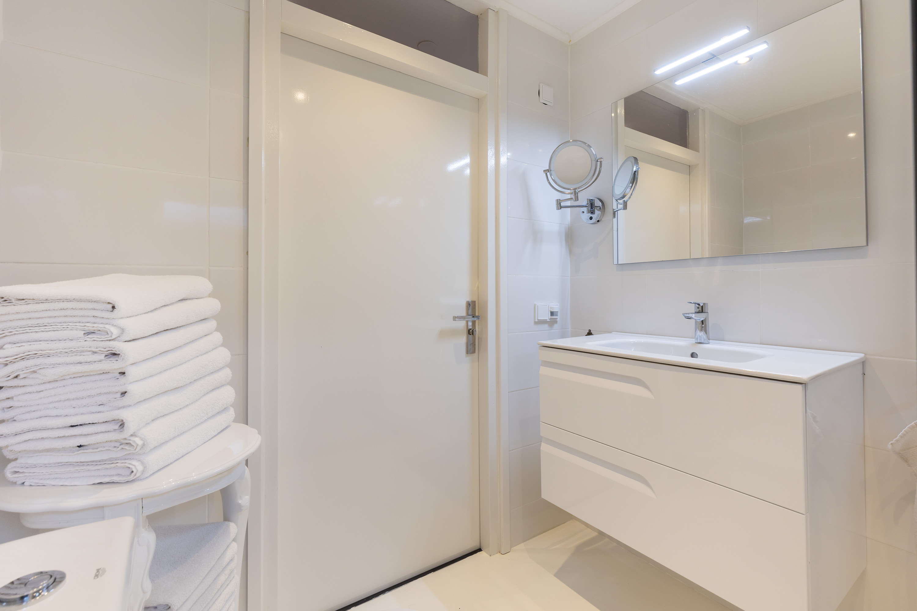 De tweede badkamer is recent vernieuwd (2023) en beschikt over een inloopdouche, wastafelmeubel, toilet en vloerverwarming. Twee slaapkamers aan de voorzijde hebben toegang tot het balkon boven de erker. De vierde slaapkamer is momenteel ingericht als kleedruimte.