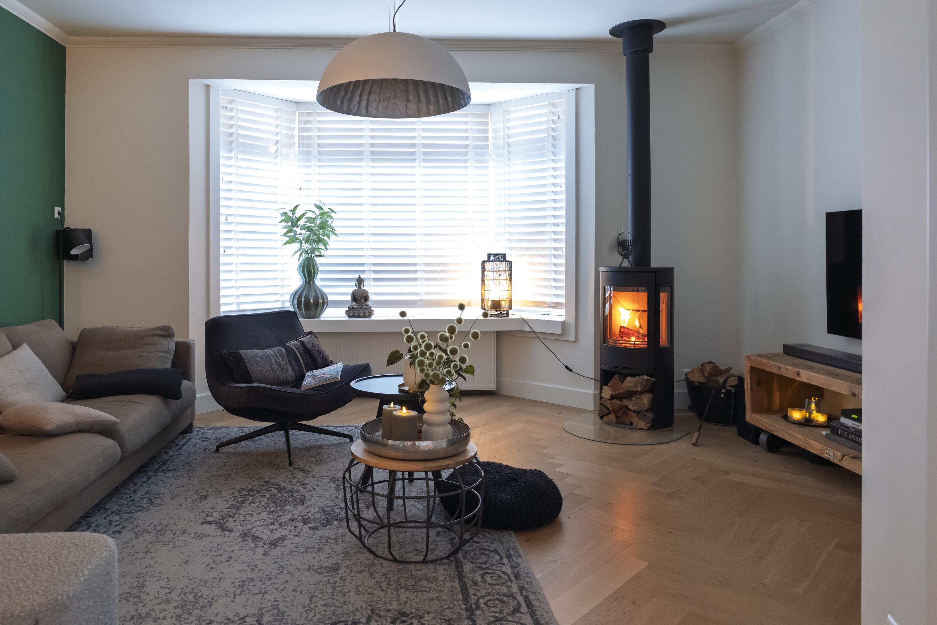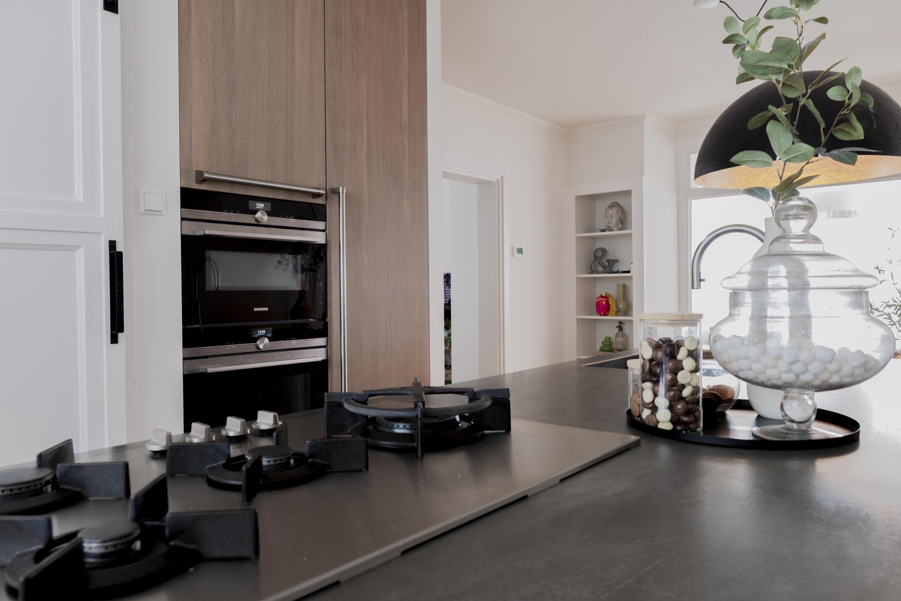 Entree met originele granitovloer, trapopgang, toilet en toegang tot de ruime kelder. De woonkamer met erker en houthaard biedt een fijne, royale leefruimte met volop mogelijkheden voor een comfortabele loungehoek. De luxe woonkeuken vormt het hart van de woning: ruim, licht en stijlvol afgewerkt, met kookeiland en hoogwaardige inbouwapparatuur. Vanuit de keuken is er een prettige verbinding met de entree en met de achtergelegen bijkeuken, inclusief een separate wasruimte.