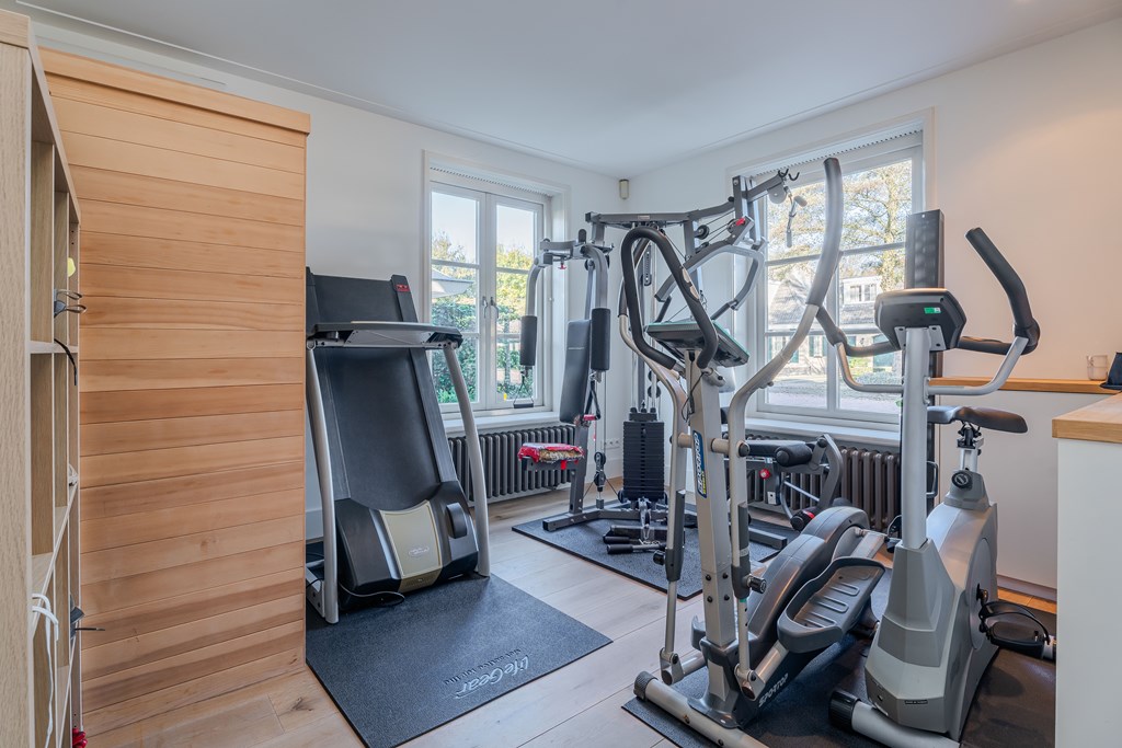 De hobbykamer is gesitueerd aan de voorzijde van het huis en is thans is gebruik als home gym. De kamer is voorzien van een parketvloer en er is langs twee kanten lichtinval.