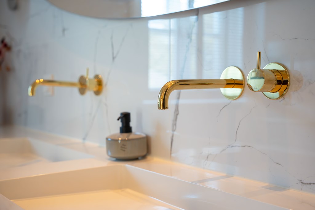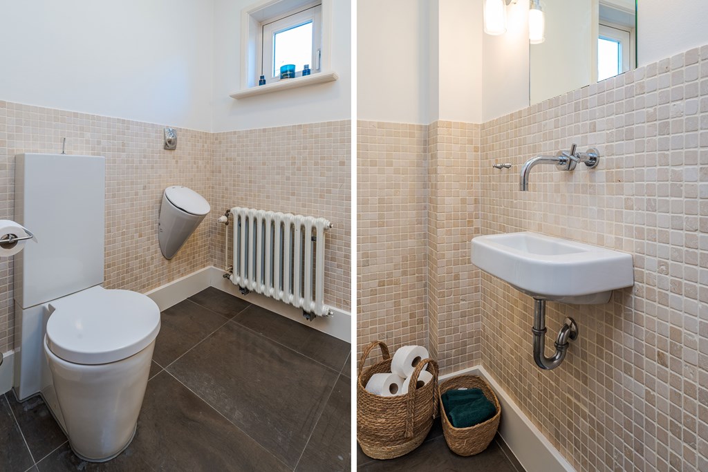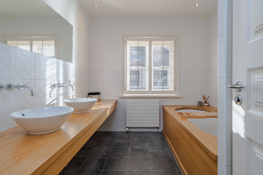 De tweede badkamer is voorzien van een vloertegels, deels betegelde wanden, een inloopdouche, een ligbad en 3 wastafels die geplaatst zijn op kinderhoogte. Op de overloop bevindt zich een separate toiletruimte.