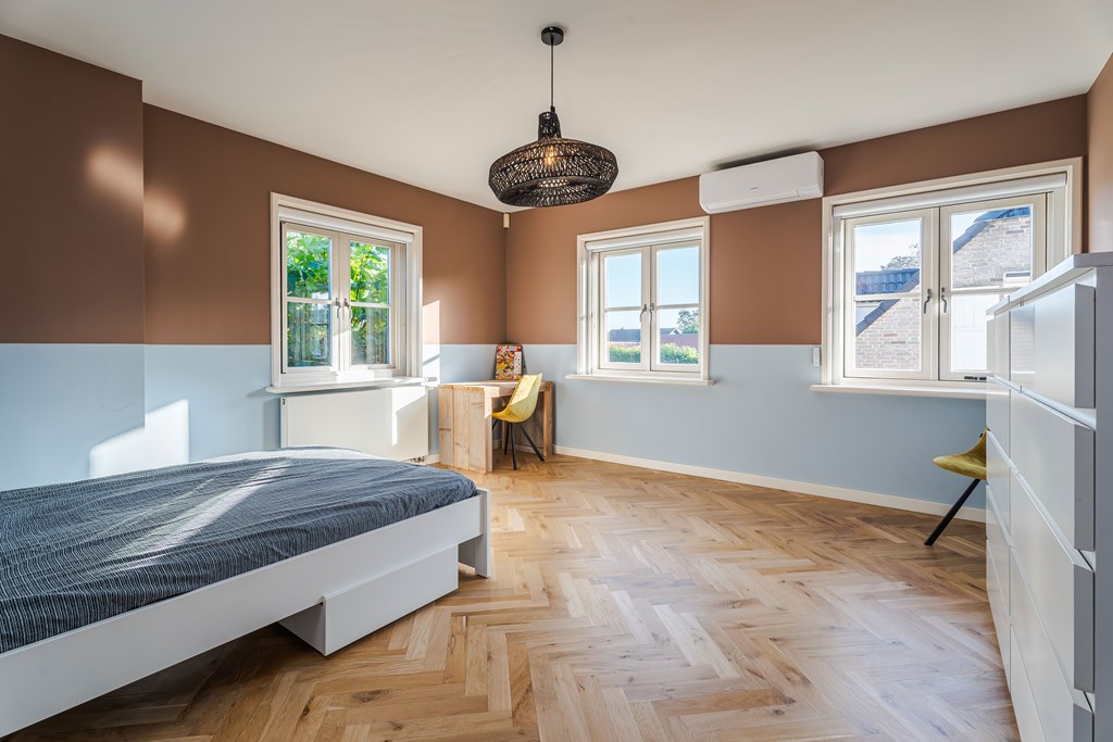 De slaapkamers alsmede de overloop zijn voorzien van dezelfde in visgraat gelegde parketvloer.
