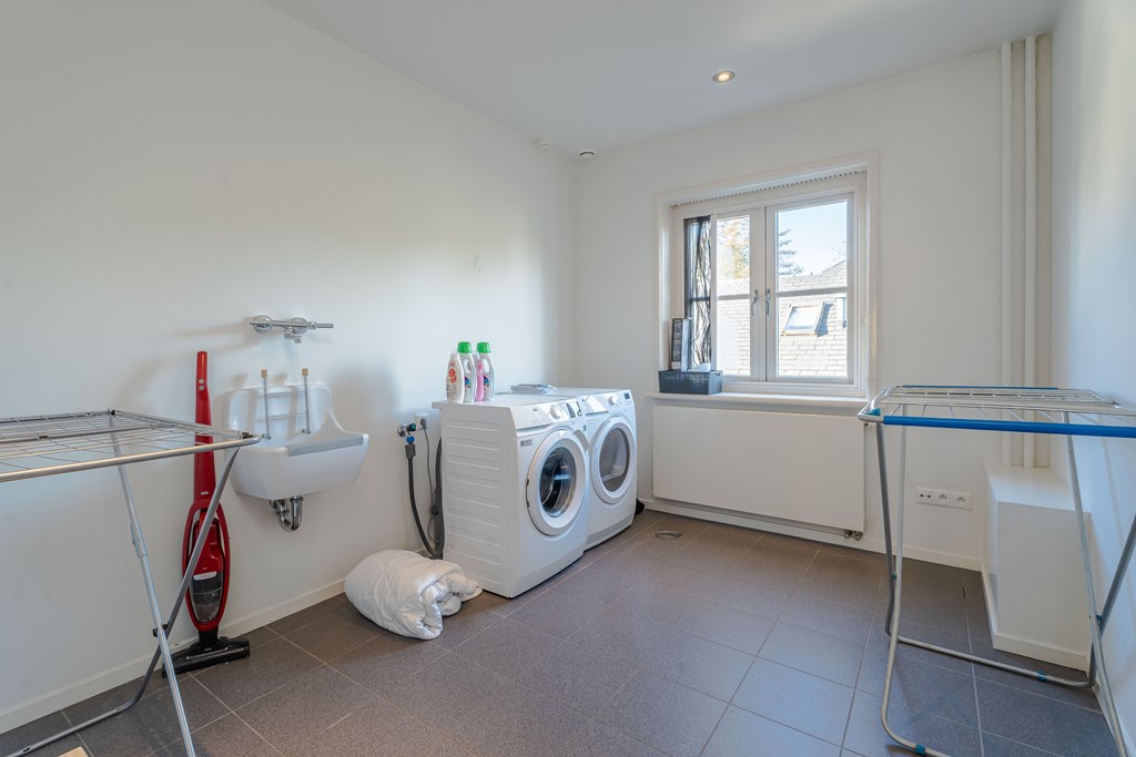 Via de overloop heeft u toegang tot de wasplaats met aansluitingen voor de wasmachine en droogkast en een stortbak. De wasplaats is voorzien van een tegelvloer met afvoerputje en gladde wanden.