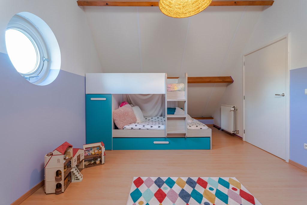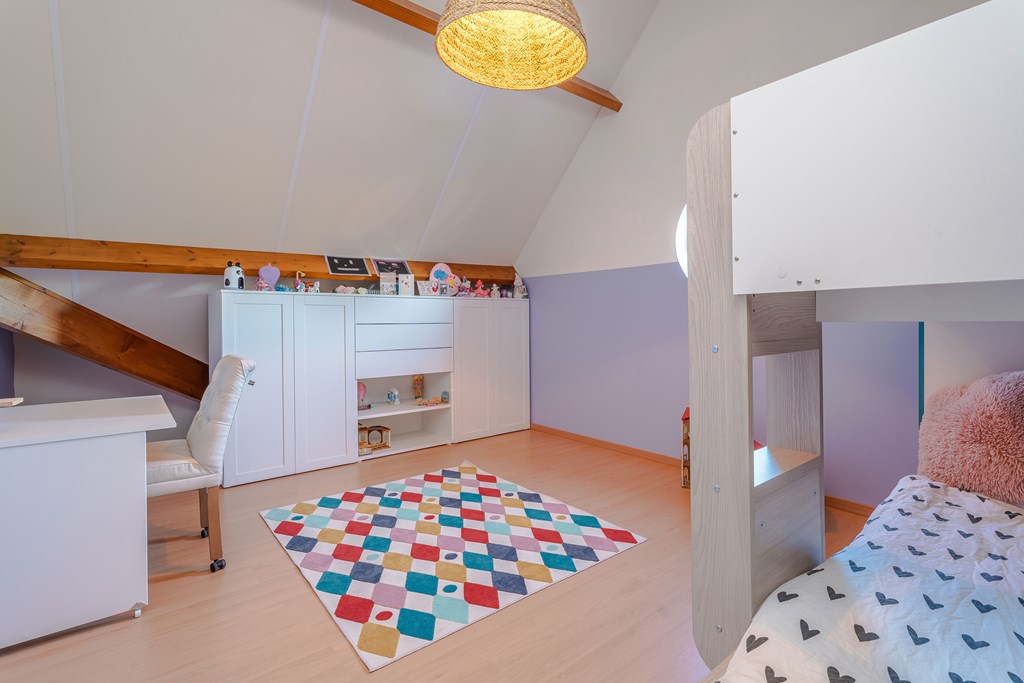 Slaapkamer 5 is gelegen aan de achterzijde van de woning. Deze kamer is gecompartimenteerd in twee ruimtes waardoor je als het ware een leef en slaapgedeelte hebt.