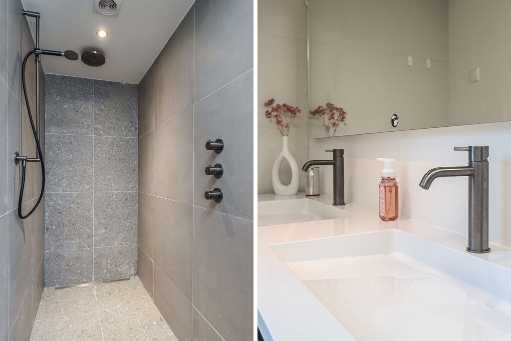 Deze badkamer is voorzien van een vloertegels, deels betegelde wanden, een fijne inloopdouche, twee wastafels met meubel, een wandcloset, inbouwverlichting en mechanische afzuiging.