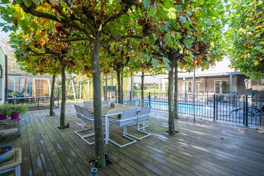 De absolute parel van deze tuin is de bijzonder luxe poolhouse. Dit bijgebouw is werkelijk van alle gemakken voorzien. Zo is er een prachtige leefruimte met een gezellige bar, een derde badkamer met inloopdouche en dubbele wastafel met meubel, een toiletruimte en een technische ruimte t.b.v. de zwembadinstallatie.