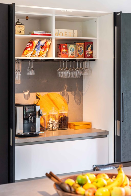 De keuken is voorzien van een modulair BORA systeem met 2 inductie kookplaten, 2 interne afzuigingen en een teppanyaki plaat, een Quooker kraan, 2 koelkasten, een vriezer, een stoomoven, een bakoven, een vaatwasser en een wijnklimaatkast.