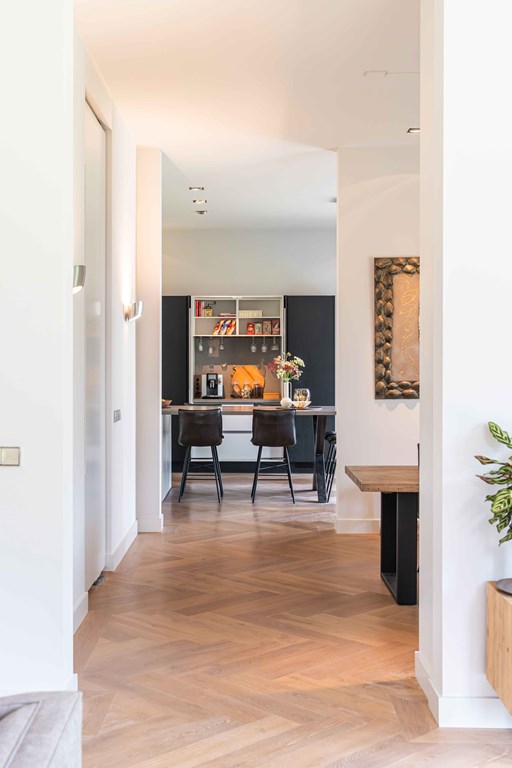 Het kloppende hart van deze woning is uiteraard de prachtige leefkeuken. Vanwege het open karakter van deze ruimte is dit de plek waar u als gezin samen kunt komen. Het grote eiland in het midden is een plek om zowel te koken als te zitten.