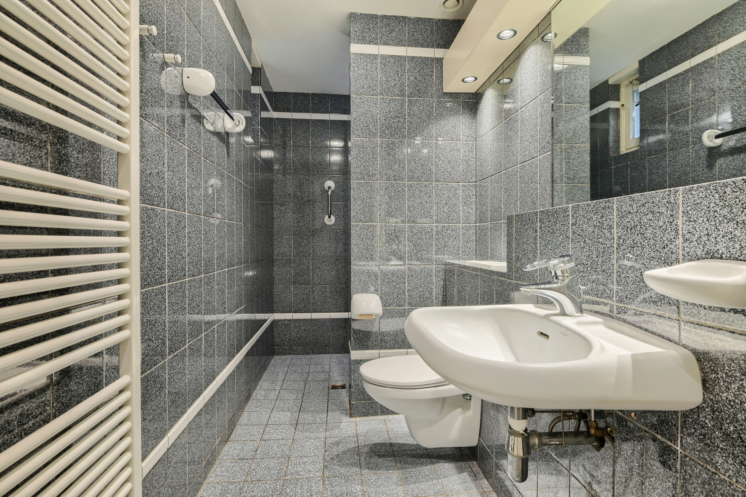 De badkamer is uitgerust met een ligbad, een wandcloset met inbouwreservoir, een urinoir, een bidet, een inloopdouche, een designradiator en een dubbele wastafel, geïntegreerd in een meubel. De badkamer is ook rechtstreeks te betreden vanuit de gang.