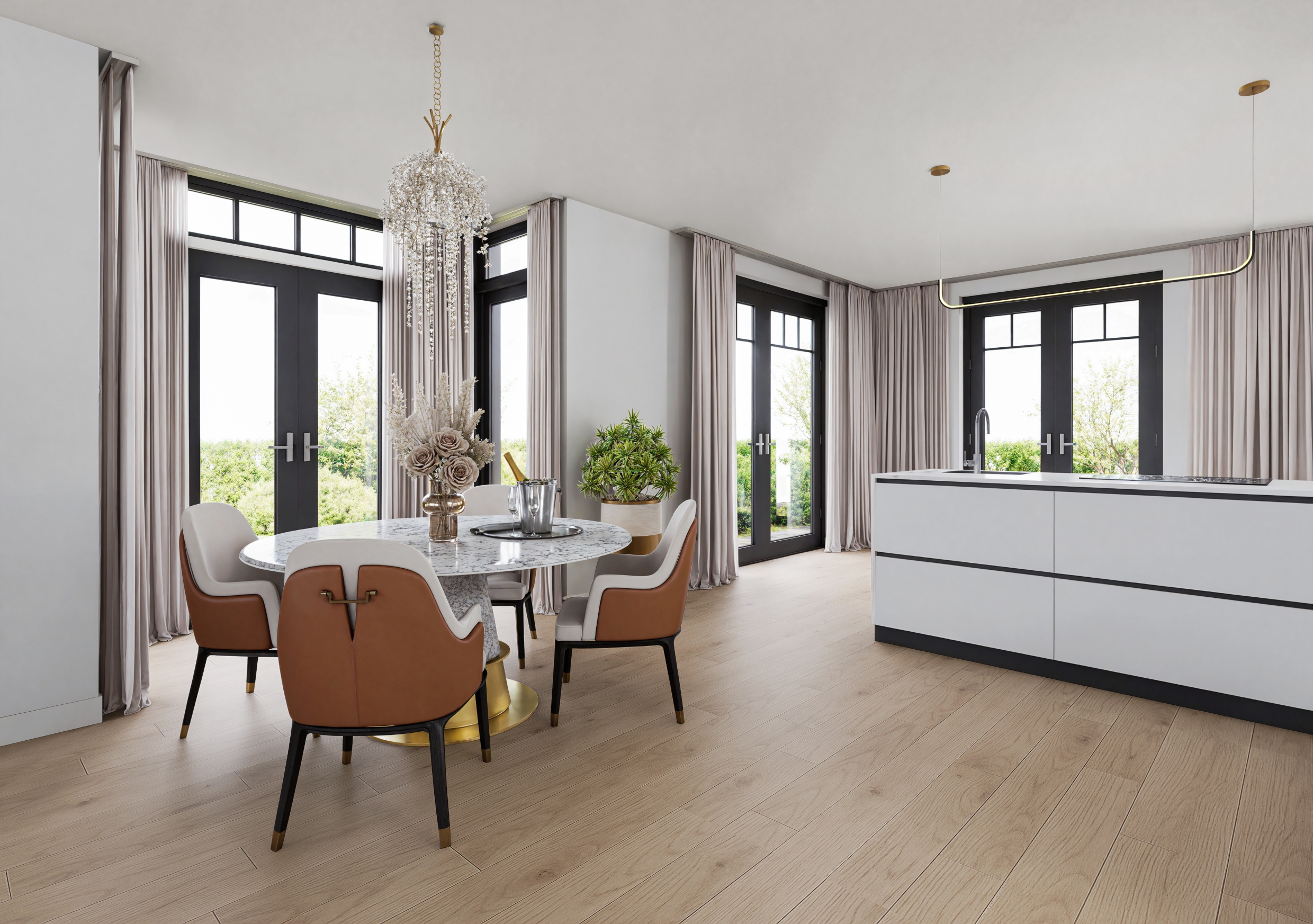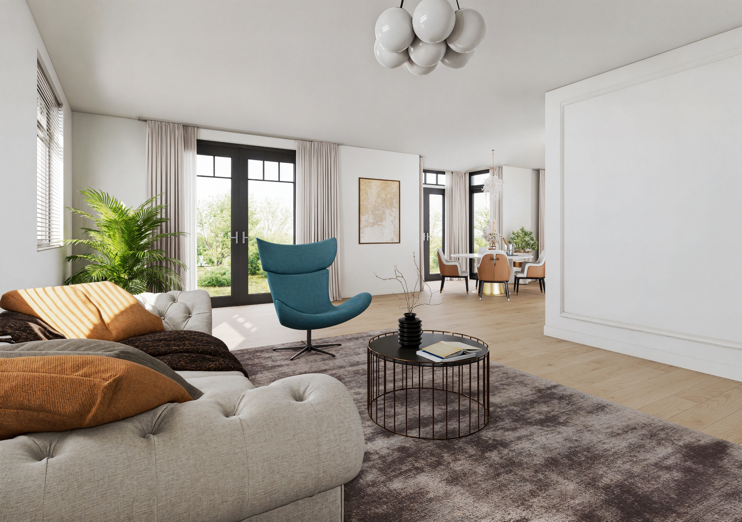 Daarnaast is het mogelijk om het eetkamer-gedeelte uit te bouwen, zoals te zien is op de artist impressions. Met deze uitbouw creëert u niet alleen extra leefruimte, maar ook de mogelijkheid om grotere raampartijen toe te voegen, wat zorgt voor meer daglicht en een nog sterkere verbinding met de tuin.