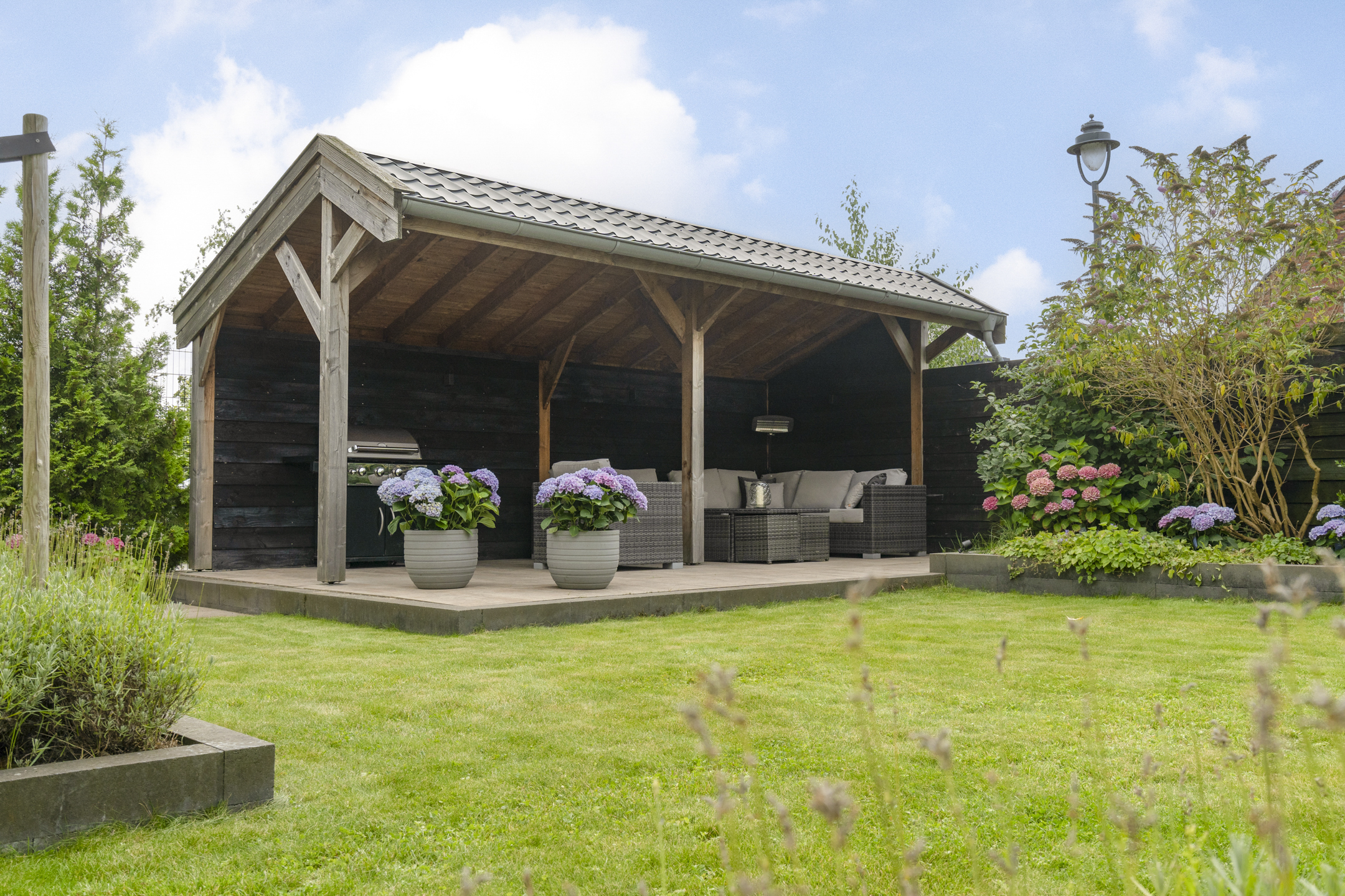 Via meerdere openslaande deuren vanuit de woonkamer heeft u toegang tot de tuin. De fraai aangelegde achtertuin is ingericht met meerder loungeplekjes, een overkapping met heater en toegang tot de garage.