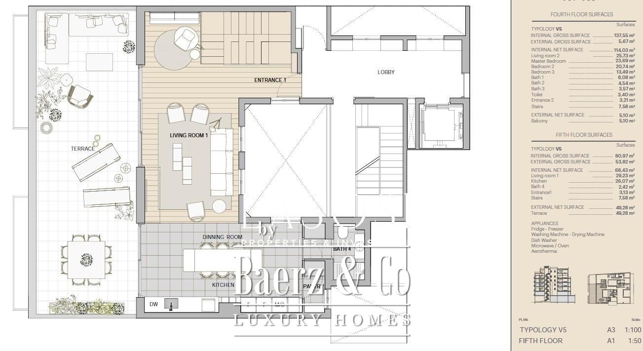 Met drie slaapkamers en vijf badkamers is de indeling geschikt voor zowel privégebruik als stijlvolle ontvangsten. Onberispelijke afwerkingen sluiten naadloos aan op moderne apparatuur, airconditioning, verwarming, video-intercom en praktische gemakken zoals inbouwkasten en een aparte wasruimte.