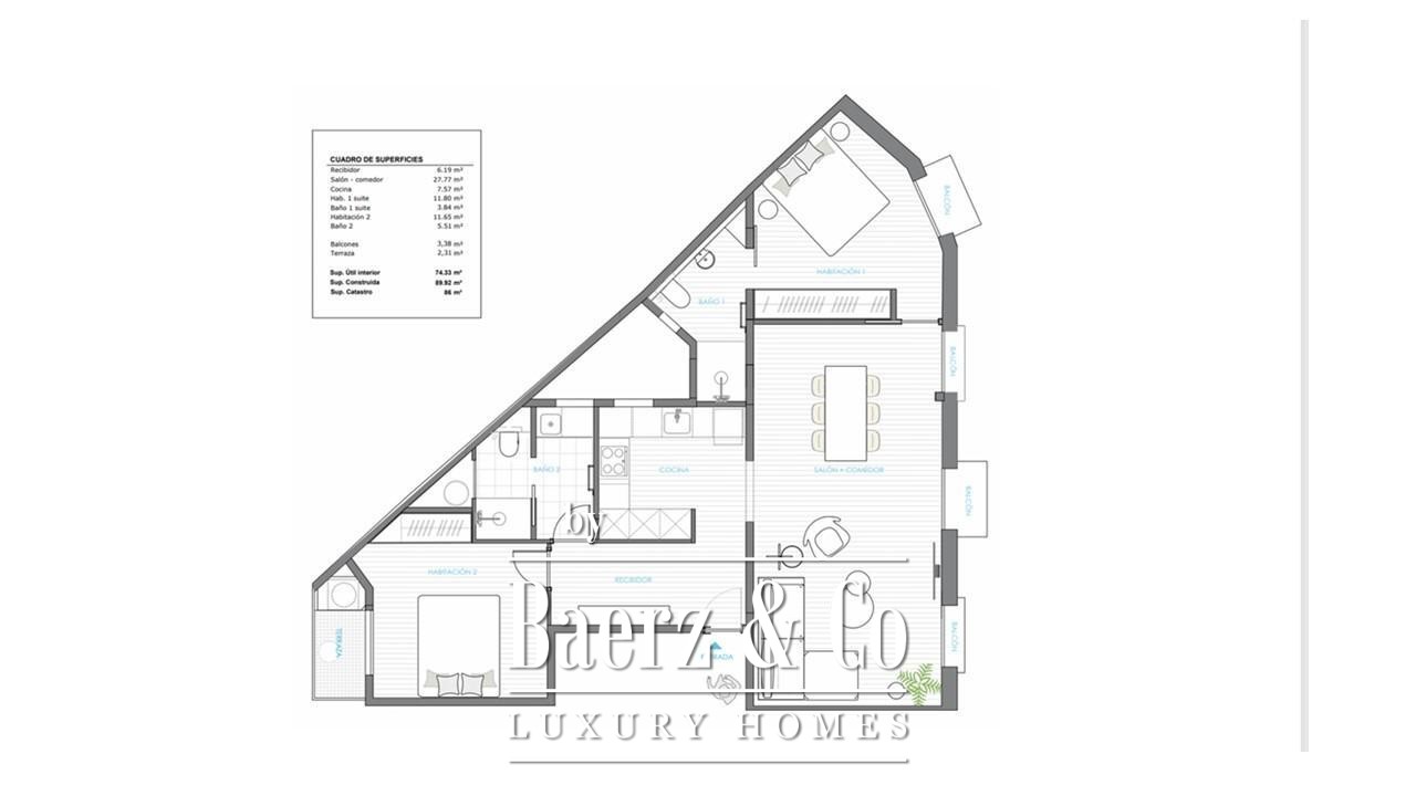 Het open woon- en eetgedeelte is ontworpen voor zowel ontspanning als het ontvangen van gasten, met een volledig uitgeruste keuken die geïntegreerde apparatuur en praktisch ontwerp samenbrengt. In het slaapgedeelte bevinden zich twee tweepersoonsslaapkamers, beide voorzien van veel natuurlijk licht. De master suite beschikt over een eigen badkamer met inloopdouche en stijlvolle voorzieningen, geheel in lijn met de verfijning van het appartement.