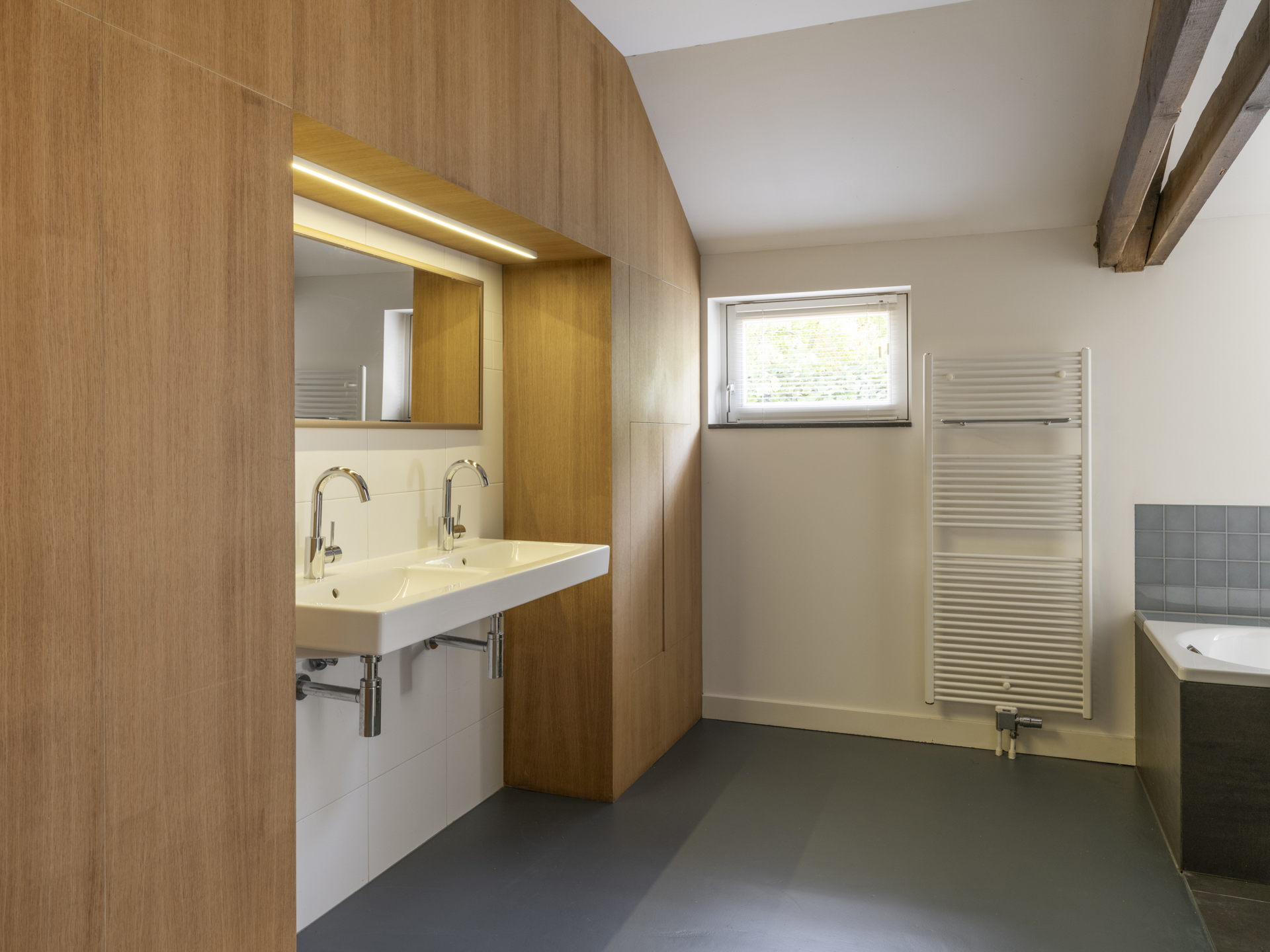 Ruime badkamer met ligbad, inloopdouche, thermostaatkraan, op maat gemaakte wandkast en dubbele wastafel. Dimbare spots verwerkt in de oude balken zorgen voor extra sfeer.