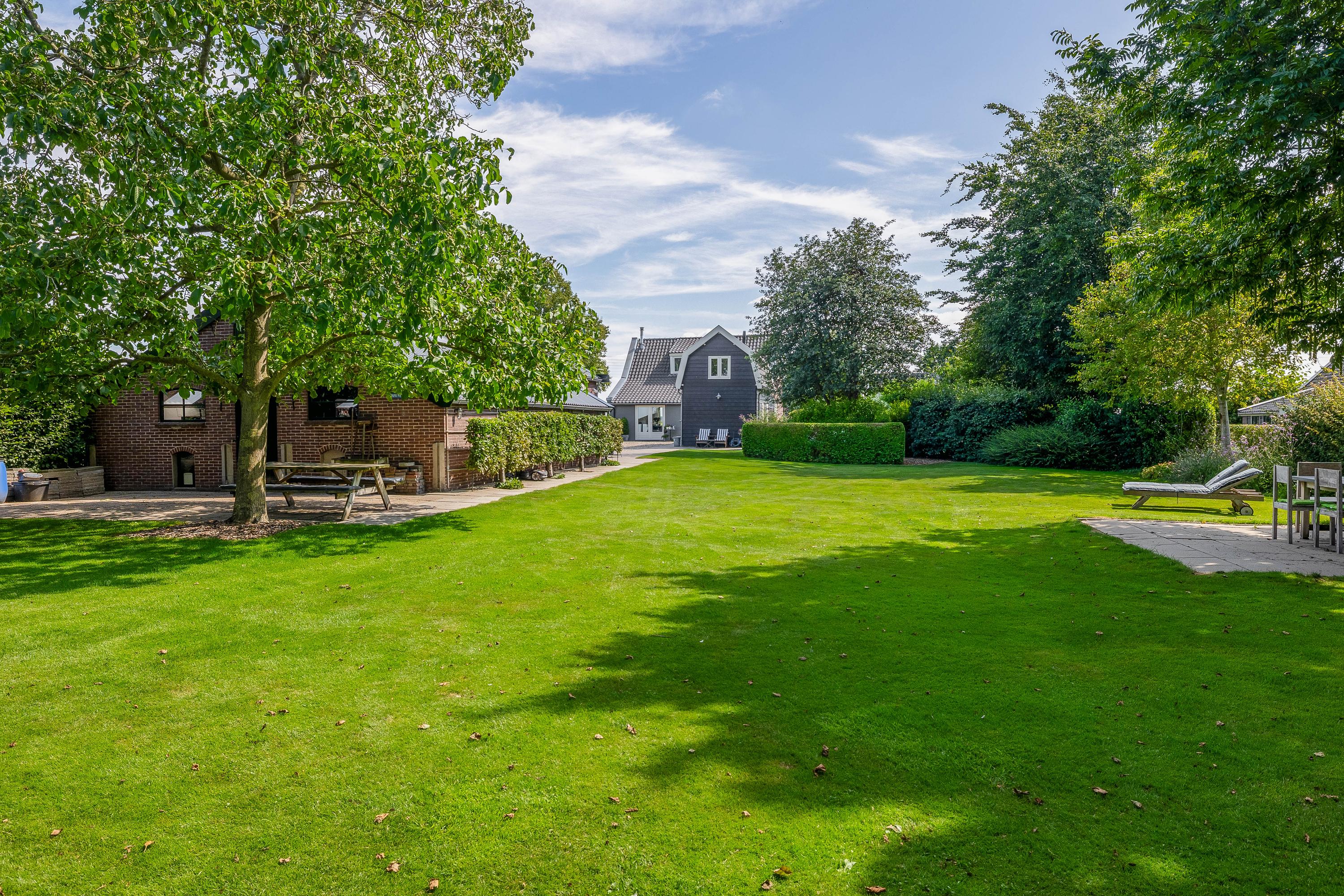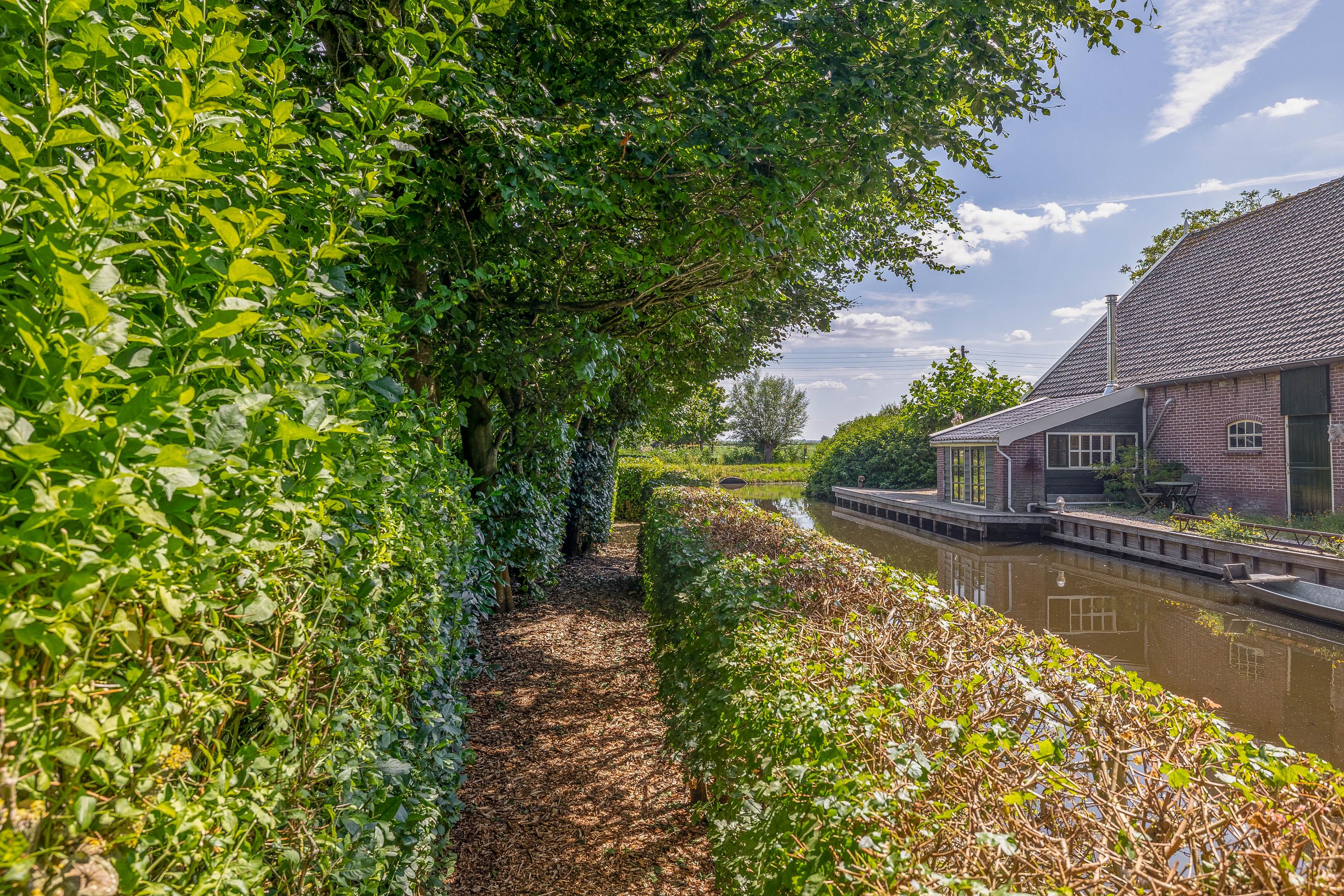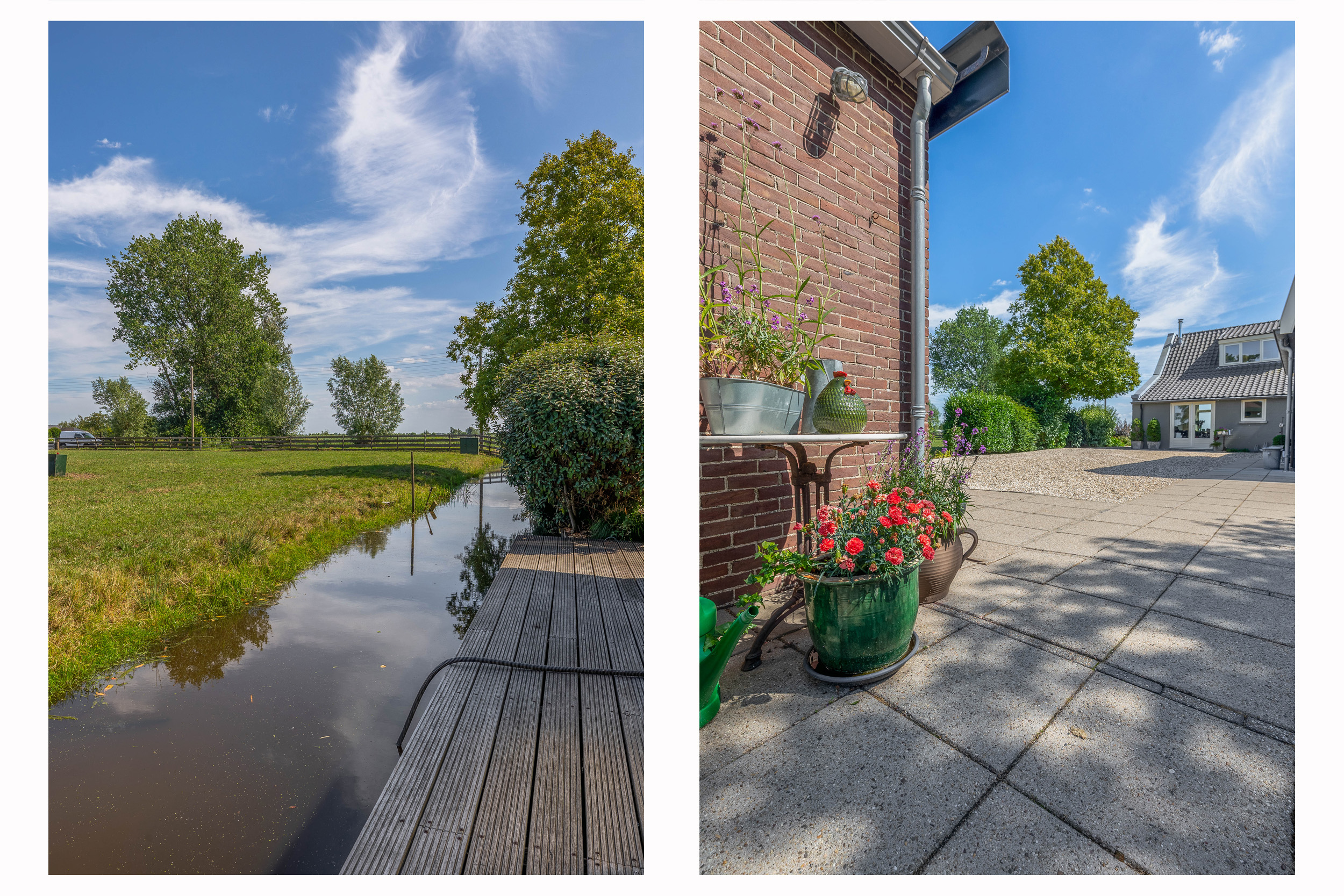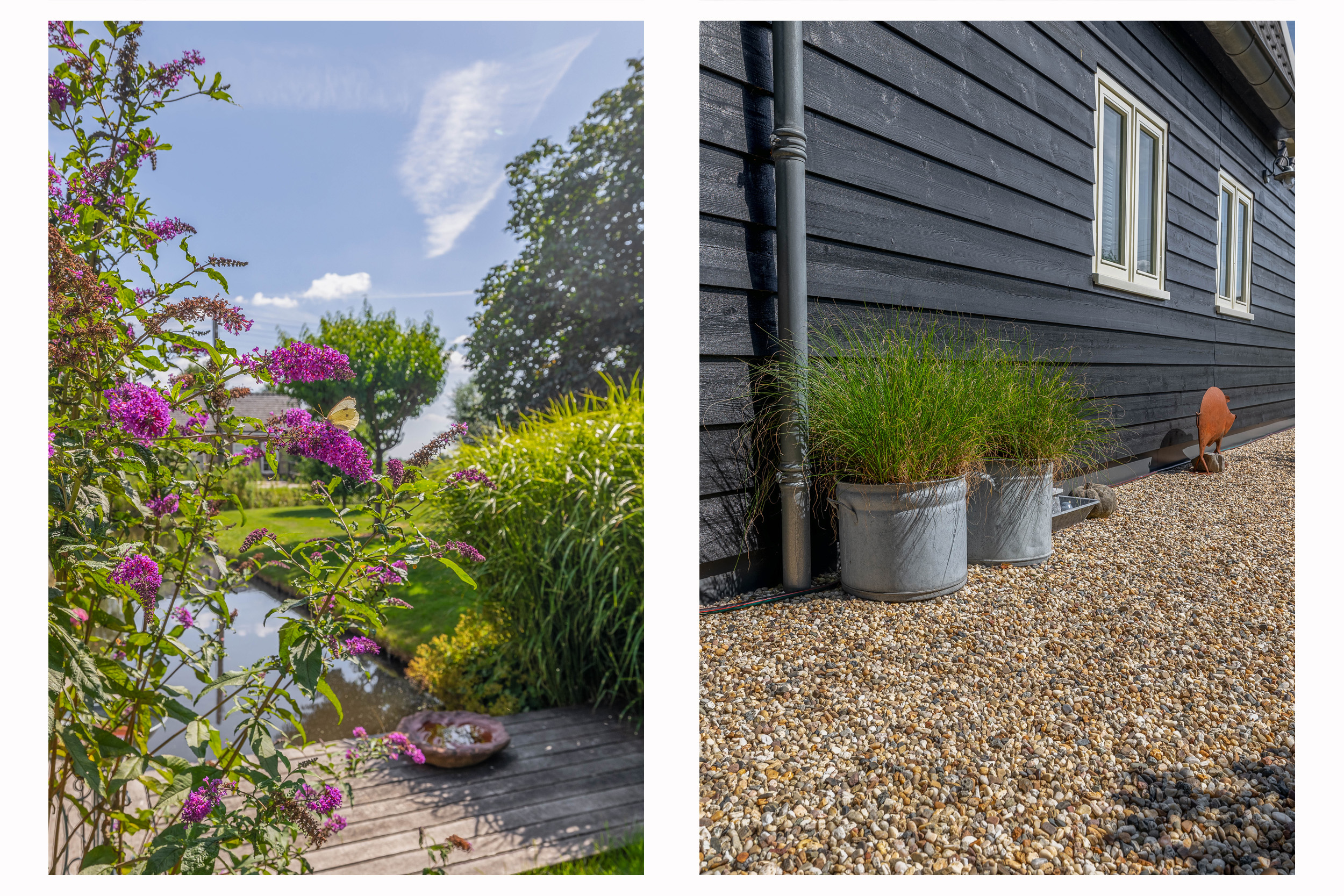 Buiten is het een oase van rust. De tuin rondom is strak, groen en verzorgd aangelegd, met verschillende zitplekken, grote gazons, bomen, borders, moestuin en sfeervolle hoekjes. Dankzij de ligging van het perceel heb je geen directe buren, veel privacy en prachtige uitzichten over water en weiland. Het weiland aan de oostzijde mag niet meer bebouwd worden, waardoor je ook in de toekomst verzekerd bent van vrij uitzicht.