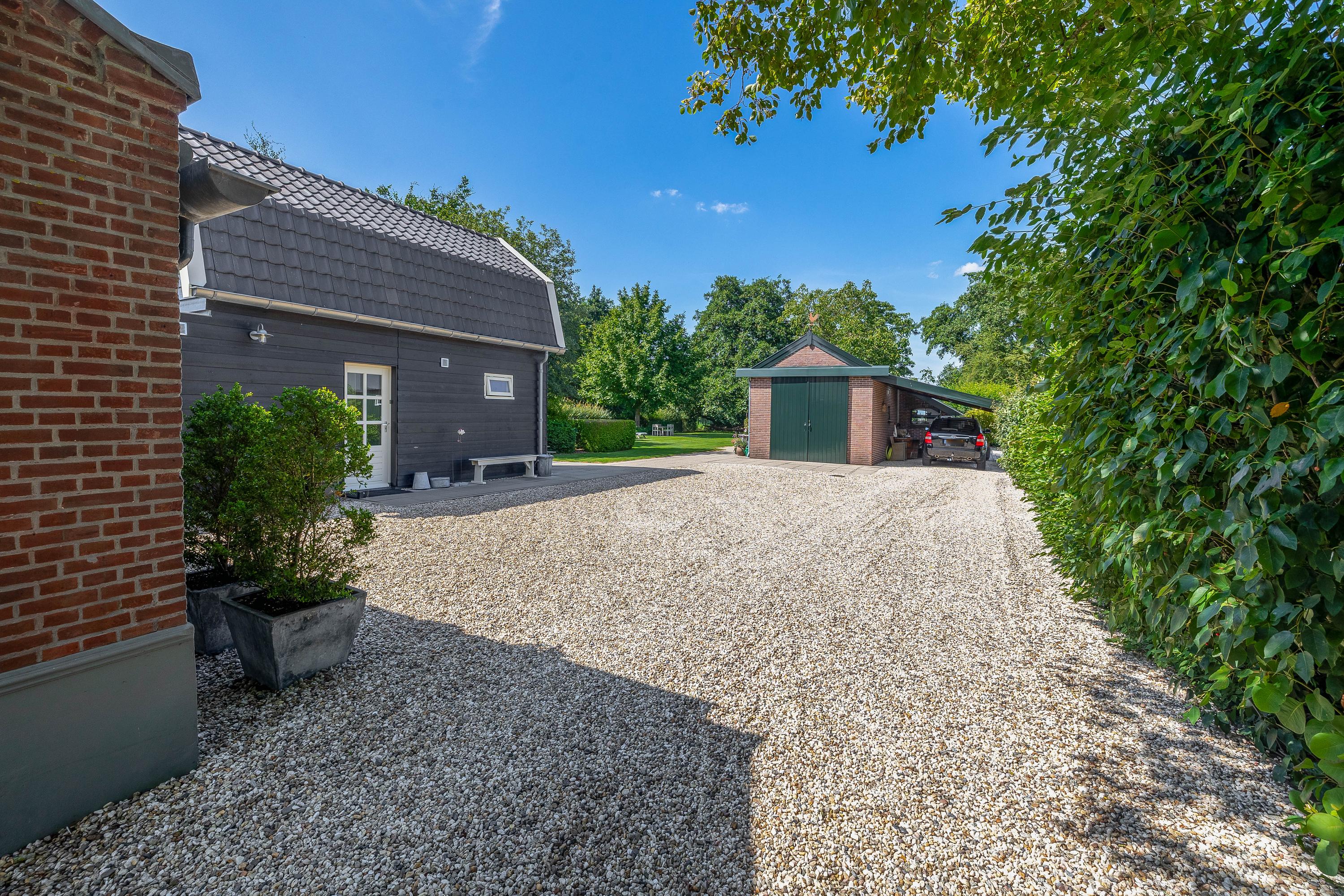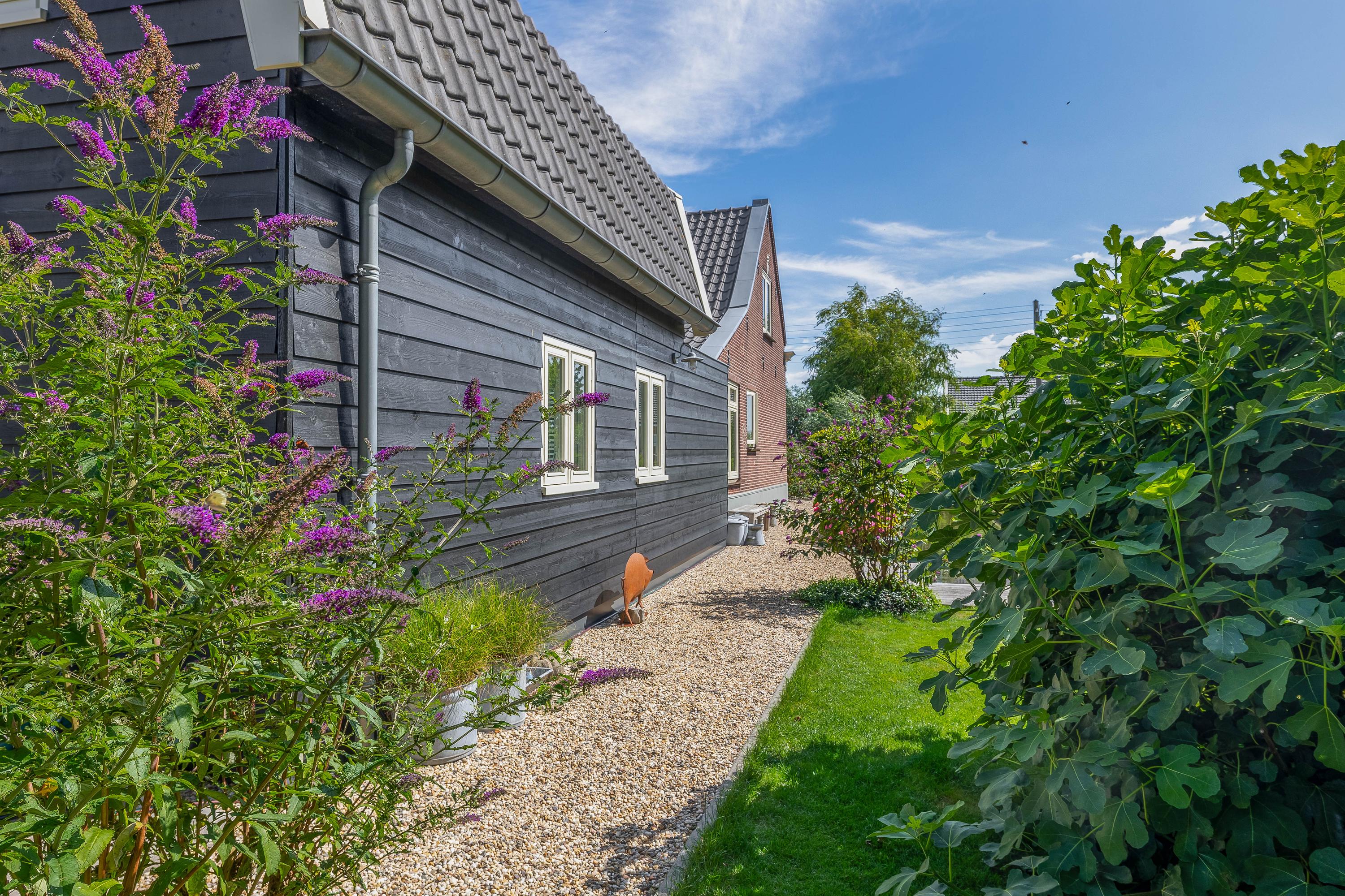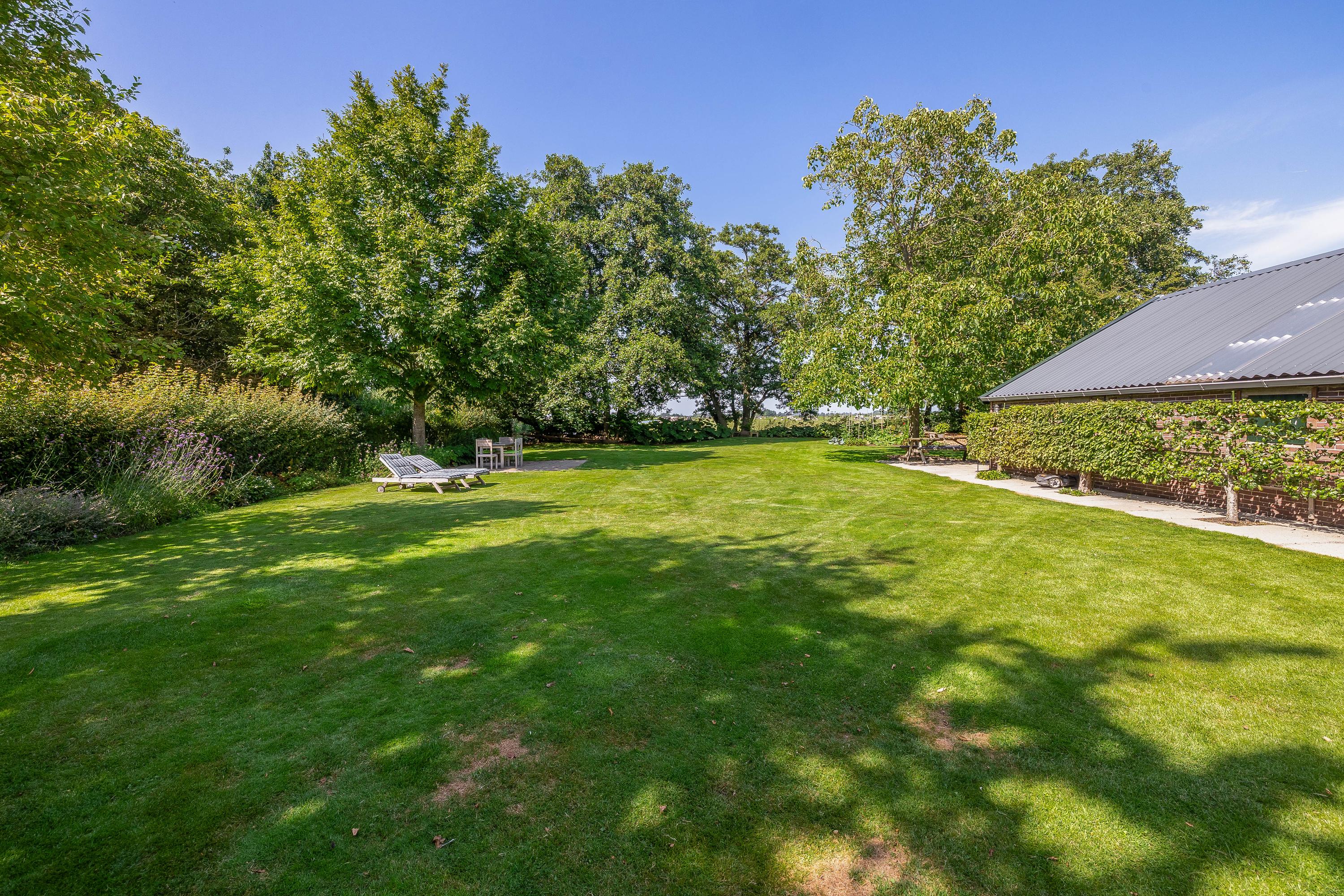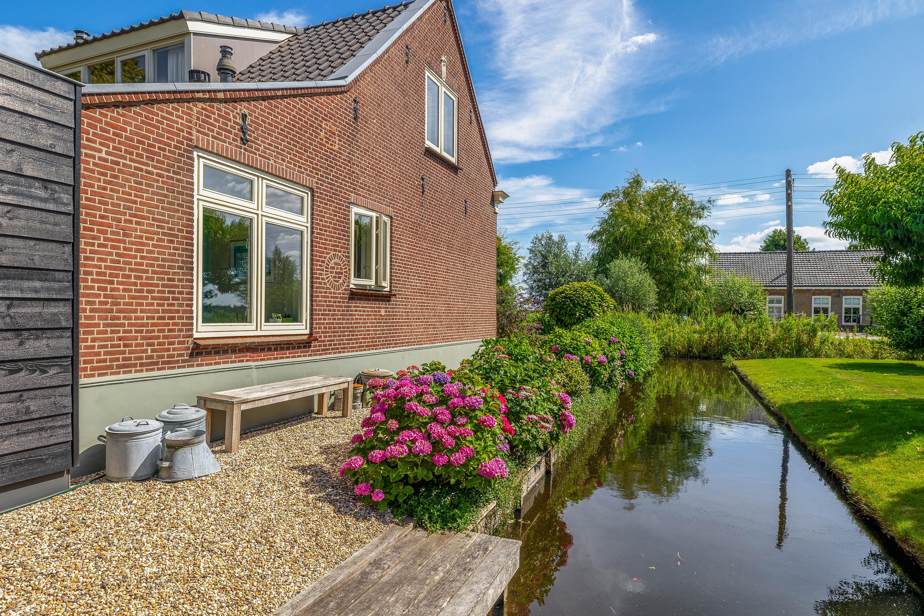 Buiten is het een oase van rust. De tuin rondom is strak, groen en verzorgd aangelegd, met verschillende zitplekken, grote gazons, bomen, borders, moestuin en sfeervolle hoekjes. Dankzij de ligging van het perceel heb je geen directe buren, veel privacy en prachtige uitzichten over water en weiland. Het weiland aan de oostzijde mag niet meer bebouwd worden, waardoor je ook in de toekomst verzekerd bent van vrij uitzicht.