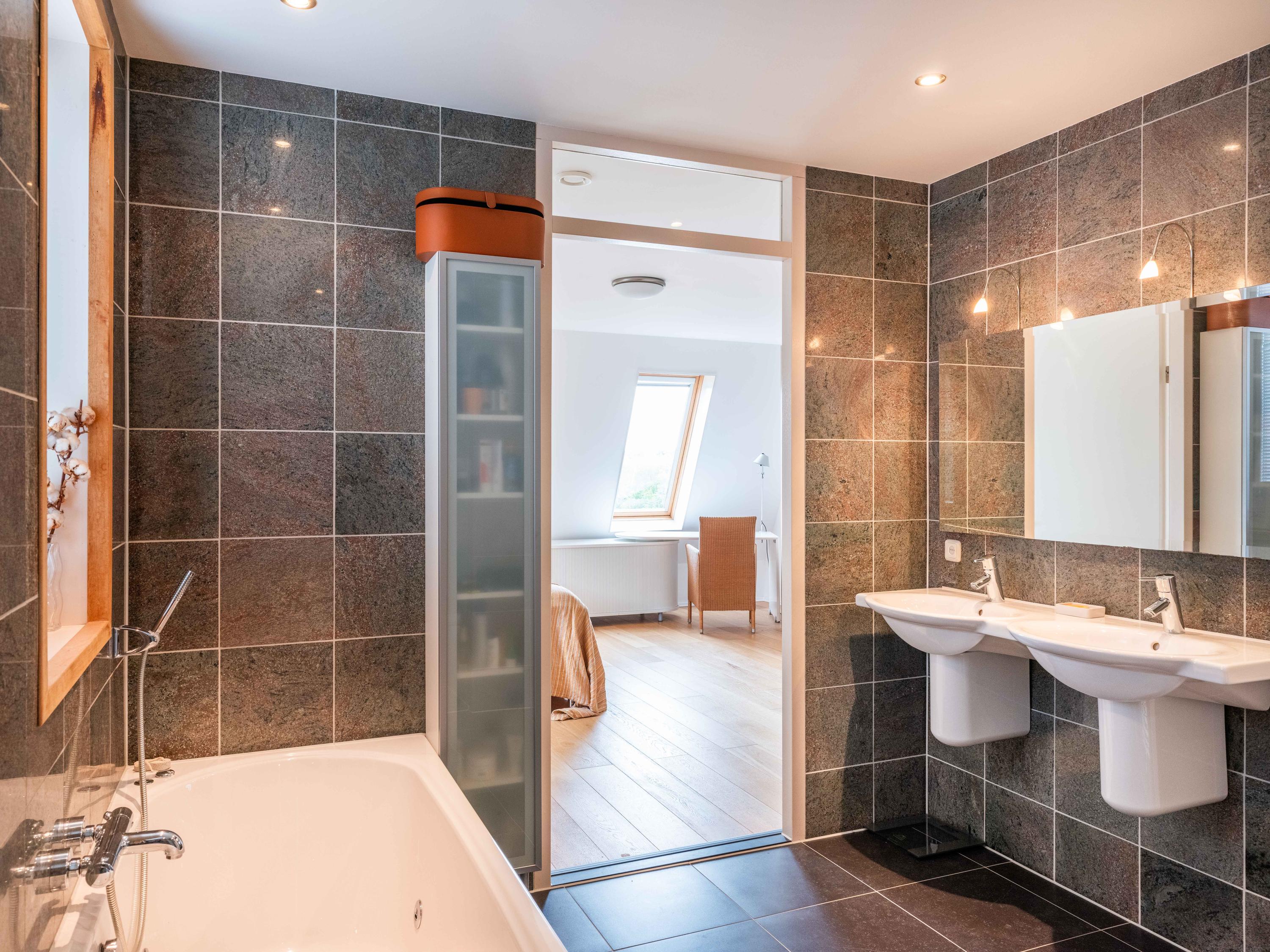 Via de trap komen we op de eerste verdieping, hier bevinden zich twee ruime slaapkamers, beide met vaste kastruimte, en de tweede badkamer. Deze luxe badkamer is uitgerust met een ligbad, dubbele wastafel en een inloopdouche. Vanuit de achterste slaapkamer toegang tot een besloten balkon/terras op het zuiden.
