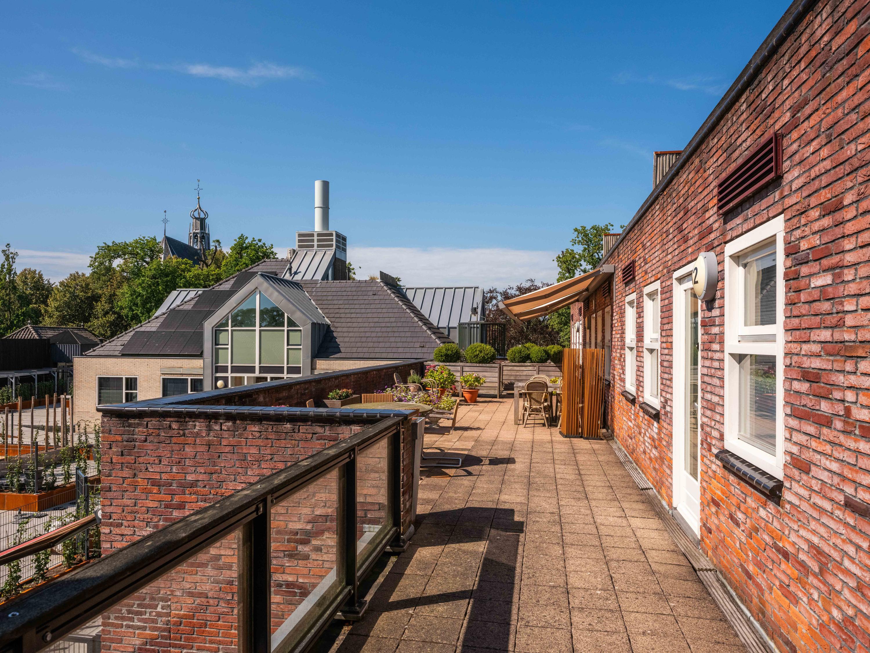Via de centrale entree met trappenhuis en lift bereiken we hier het appartement. Via het ruime dakterras, gelegen op het zuiden, betreden wij via de voordeur het appartement. Bij binnenkomst in het appartement worden we verwelkomd in een ruime en lichte hal, waar voldoende ruimte is voor een garderobe. Hiervandaan toegang tot een slaapkamer, de eerste badkamer en de woonkamer.