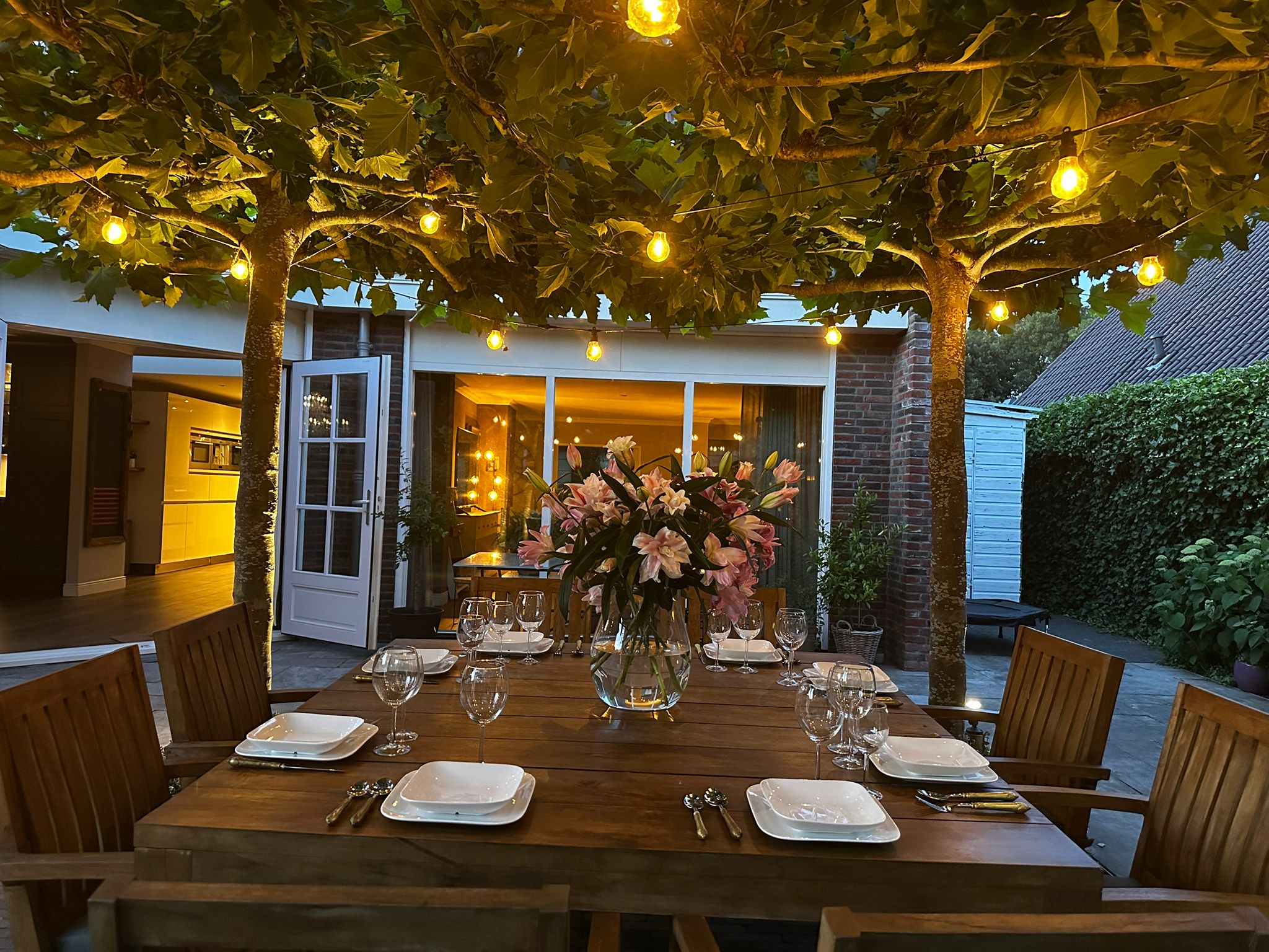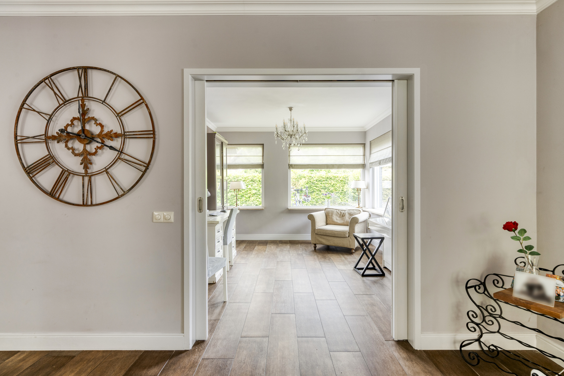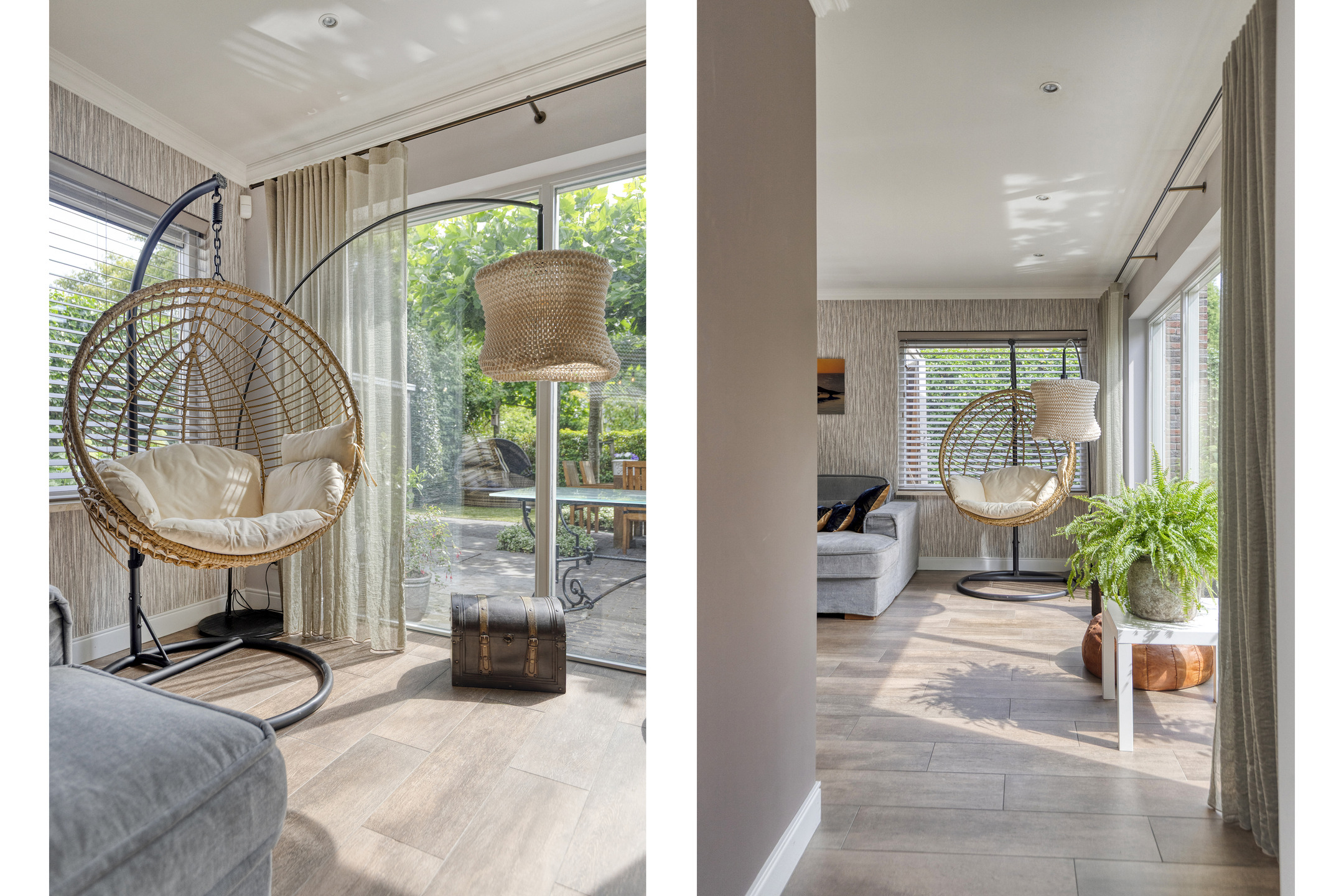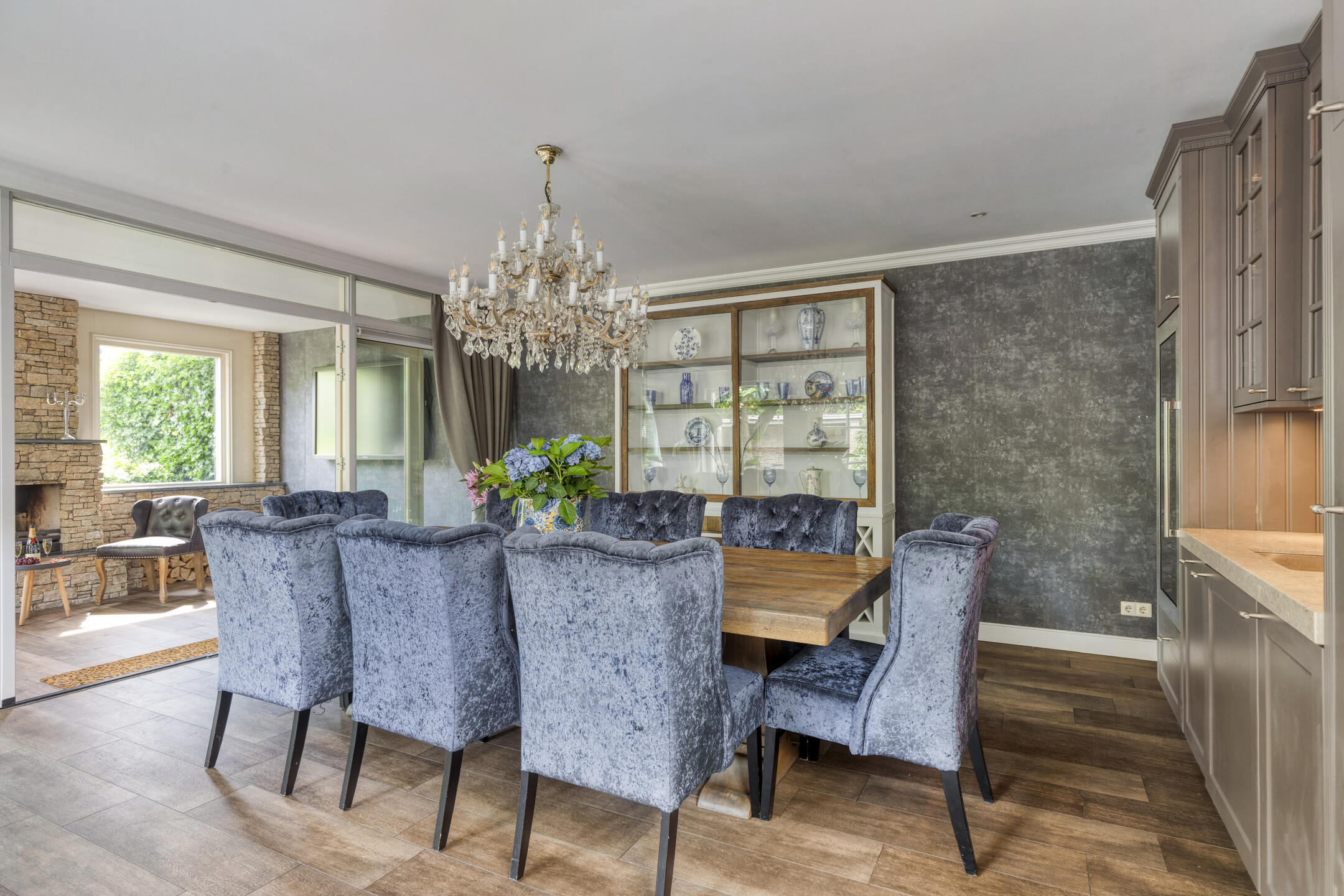In het verlengde van de keuken bevindt zich de eetkamer met een extra keukenblok met onder andere een extra koelkast en een klimaatkast. Vanuit de eetkamer kom je via openslaande deuren in de veranda met openhaard en is er een deur naar de garage. Ook geven de openslaande deuren toegang geven tot de achtertuin.