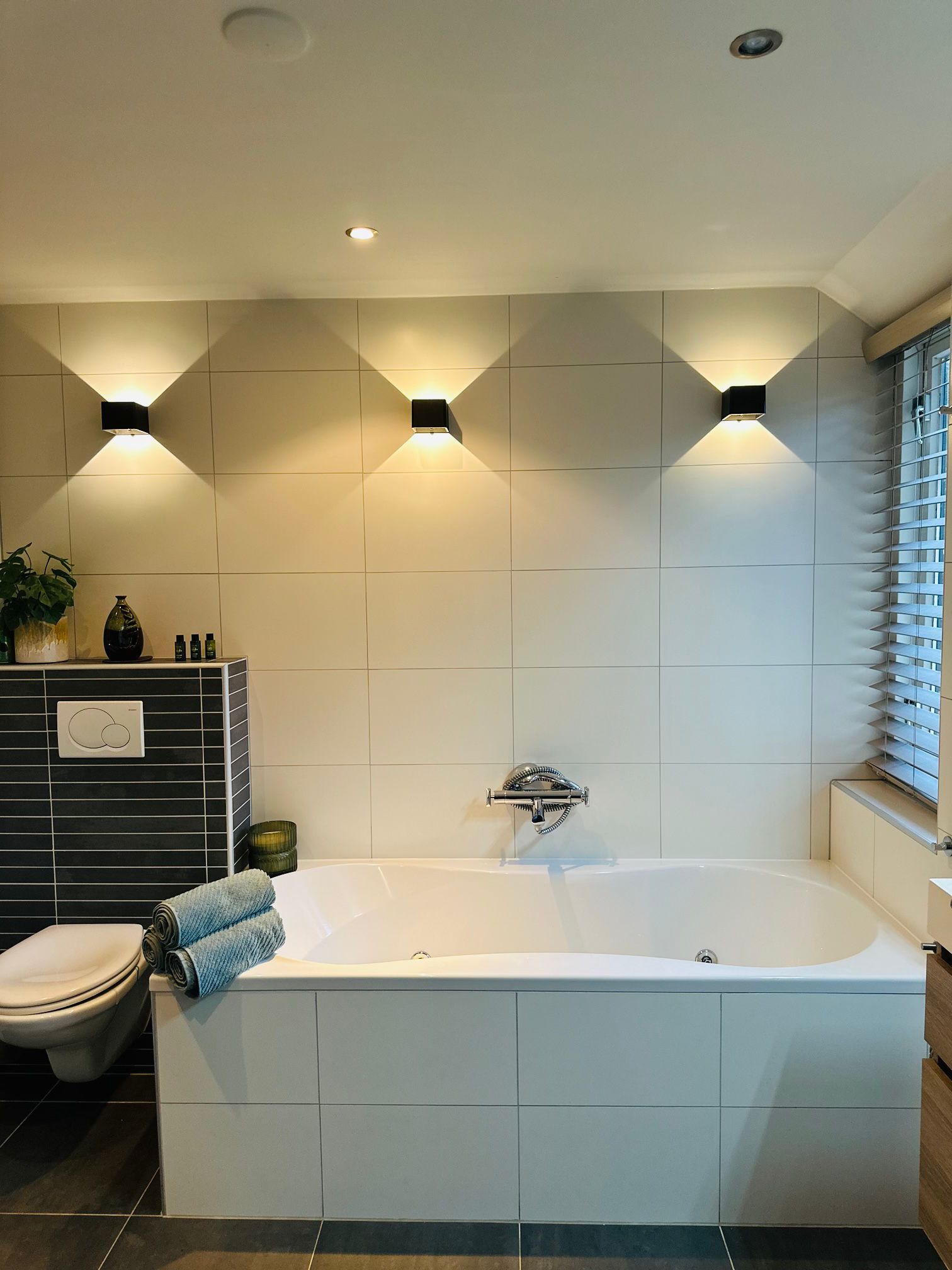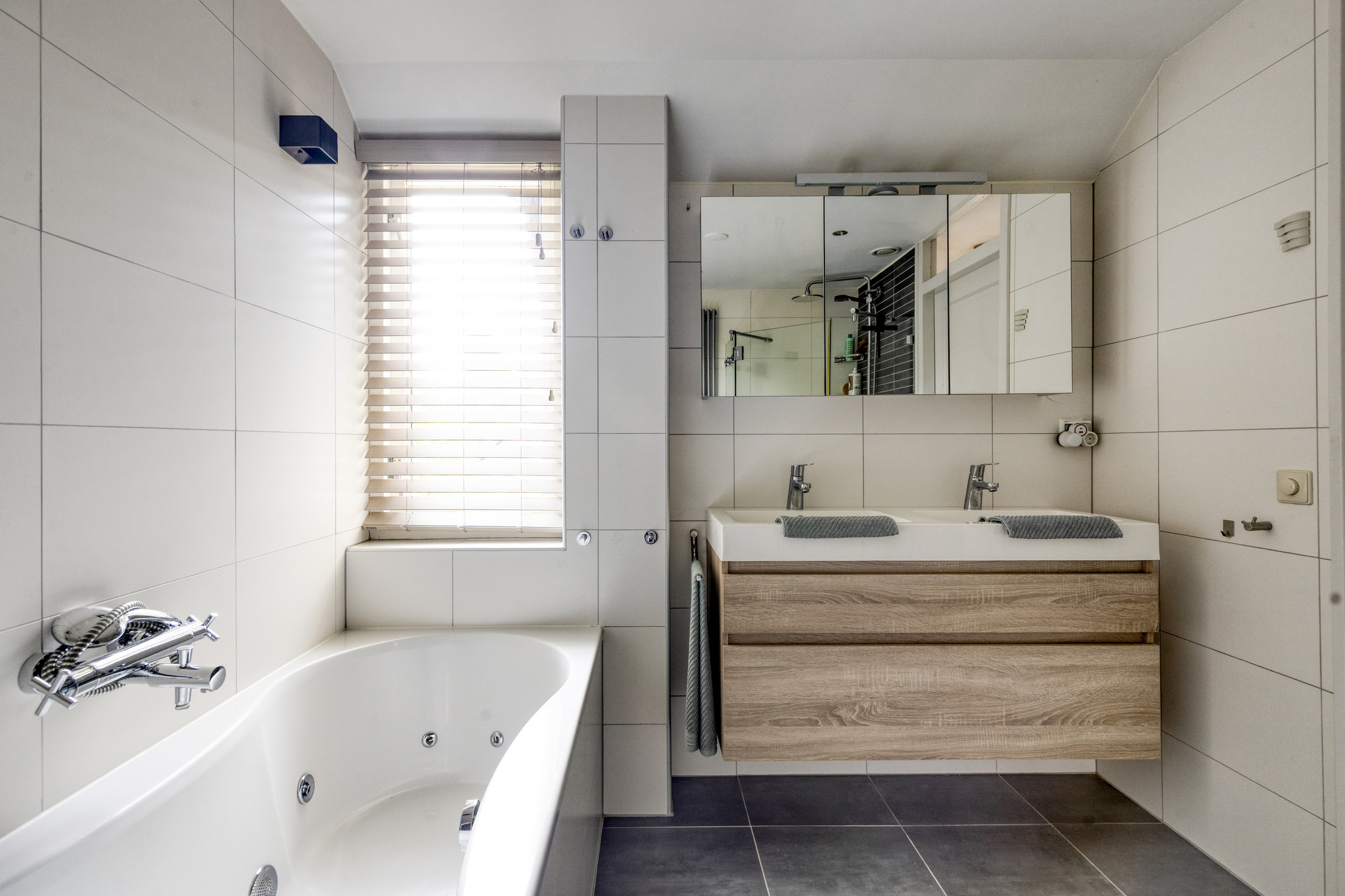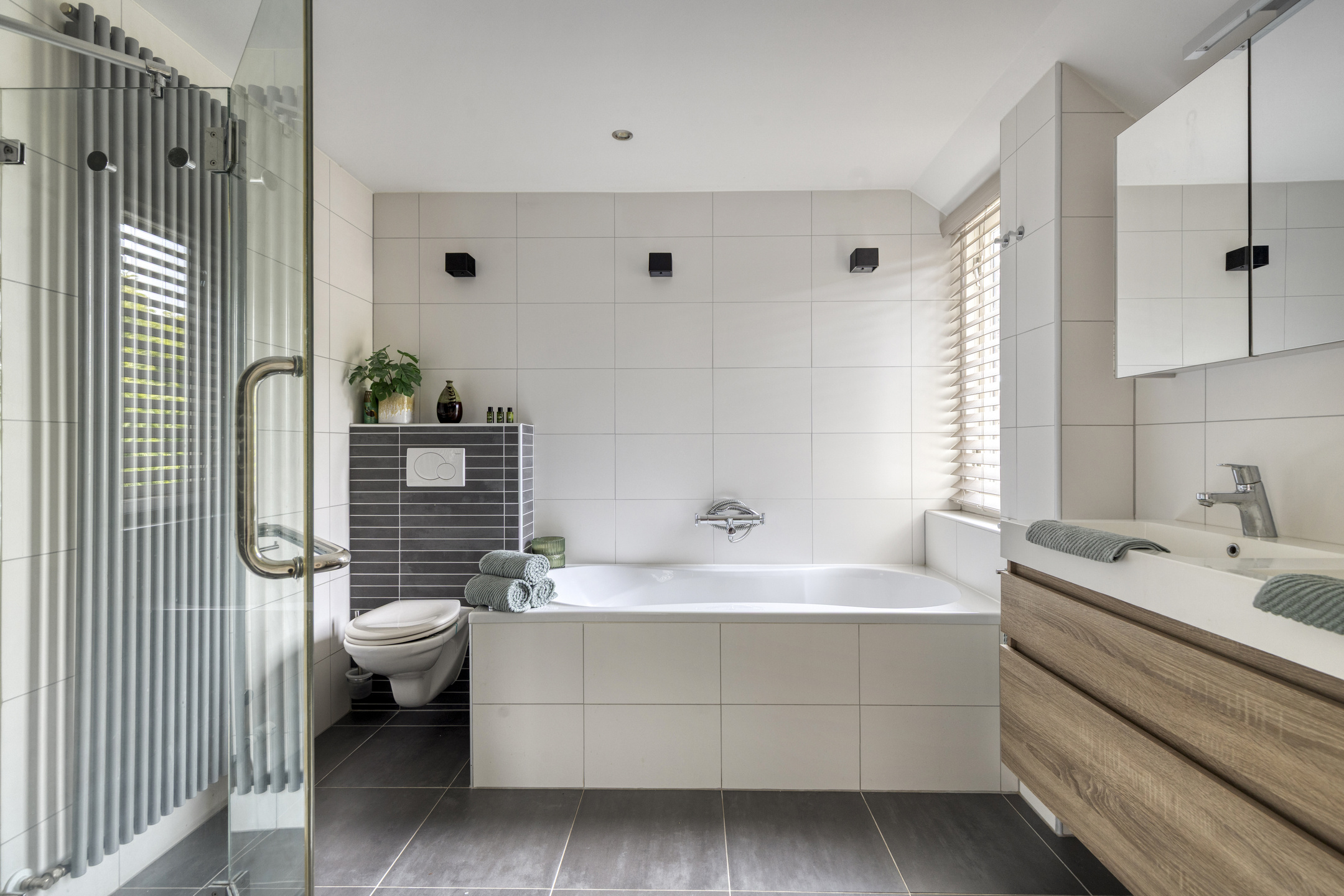 De badkamer is voorzien van een ligbad, toilet, douche en dubbele wastafel.