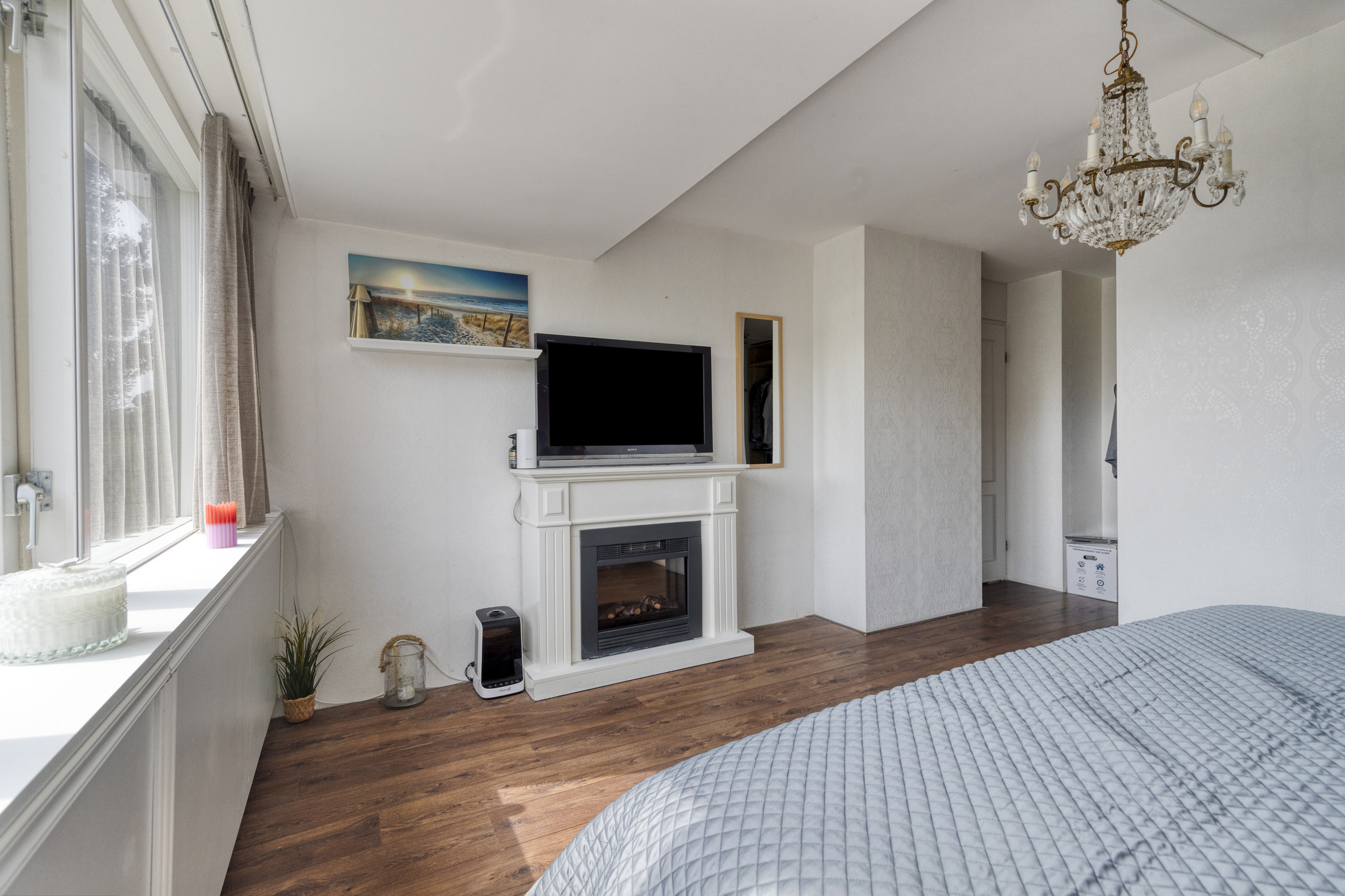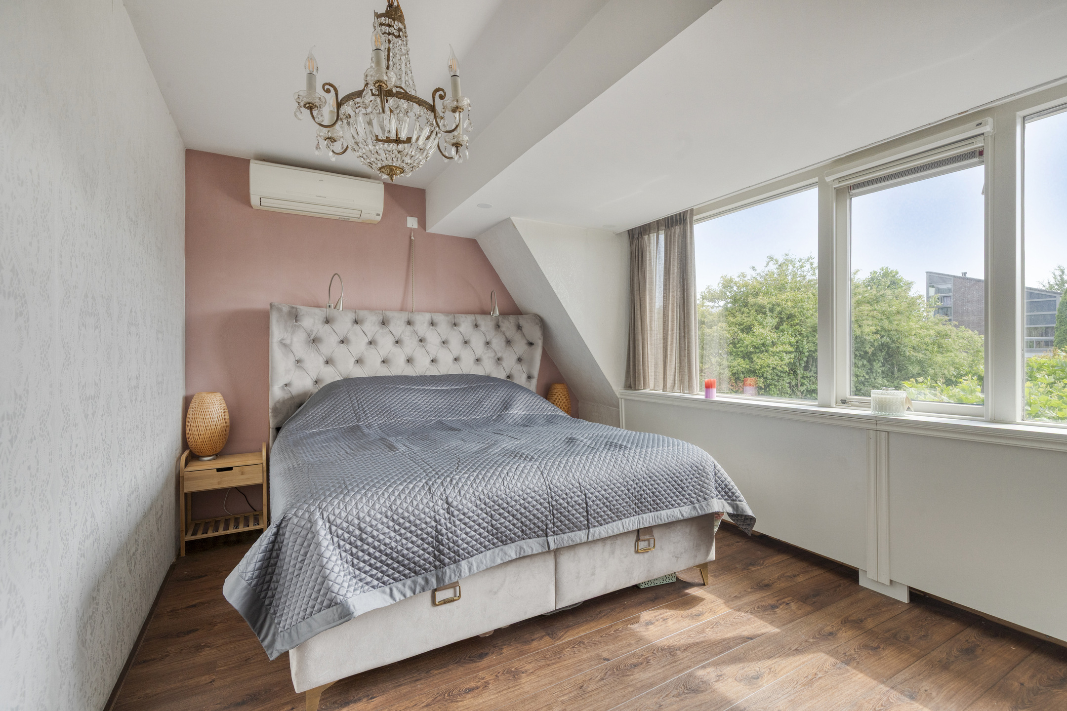 Slaapkamer aan de achterkant voorzien van airco en dakkapel met elektrische rolluiken. Deze kamer heeft een overzichtelijke inloopkast met raam.