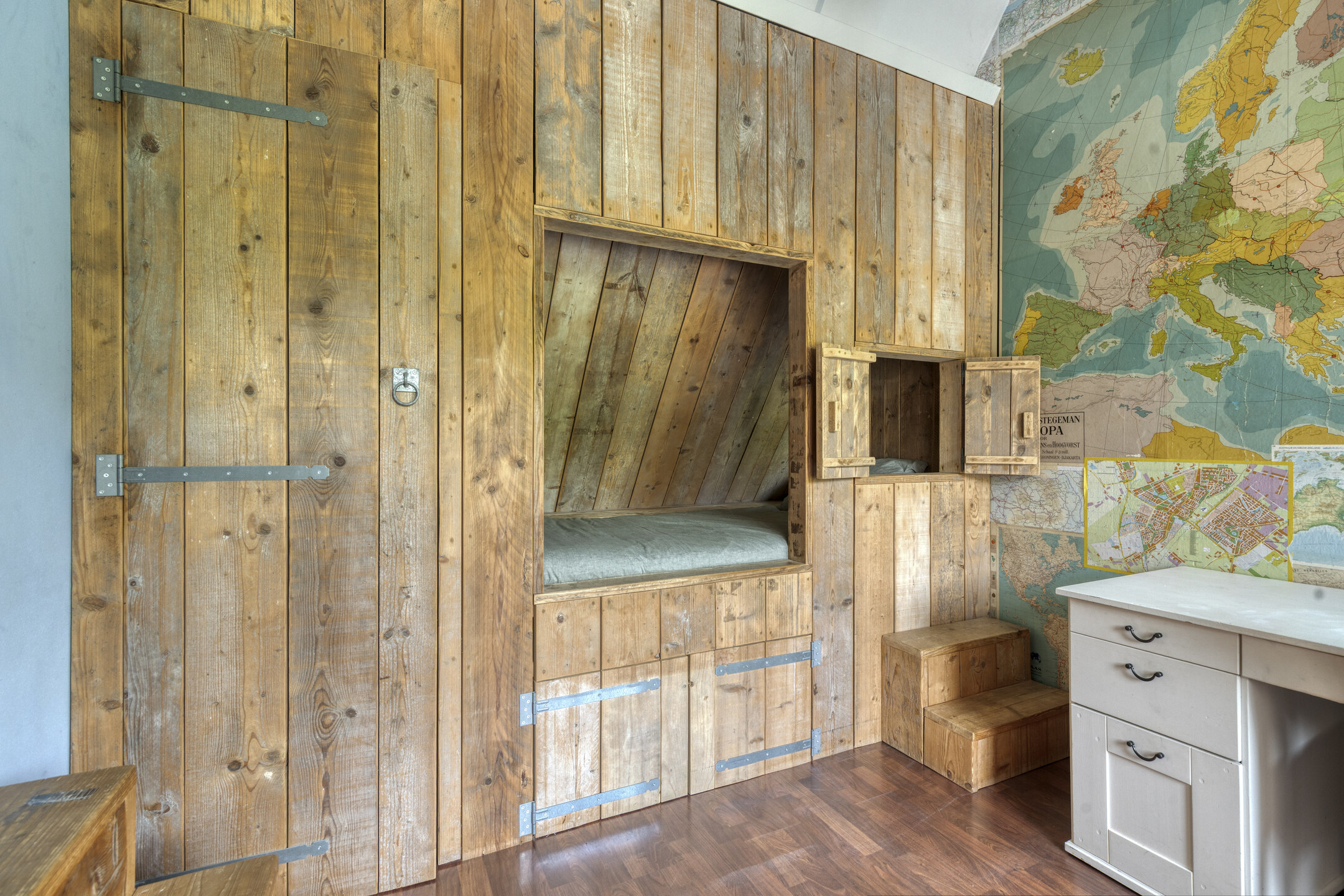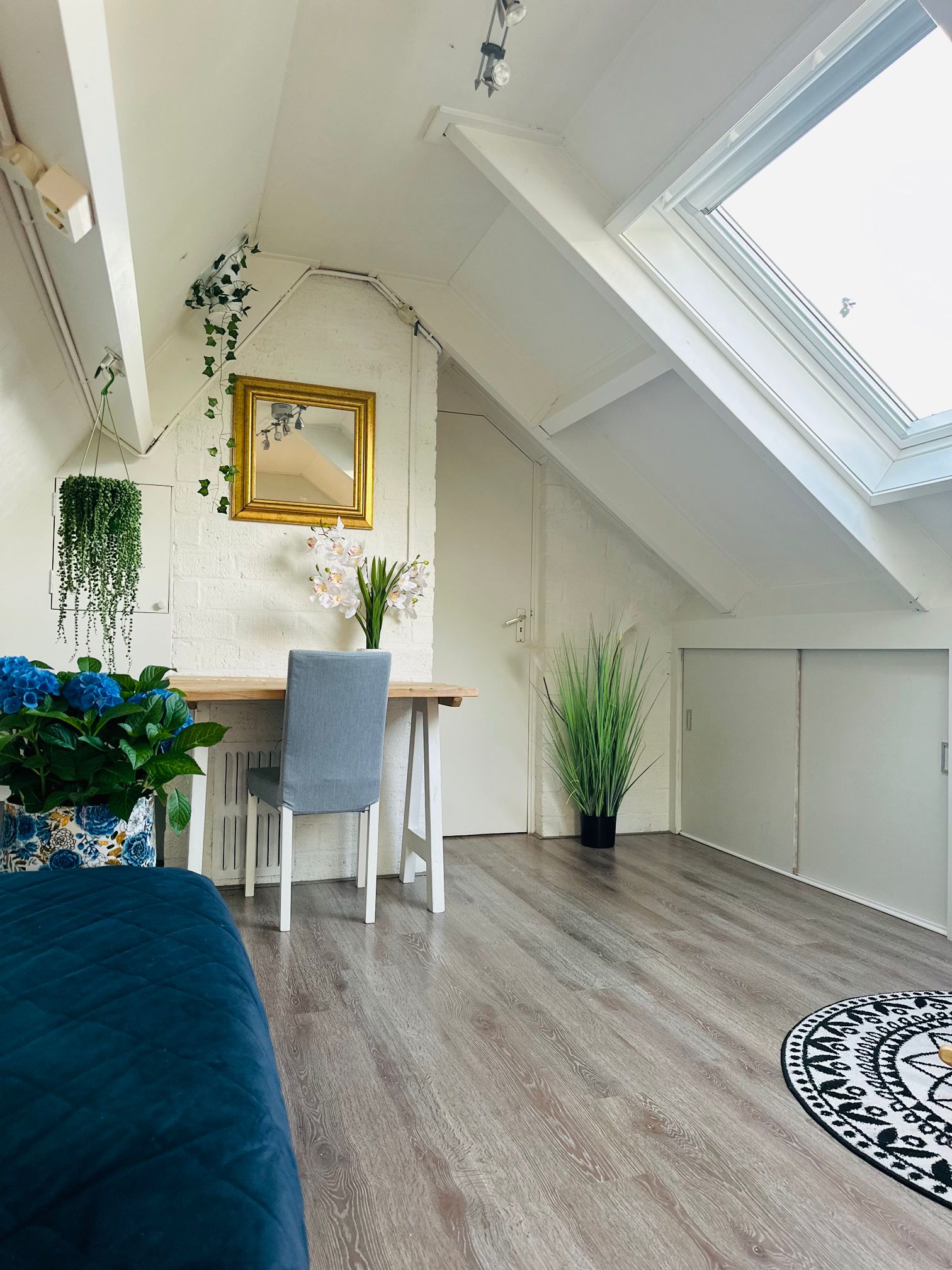 Slaapkamer met dakraam en zijraam en vaste kast. Extra bergruimte is er te vinden achter knieschotten onder het schuine dak.