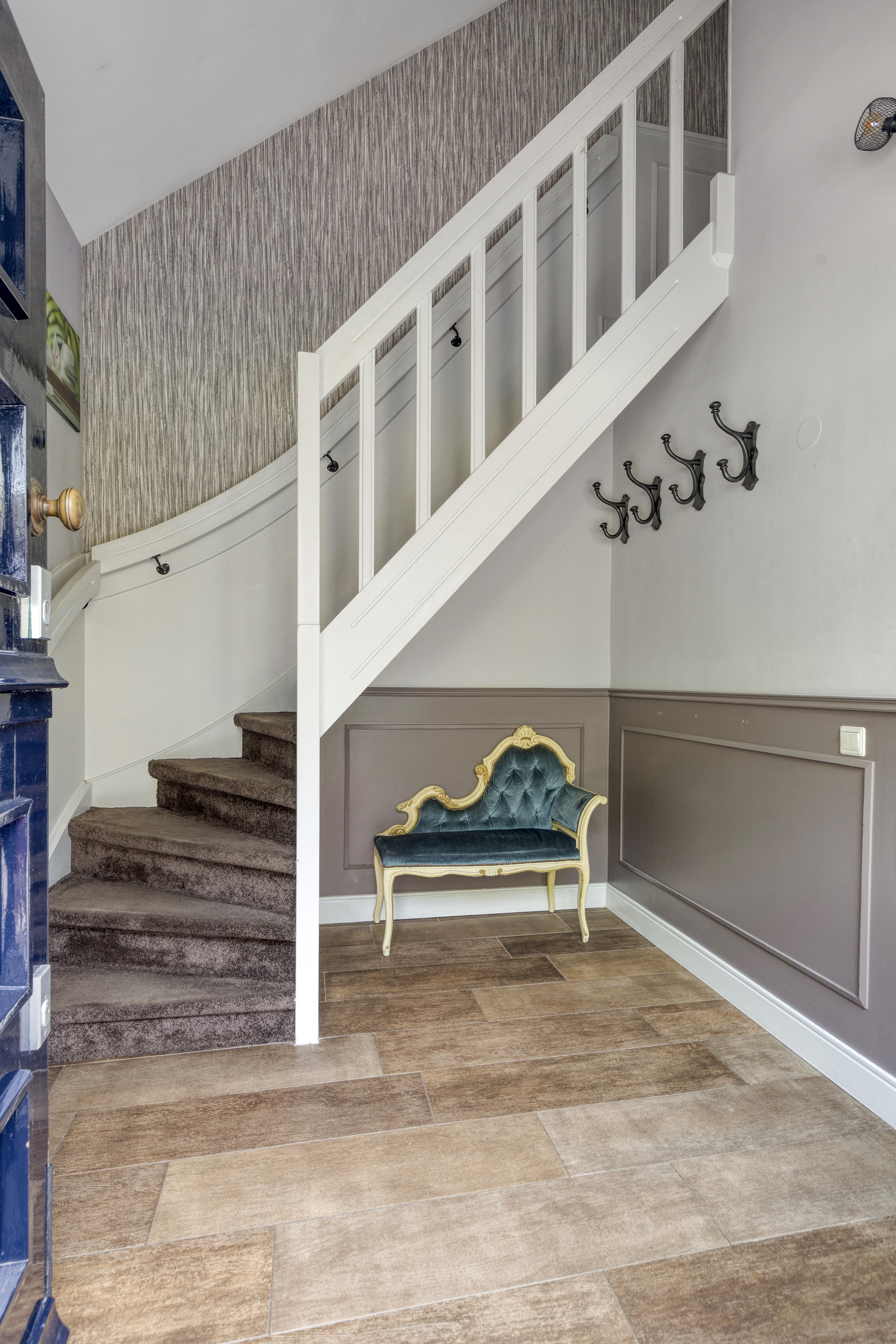 De gehele begane grond inclusief de veranda is voorzien van een houtlook tegelvloer met vloerverwarming.
