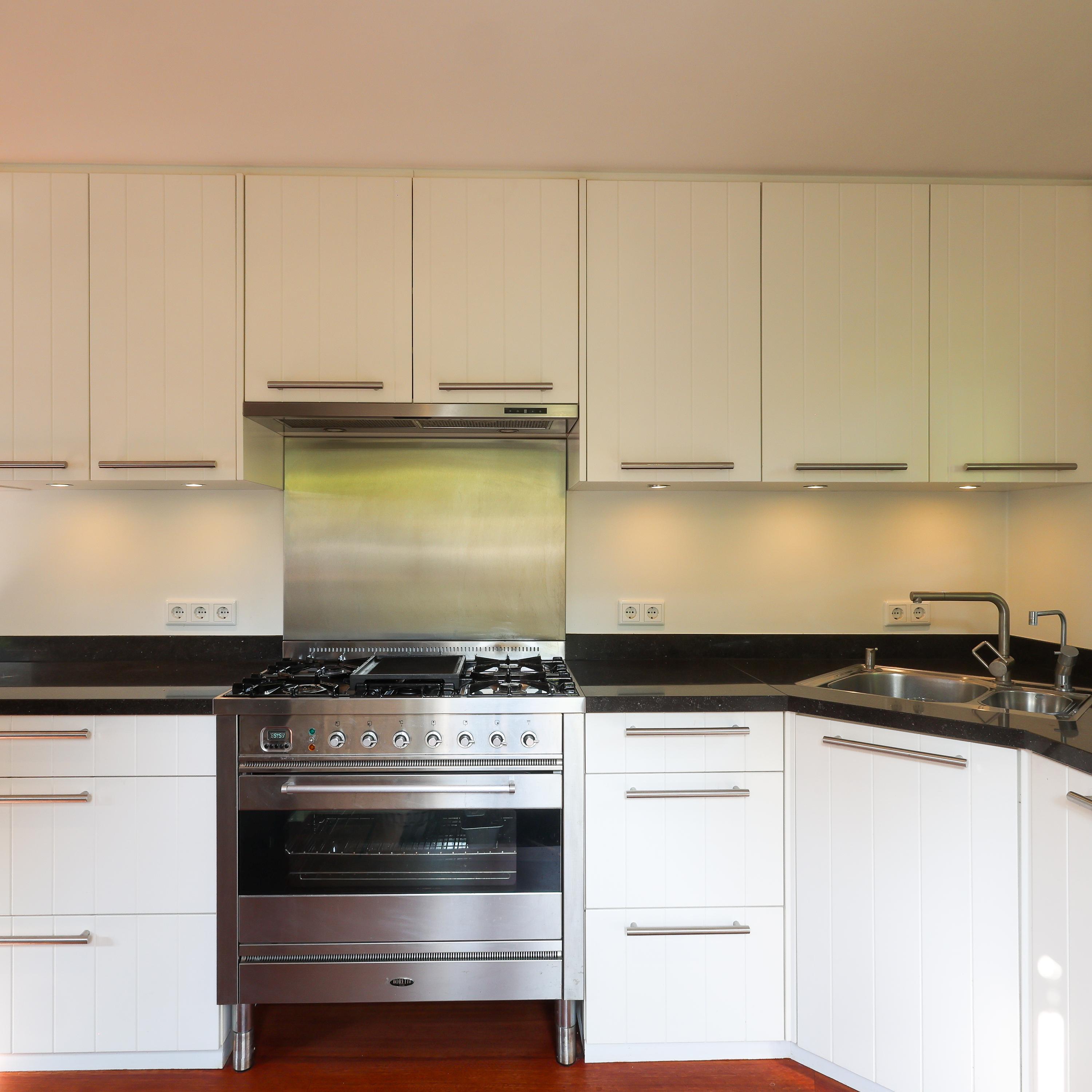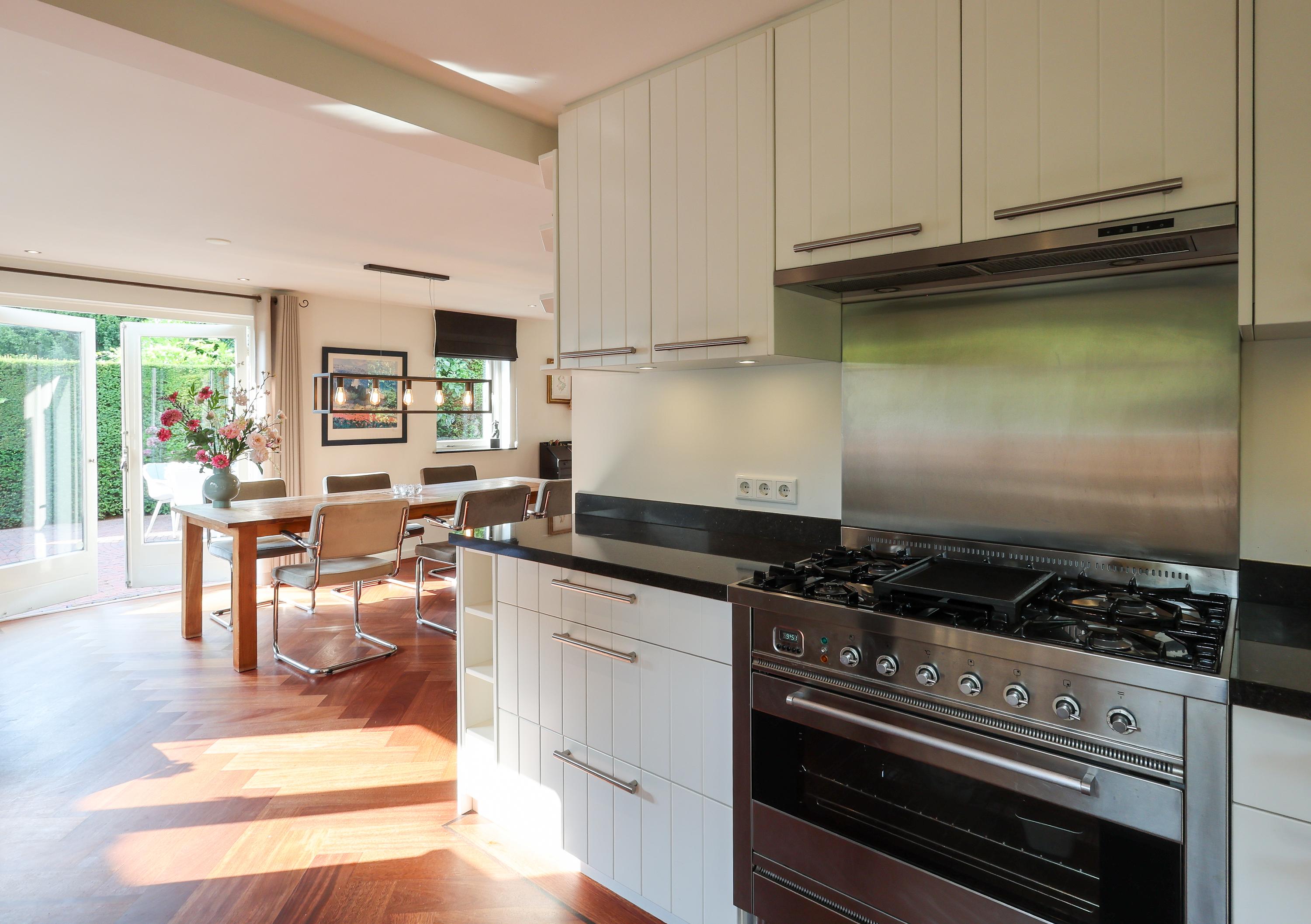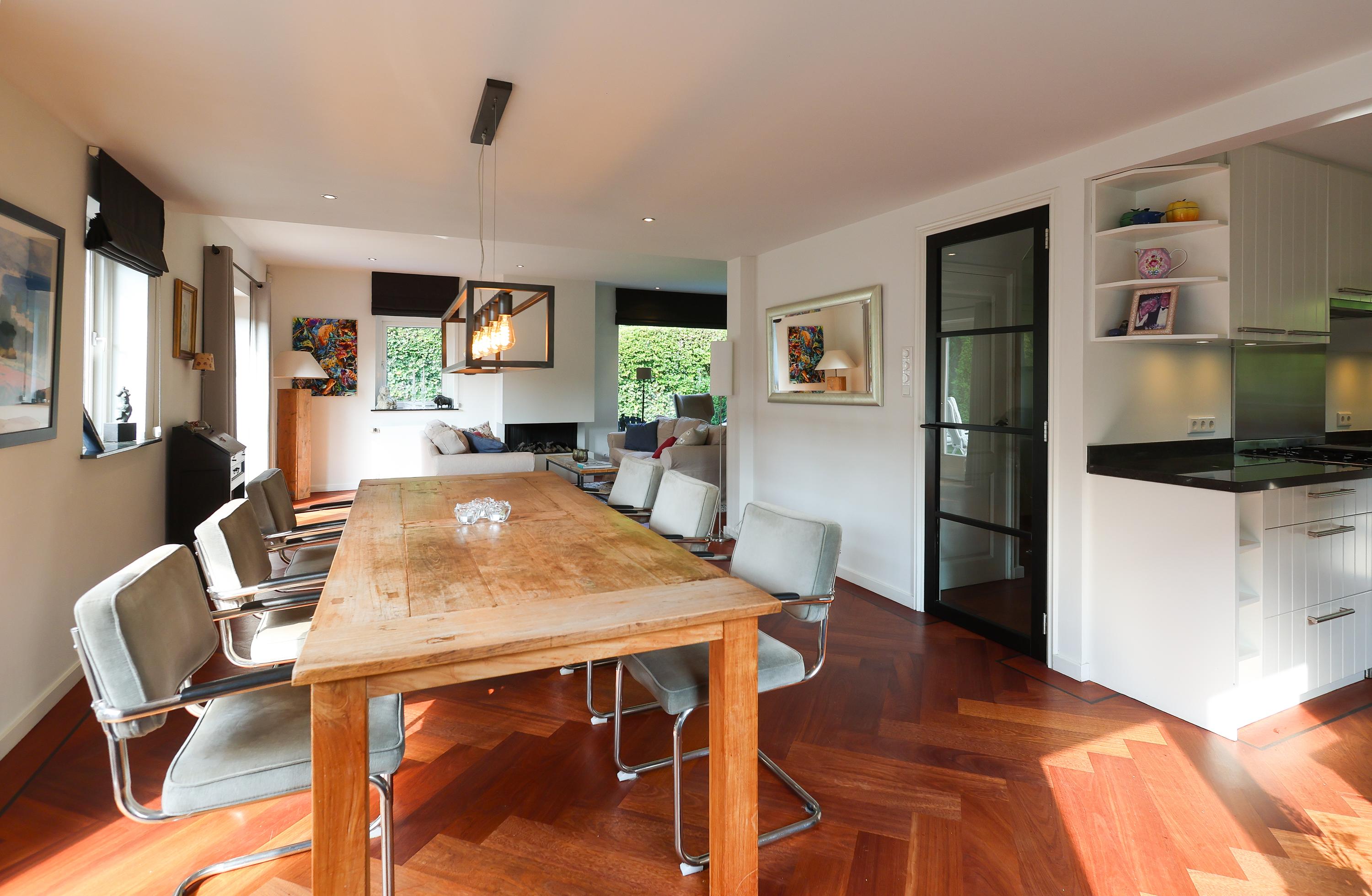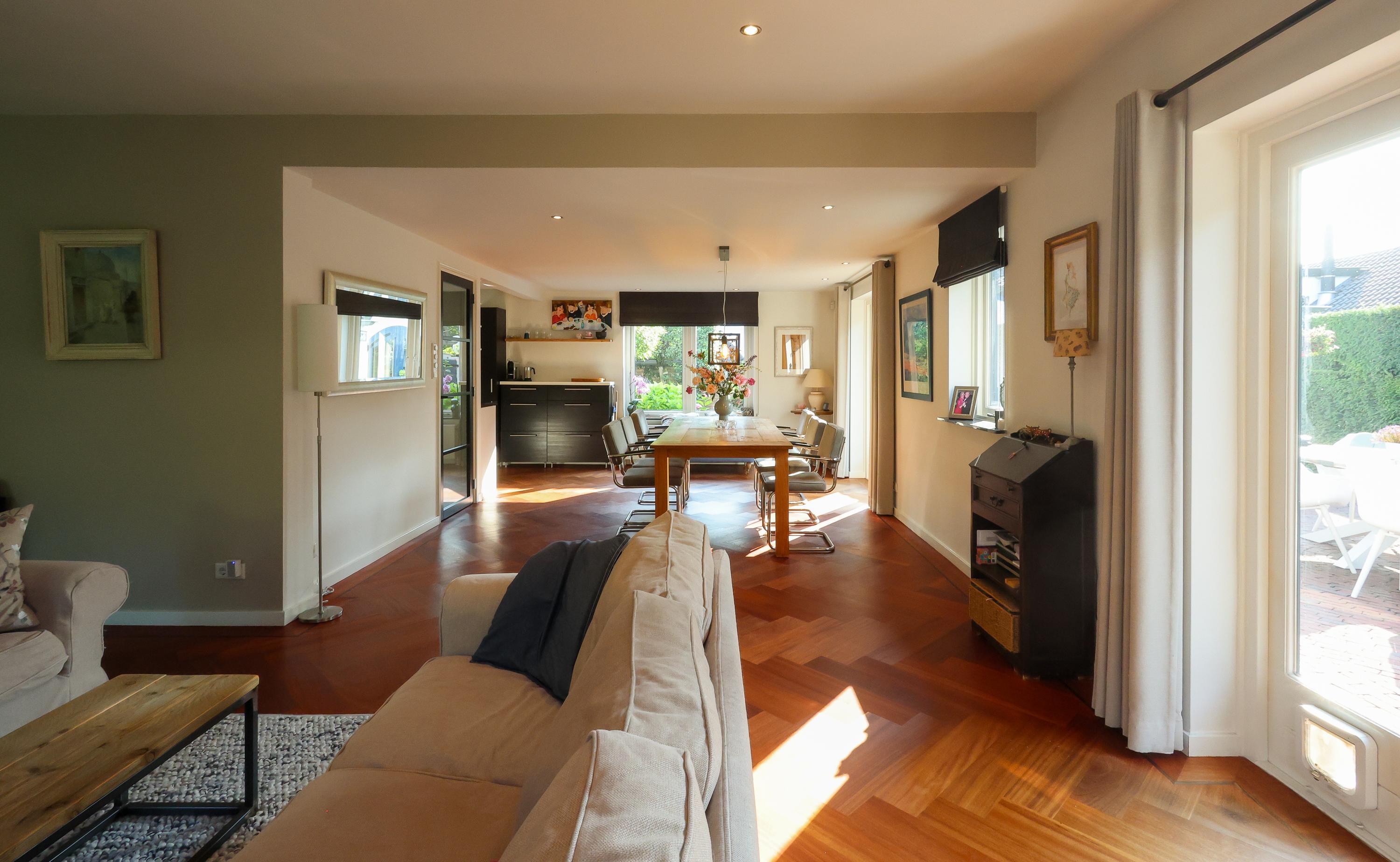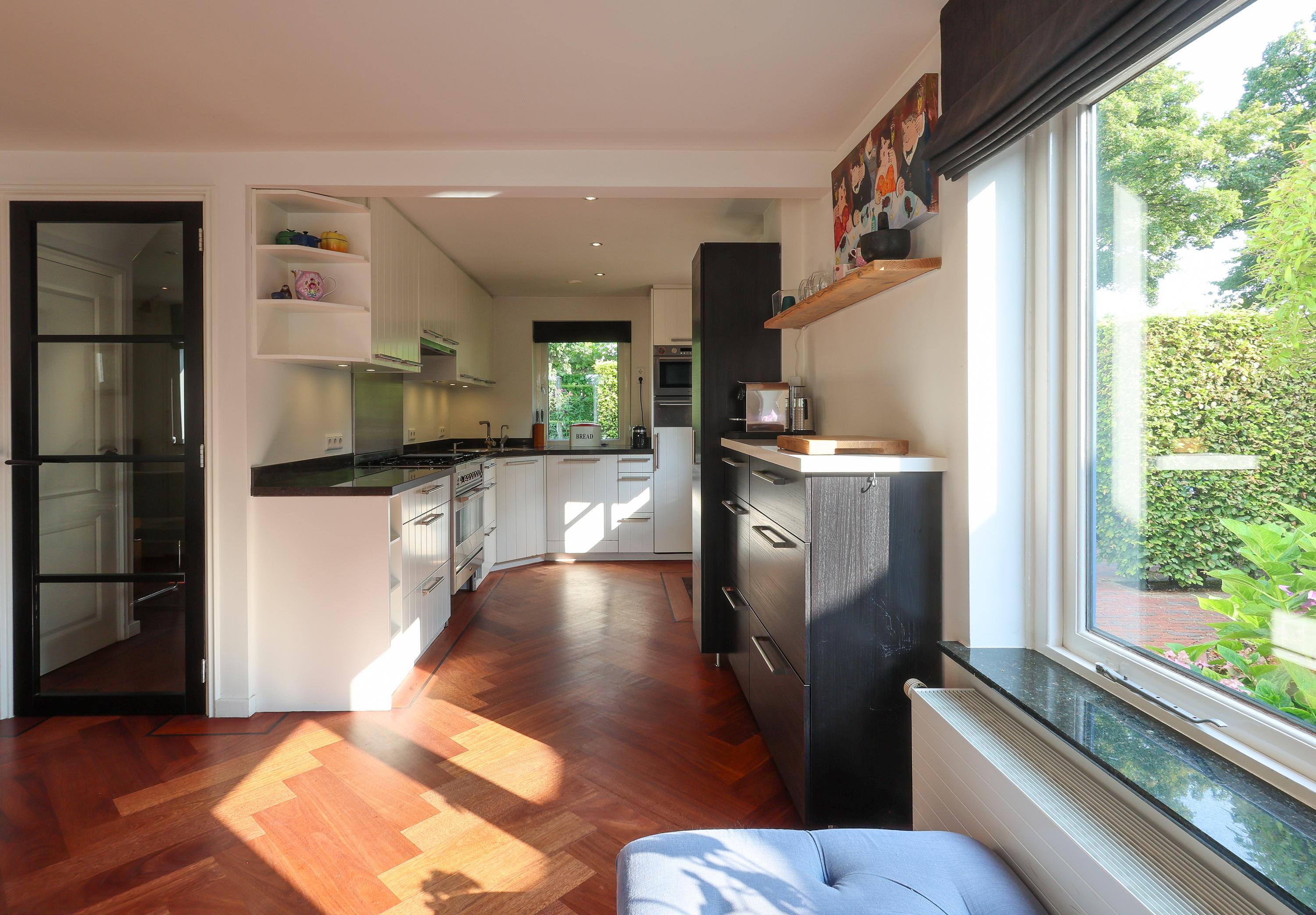 Binnen word je verwelkomd in de hal met gastentoilet, (hoewel je meestal door de achterdeur, zoals in Blaricum hoort, binnenkomt), een mooie lichte L-vormige woonkamer over de gehele achterzijde met parketvloer en gashaard, ideaal voor lange avonden of zonnige middagen met de tuindeuren open. De open keuken is modern en functioneel, voorzien van inbouwapparatuur met achterdeur naar de binnentuin. De kelder met stahoogte biedt extra bergruimte en plek voor wasmachine en droger.