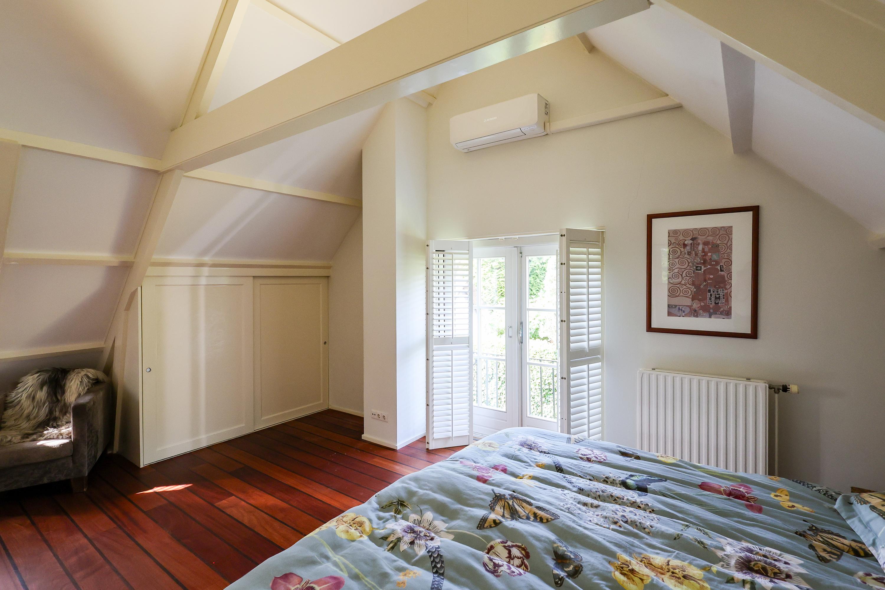 Op de eerste verdieping bevindt zich een royale ouderslaapkamer met zicht tot in de nok, vaste kasten en openslaande deuren naar het balkon, twee slaapkamers, waarvan 1 nu in gebruik als kastenkamer, een werkkamer en een moderne badkamer met vloerverwarming, inloopdouche/stoomcabine, tweede toilet en wastafelmeubel (veel bergruimte).