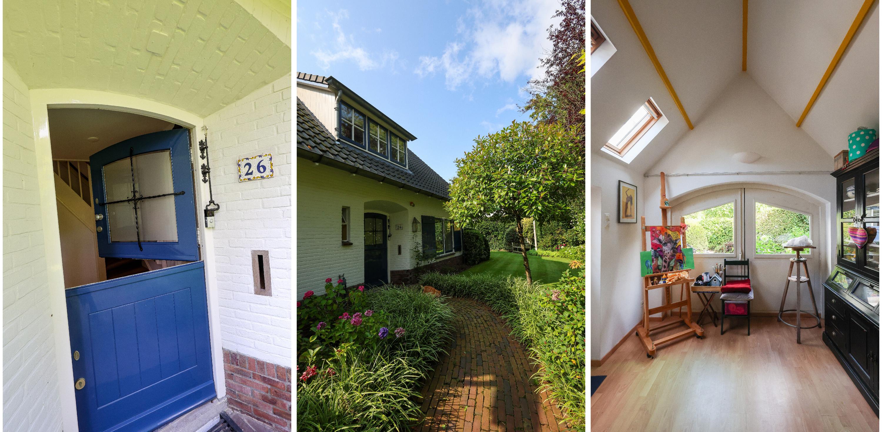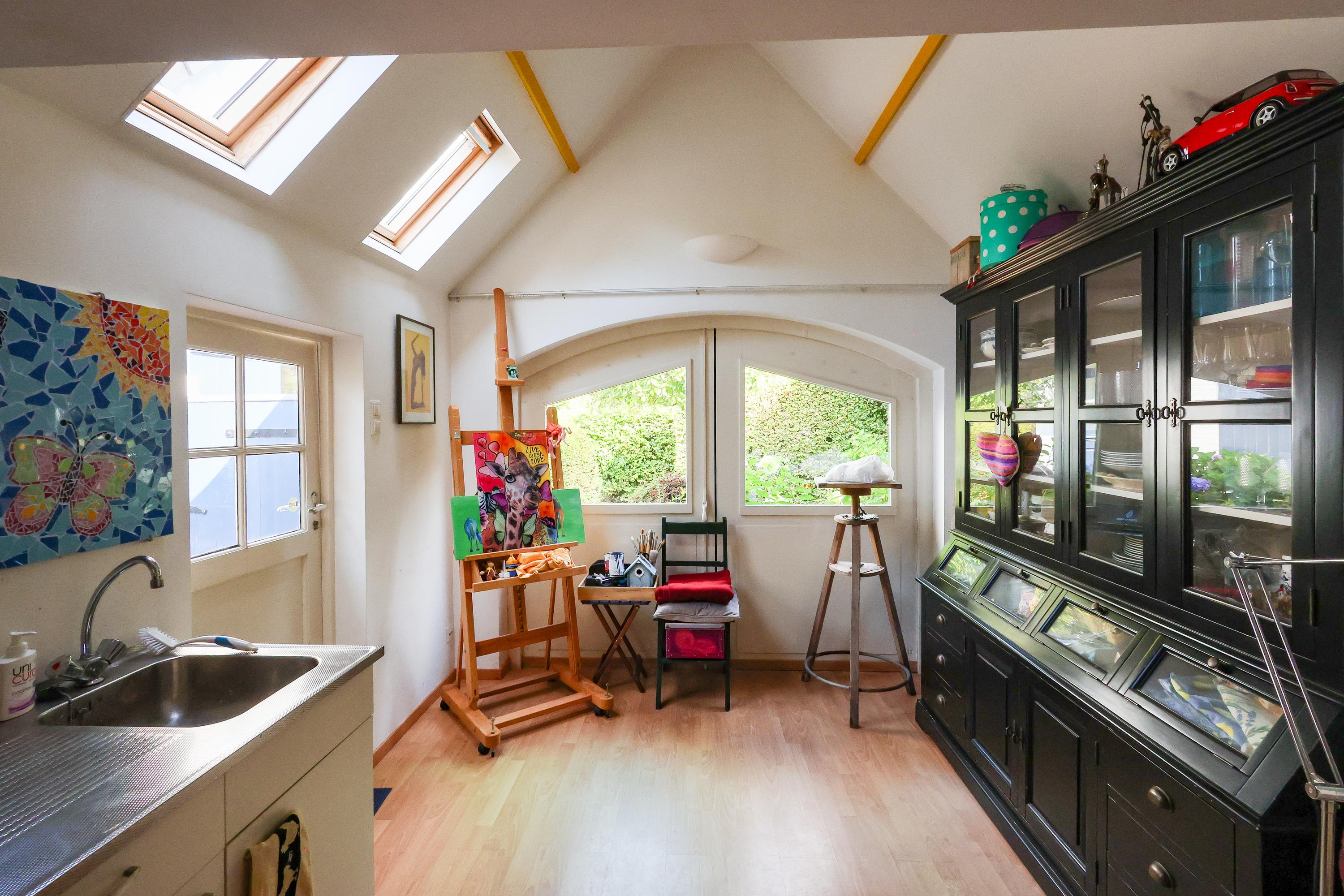 Het vrijstaande atelier van ca. 16 m² – voorheen een garage – is verbouwd tot een lichte, verwarmde ruimte met water en elektra. Een perfecte plek voor wie in alle rust wil werken, creëren. De mogelijkheid bestaat om de begane grond te vergroten door richting het atelier aan te bouwen.