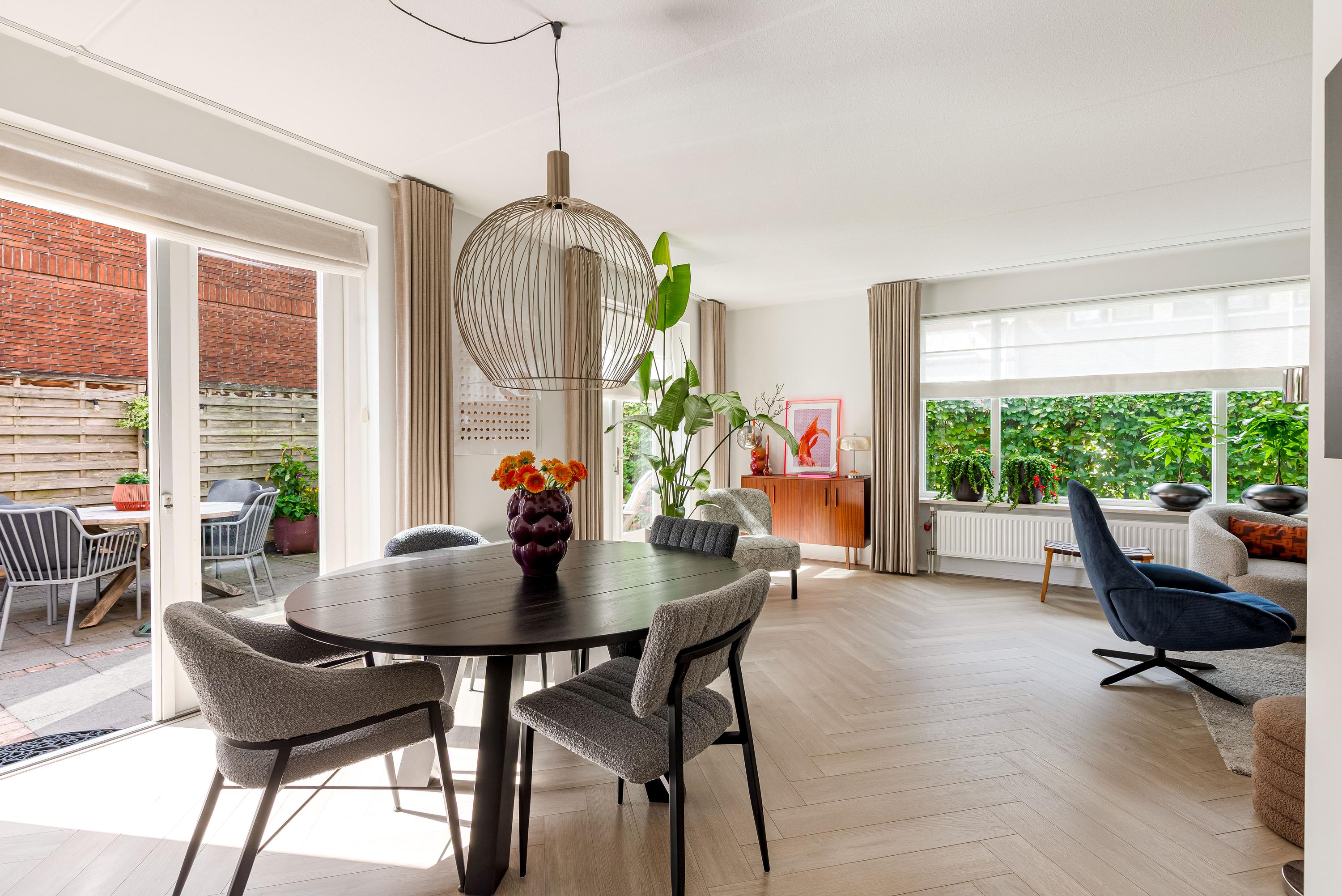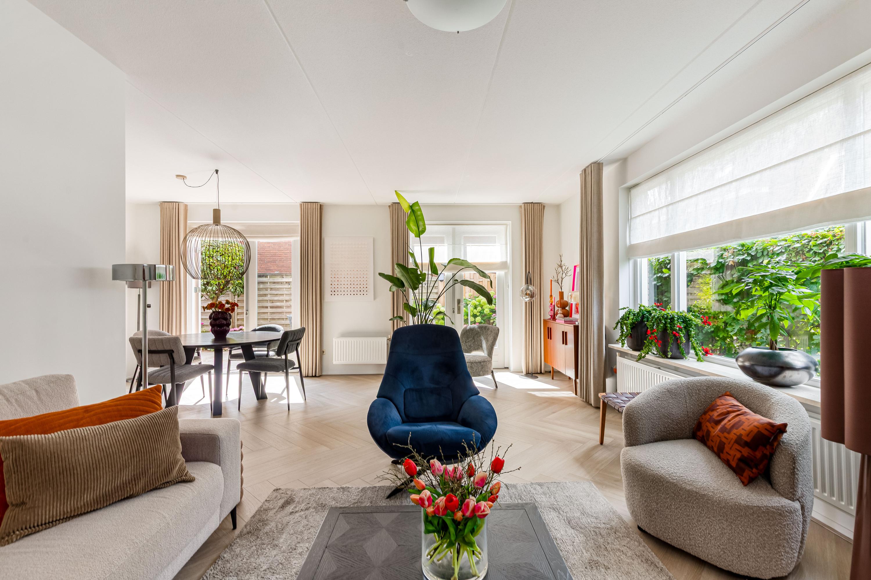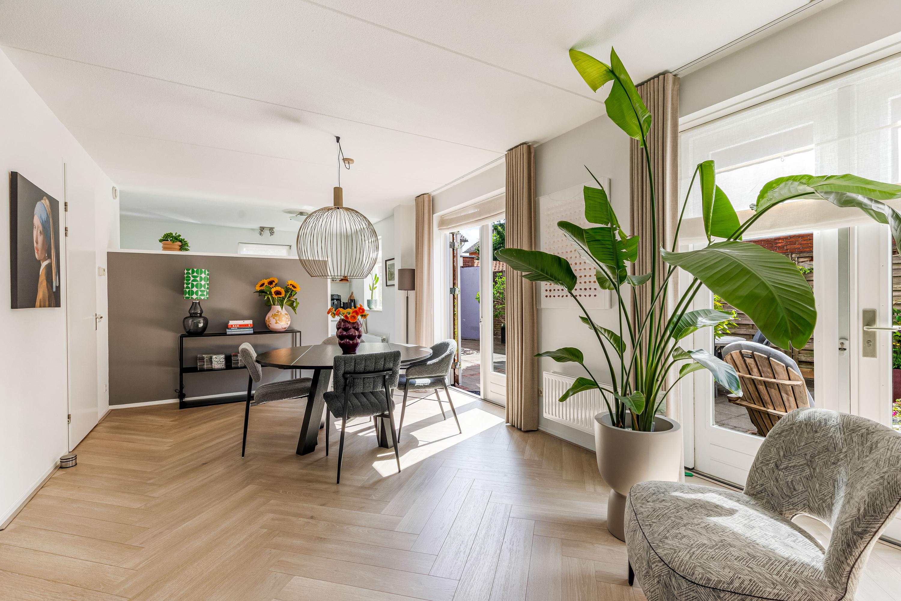 Via de ruime oprit (met plaats voor meerdere auto's én een laadpaal) betreed je de woning in een verzorgde hal met meterkast, toilet, trapopgang en toegang tot de living. De royale en lichte woonkamer straalt luxe uit, met een fraaie visgraatvloer, grote raampartijen en 2x dubbele openslaande deuren naar de zonnige achtertuin. De naadloze verbinding tussen binnen en buiten maakt dit een ideale plek om te ontspannen of te entertainen.