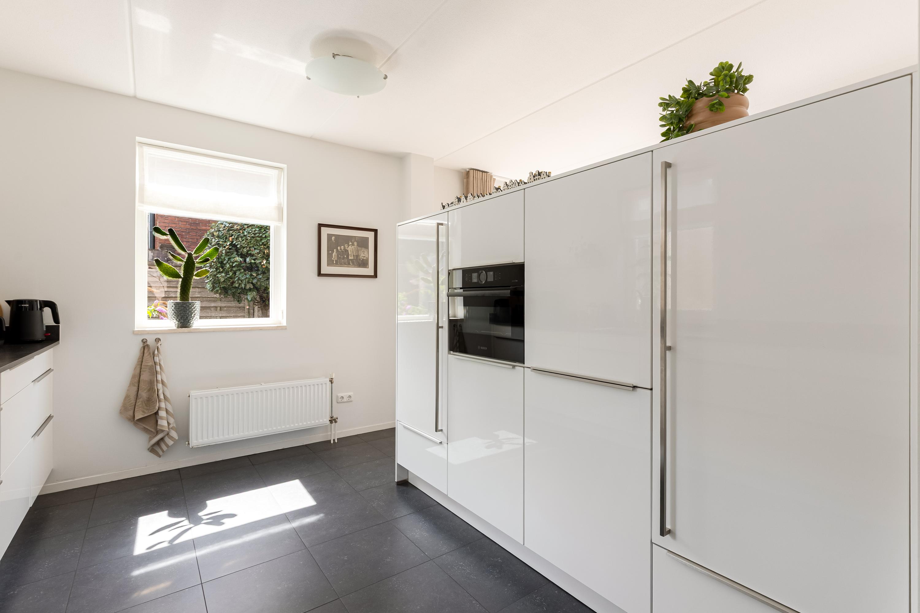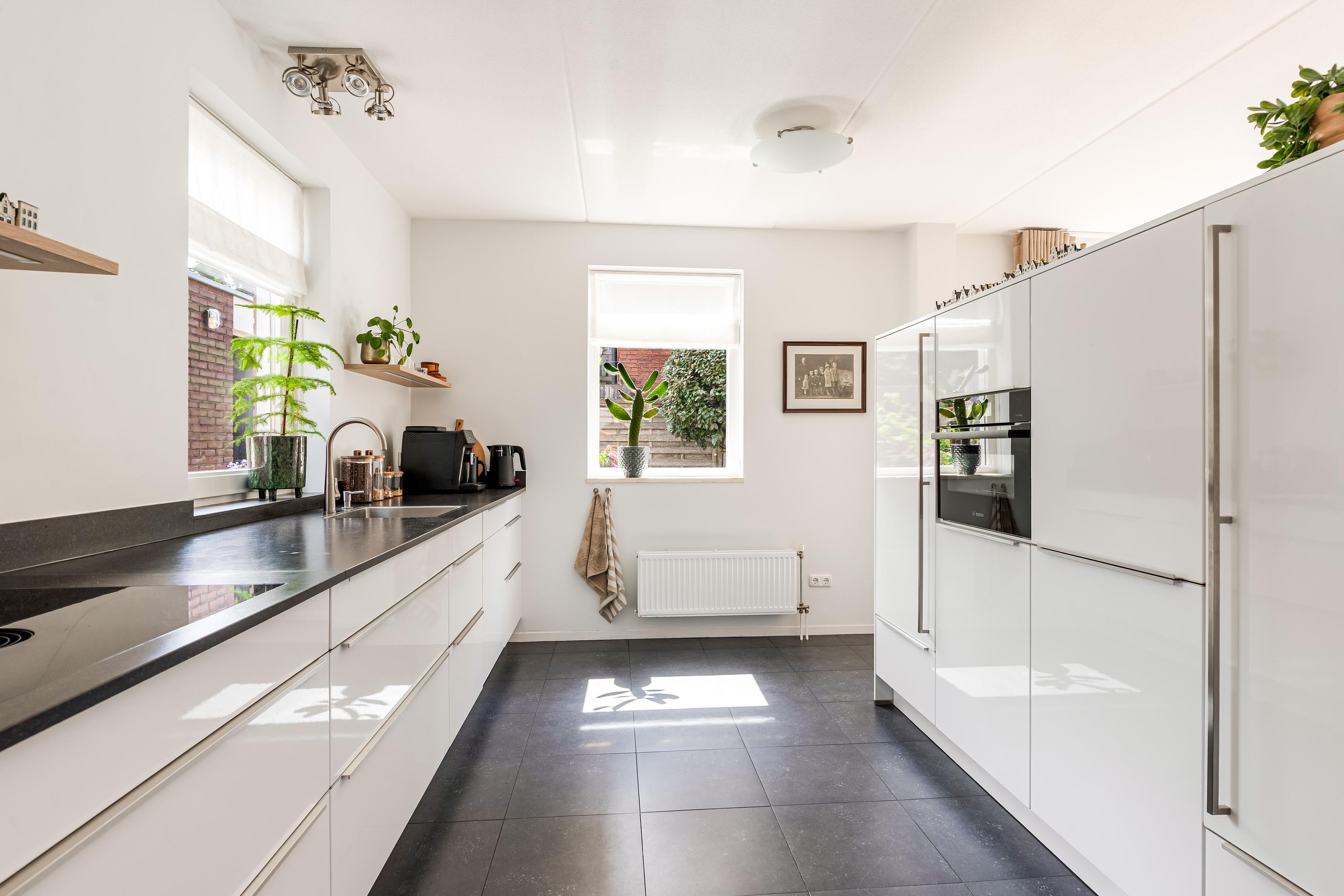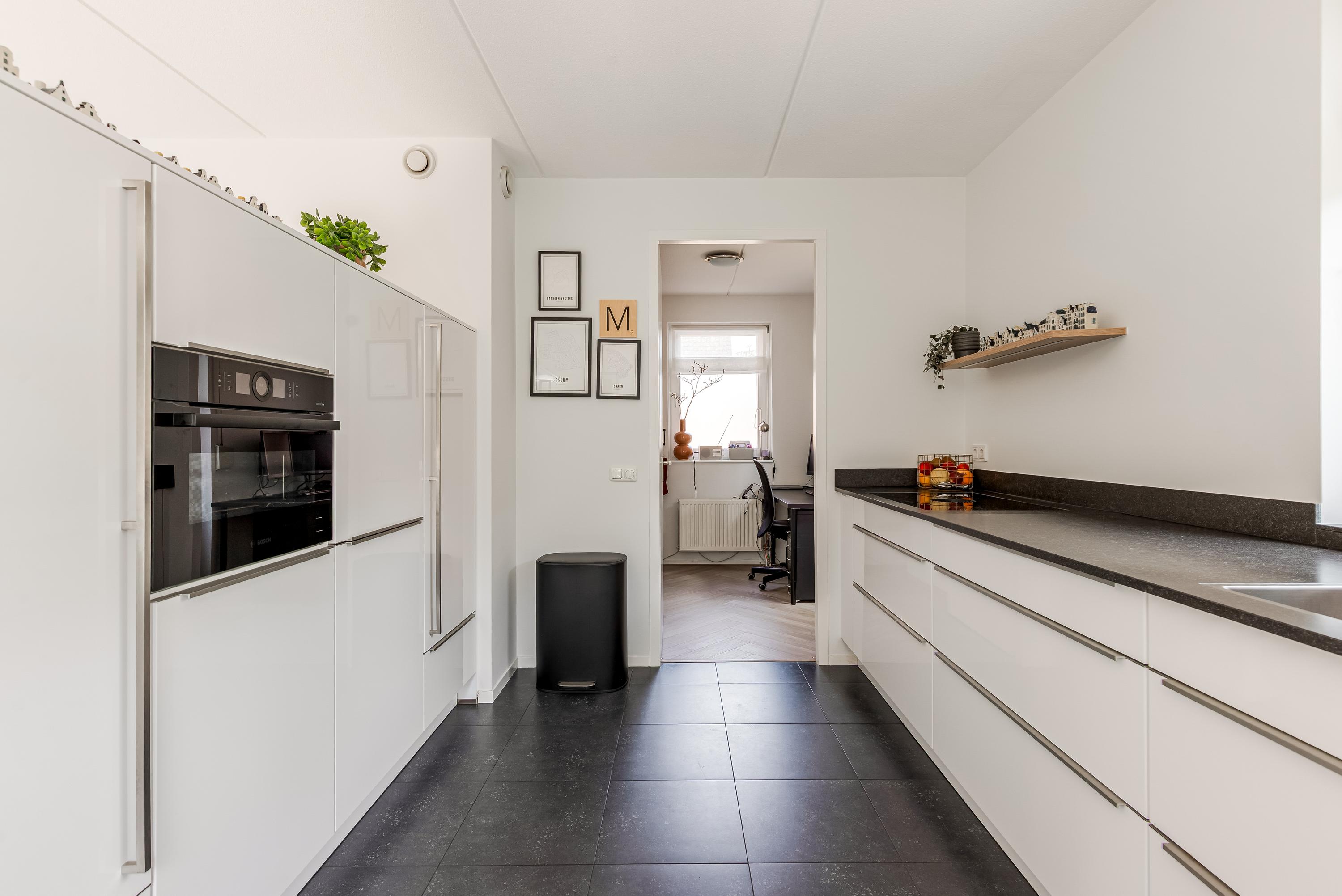 De halfopen keuken is afgewerkt in een lichte, moderne kleurstelling en voorzien van hoogwaardige inbouwapparatuur, volop werkruimte en praktische opbergkasten. Een vaste kastenwand scheidt de keuken stijlvol van de woonkamer. Aansluitend is de bijkeuken welke thans in gebruik is als kantoorruimte.