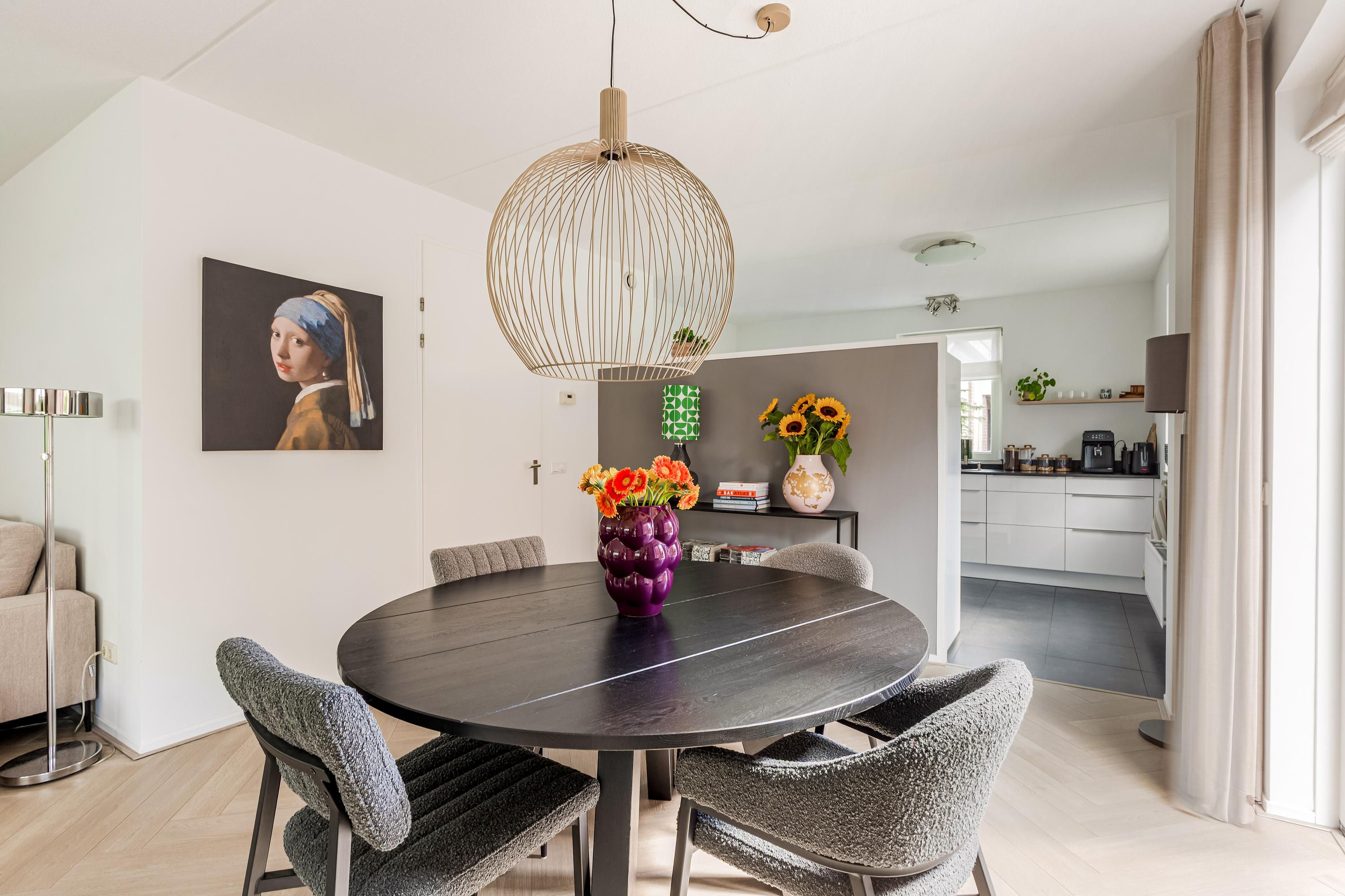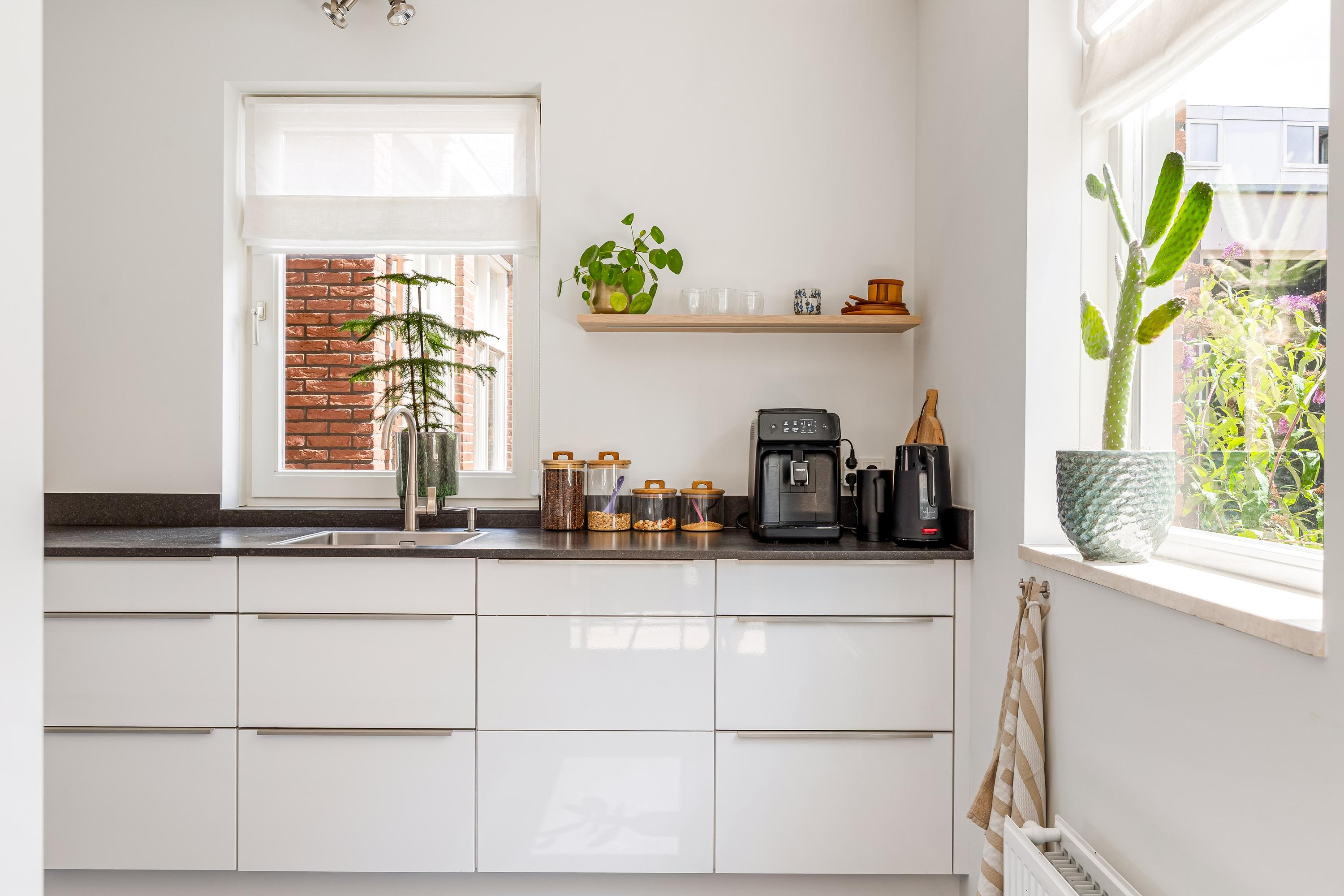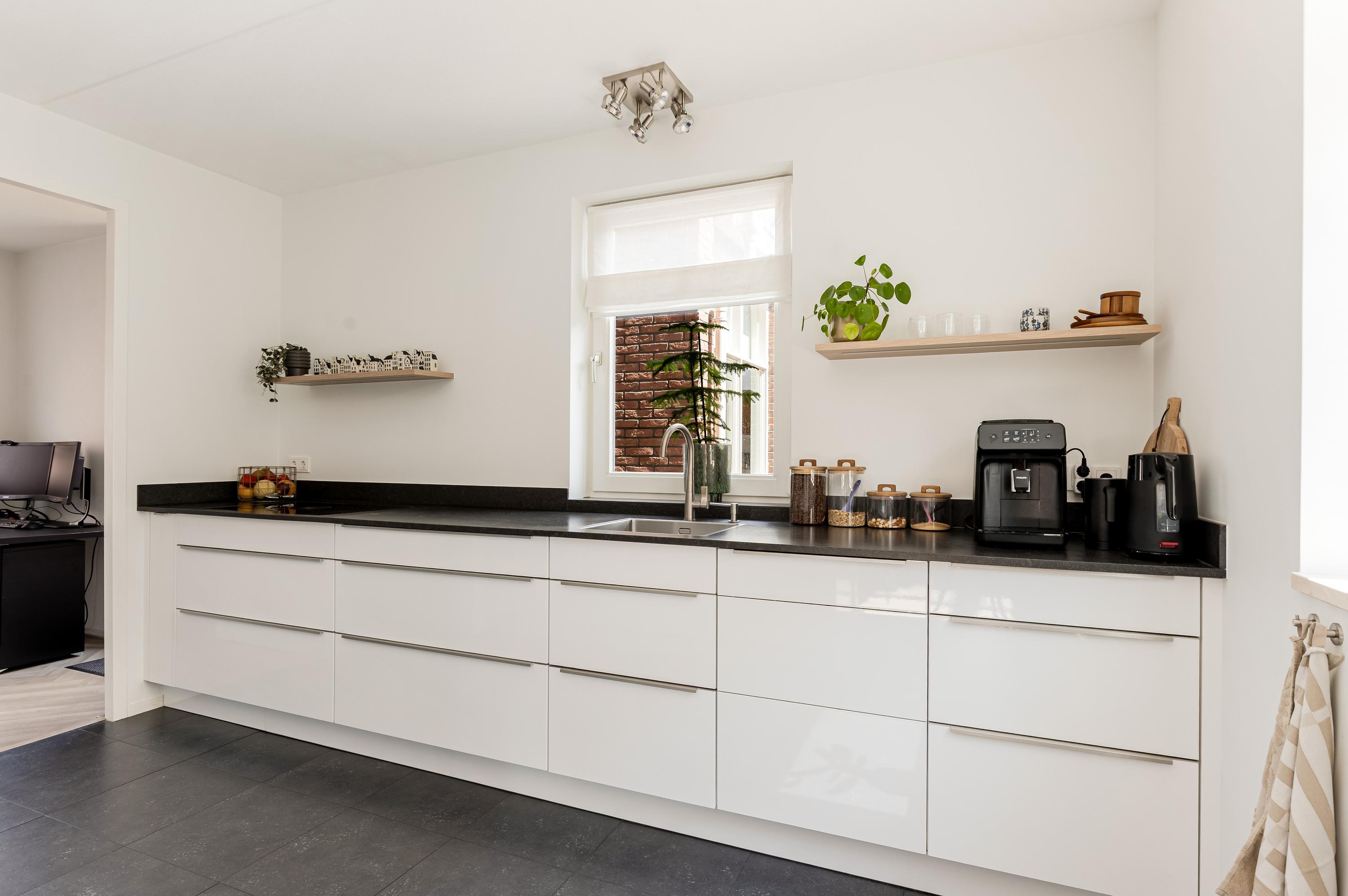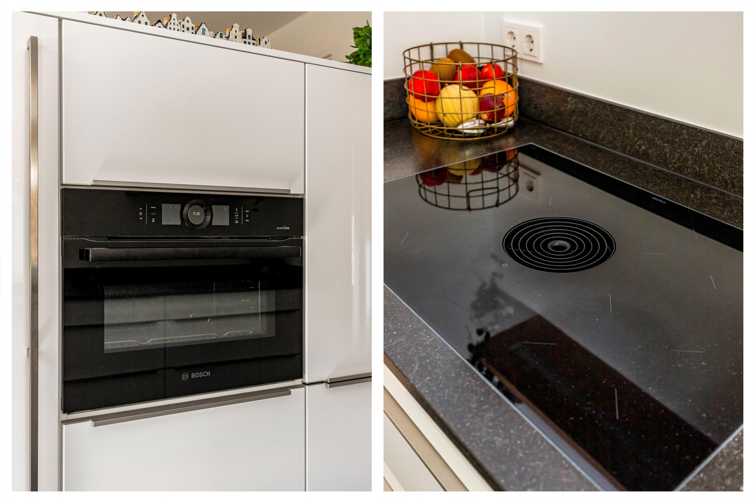 De halfopen keuken is afgewerkt in een lichte, moderne kleurstelling en voorzien van hoogwaardige inbouwapparatuur, volop werkruimte en praktische opbergkasten. Een vaste kastenwand scheidt de keuken stijlvol van de woonkamer. Aansluitend is de bijkeuken welke thans in gebruik is als kantoorruimte.