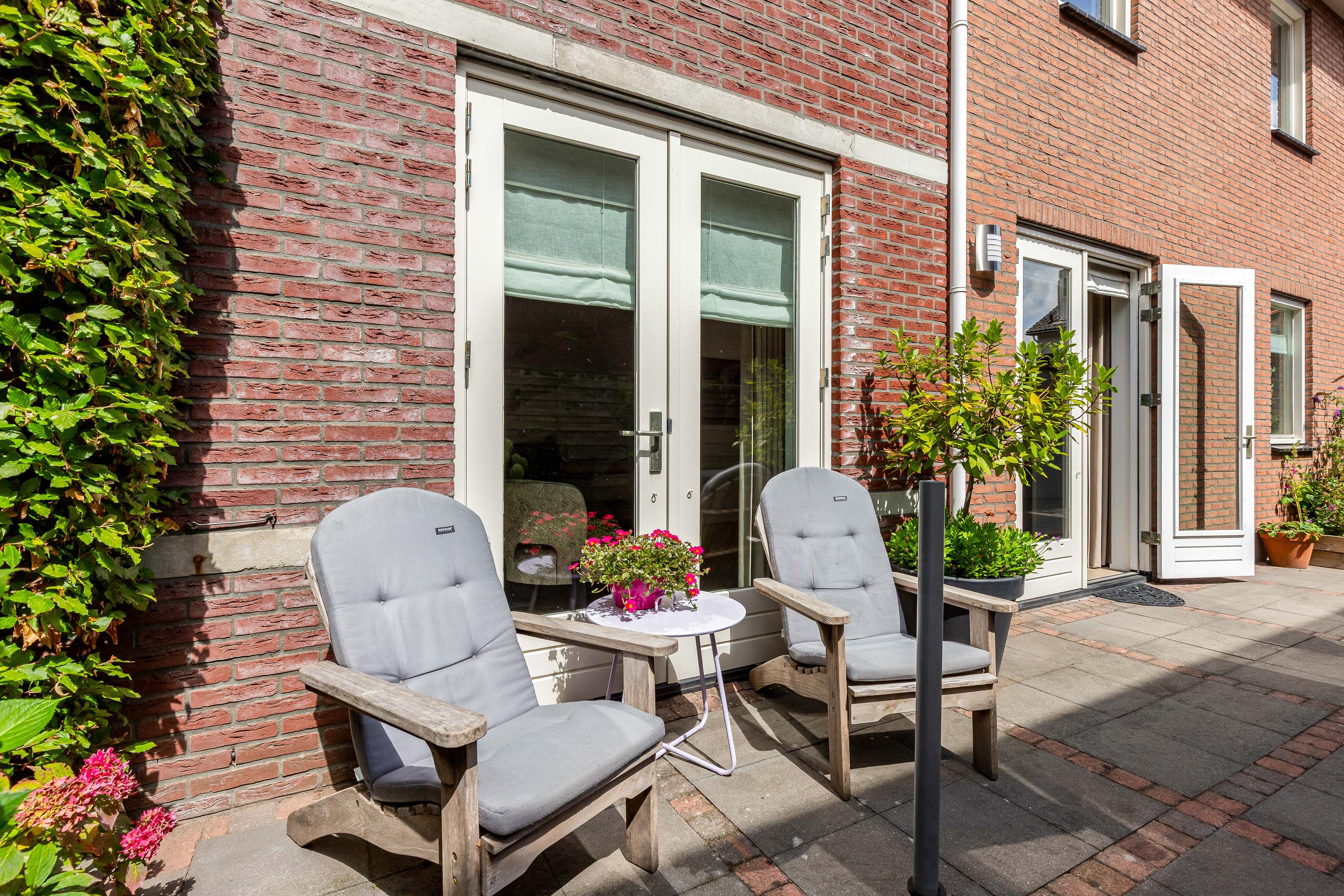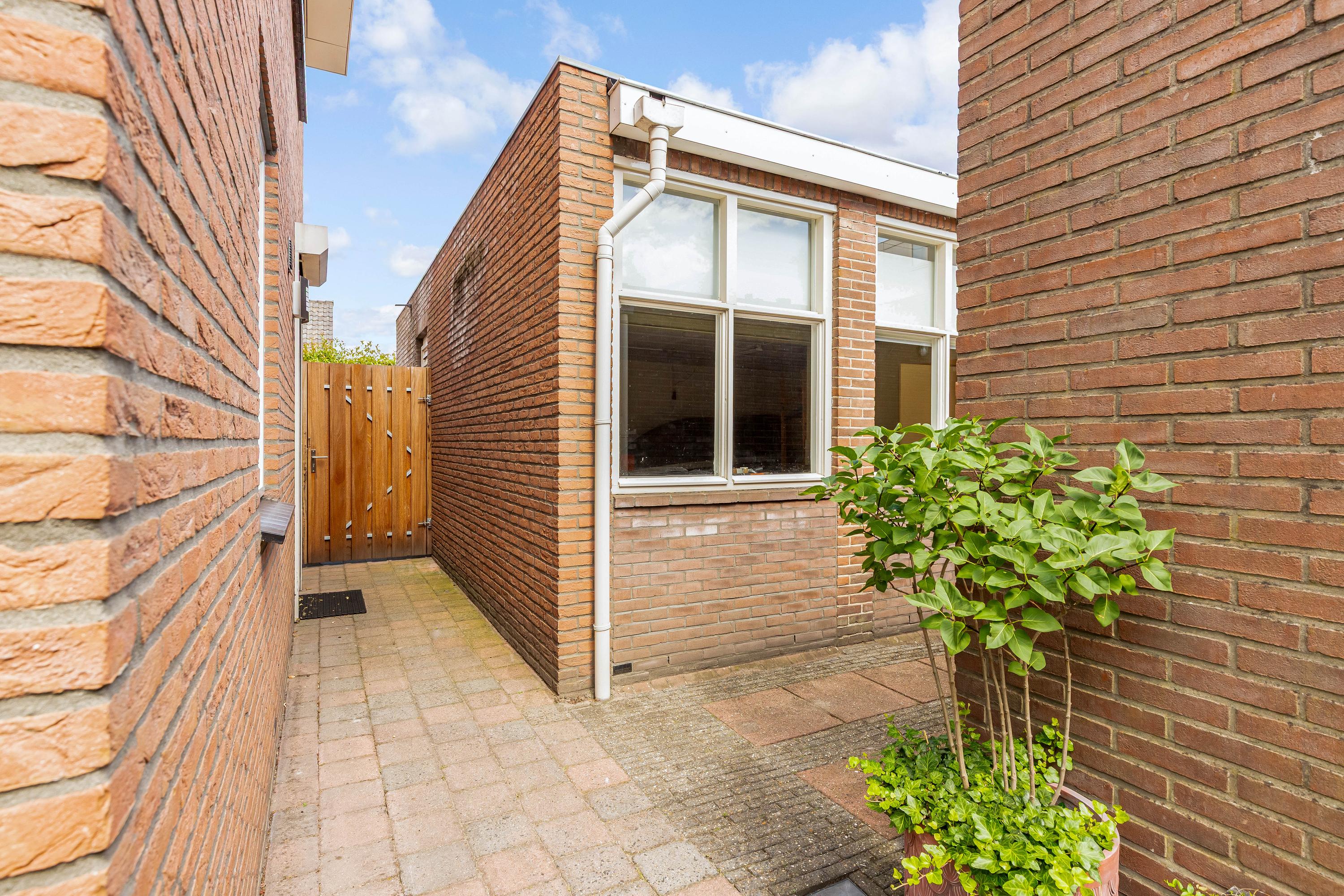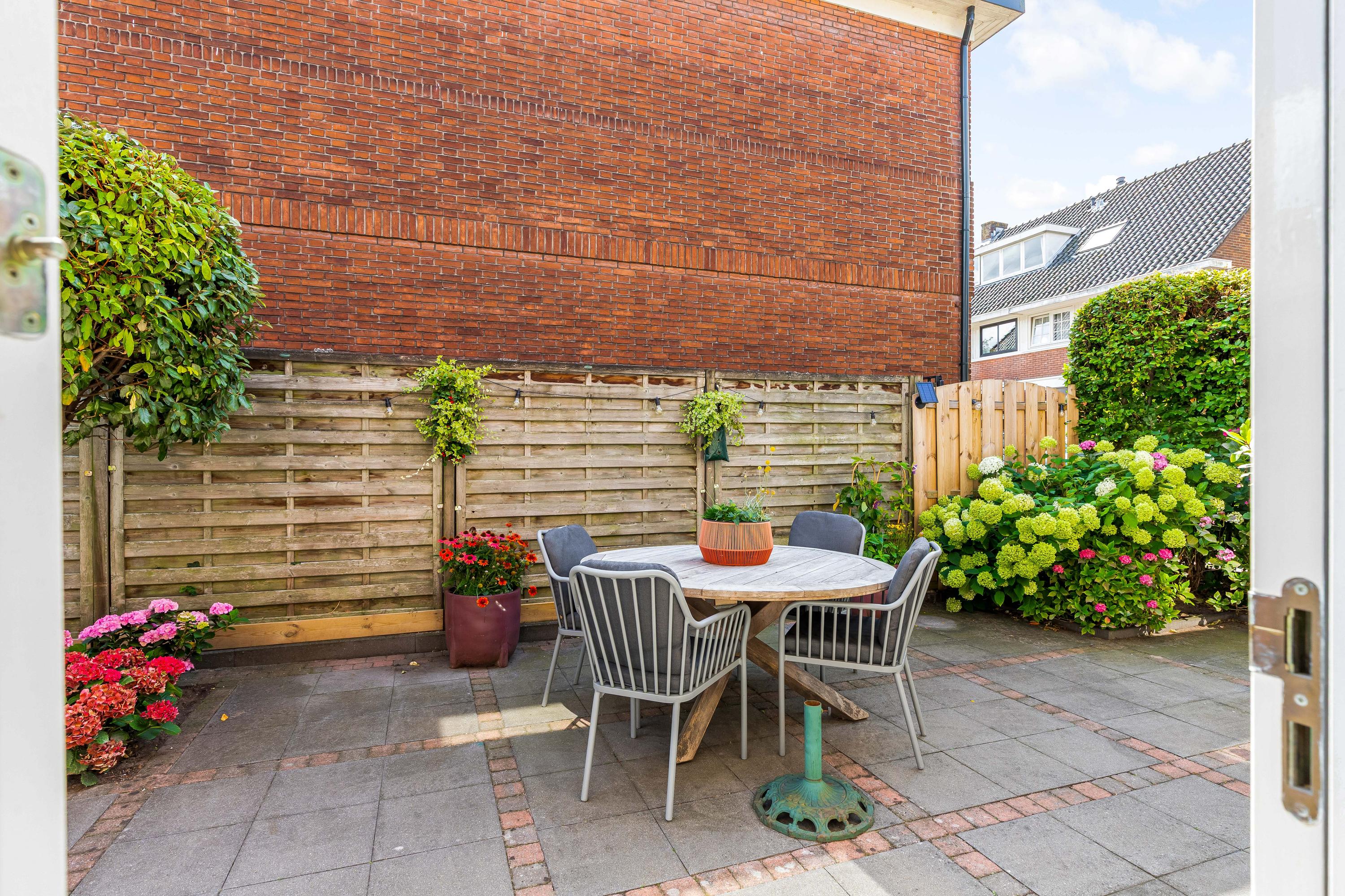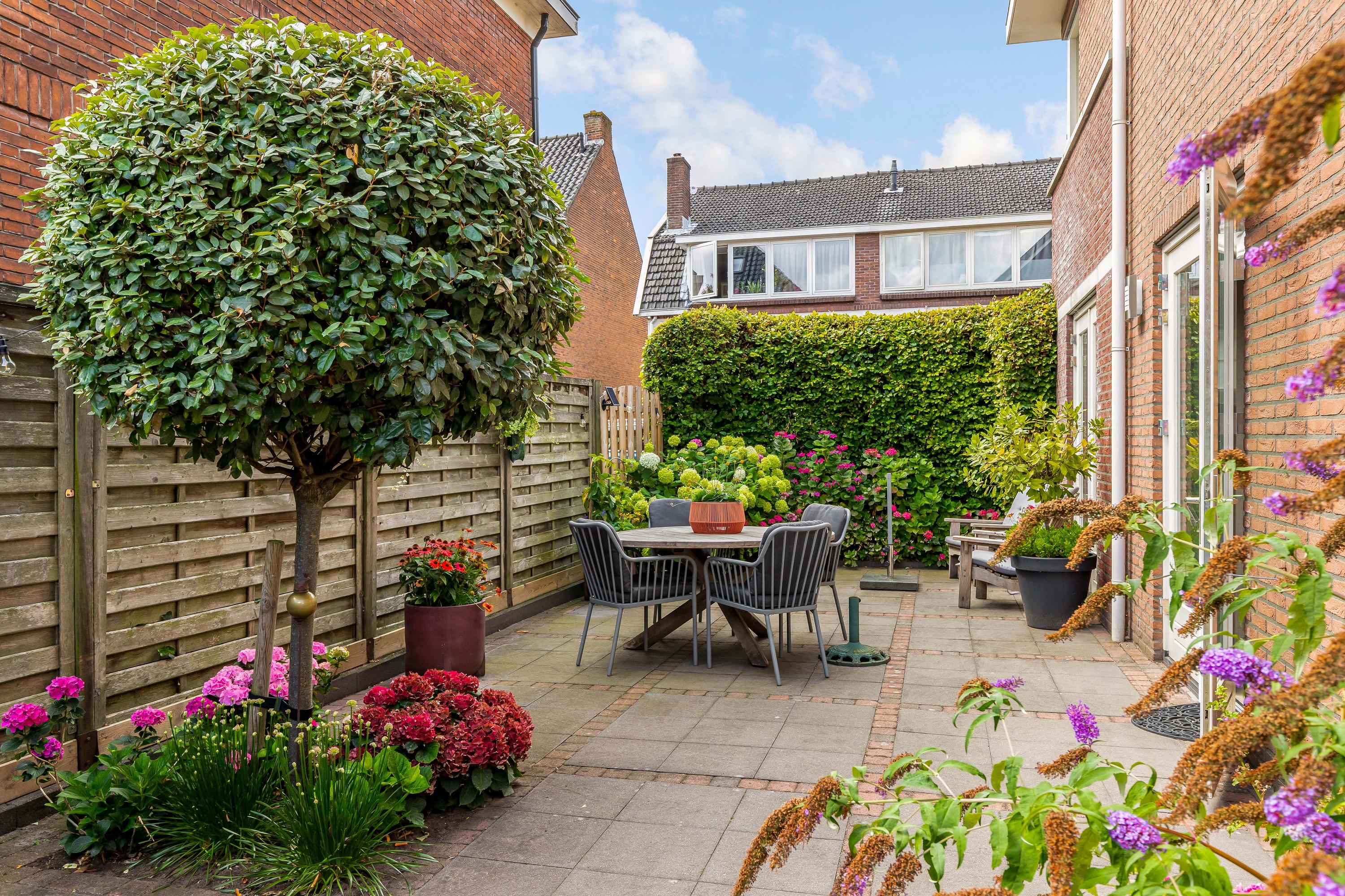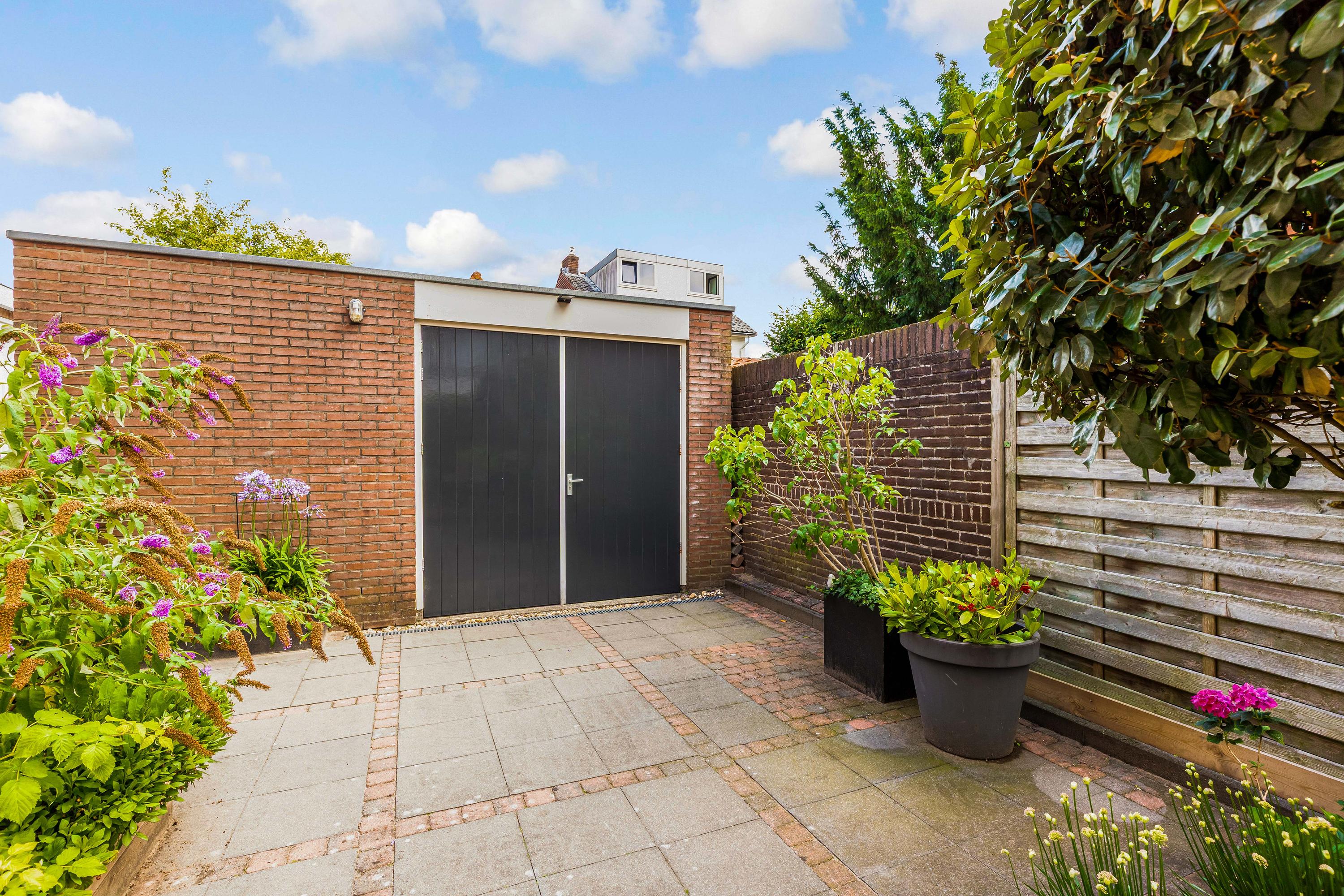 De zij- en achtertuin is gelegen op het zonnige zuidoosten, voorzien van een gevarieerde beplanting en sierbestrating. Het zonneterras biedt volop ruimte om te genieten van de zon, en er is directe toegang tot de garage en het bijgebouw. De tuin is zorgvuldig aangelegd, waardoor het zowel een rustige oase als een praktische buitenruimte is.