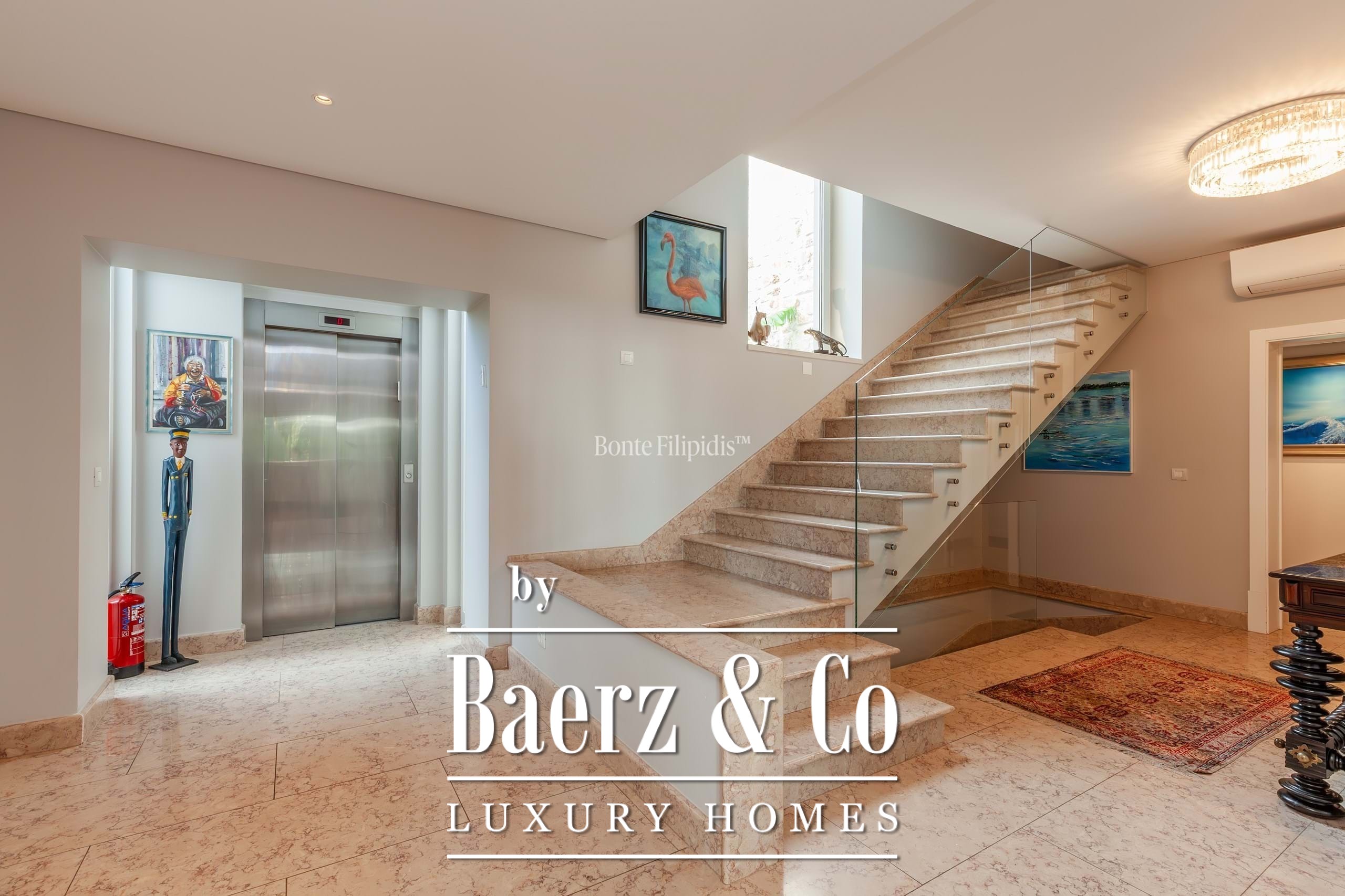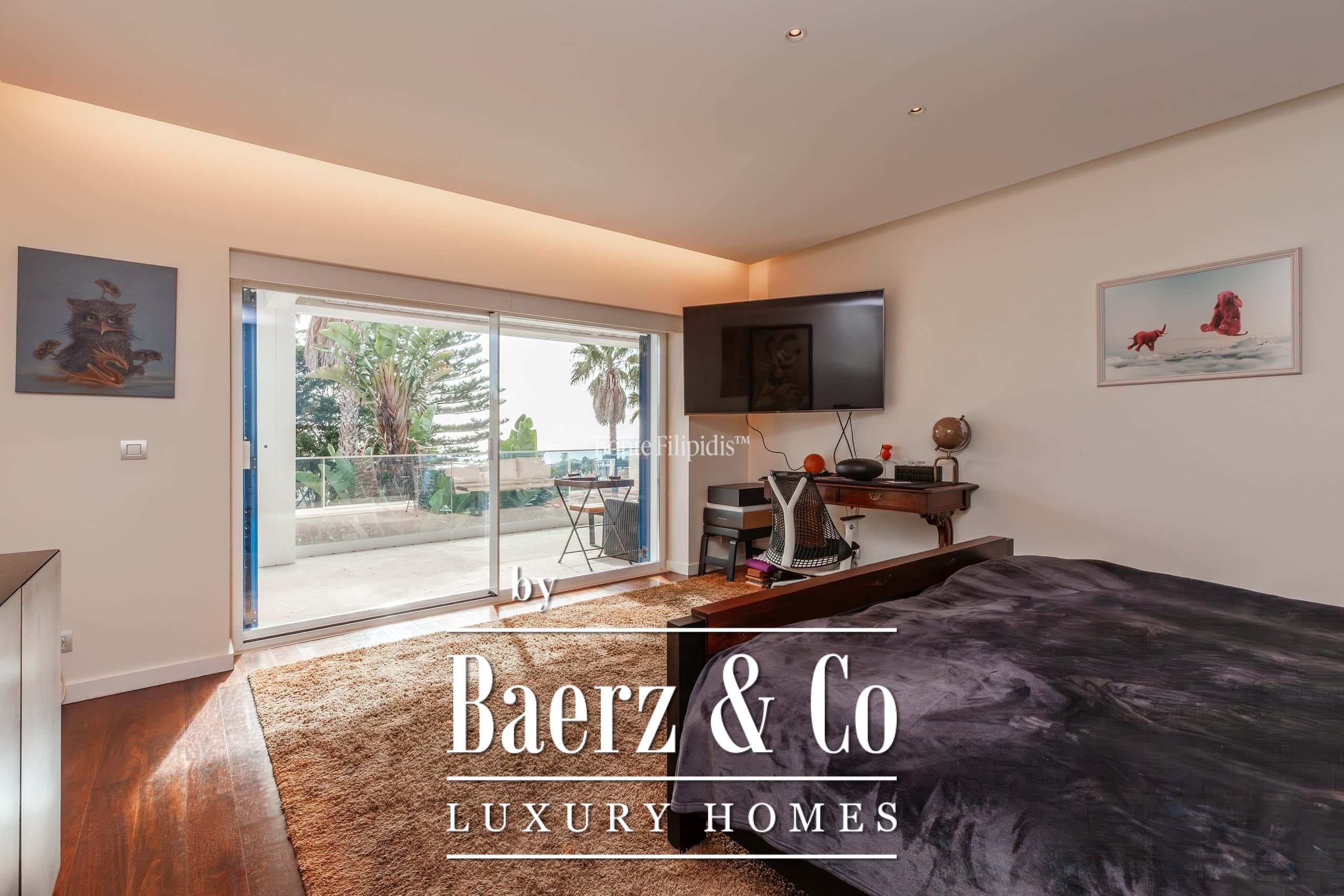 Het interieur van 448 m² is verdeeld over vier niveaus, telkens bereikbaar met de lift. Vijf slaapkamers, waaronder een master suite, en zes badkamers bieden een royaal verblijf. De lichte leefzones staan direct in verbinding met de terrassen onder een bioklimatische pergola die zich aanpast aan licht en luchtstroming. De keuken, uitgerust met geavanceerde technologie, ondersteunt stille routines en gastvrijheid.