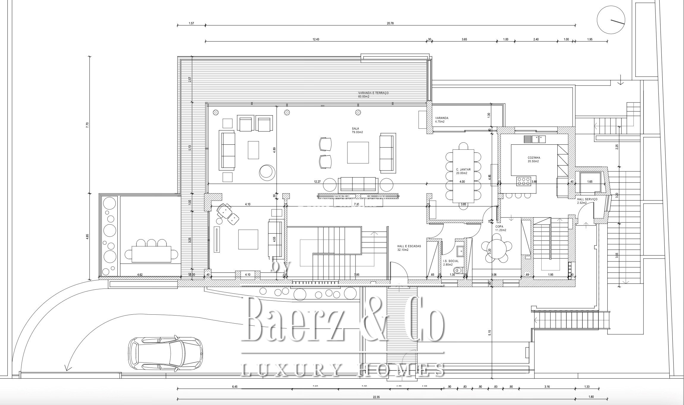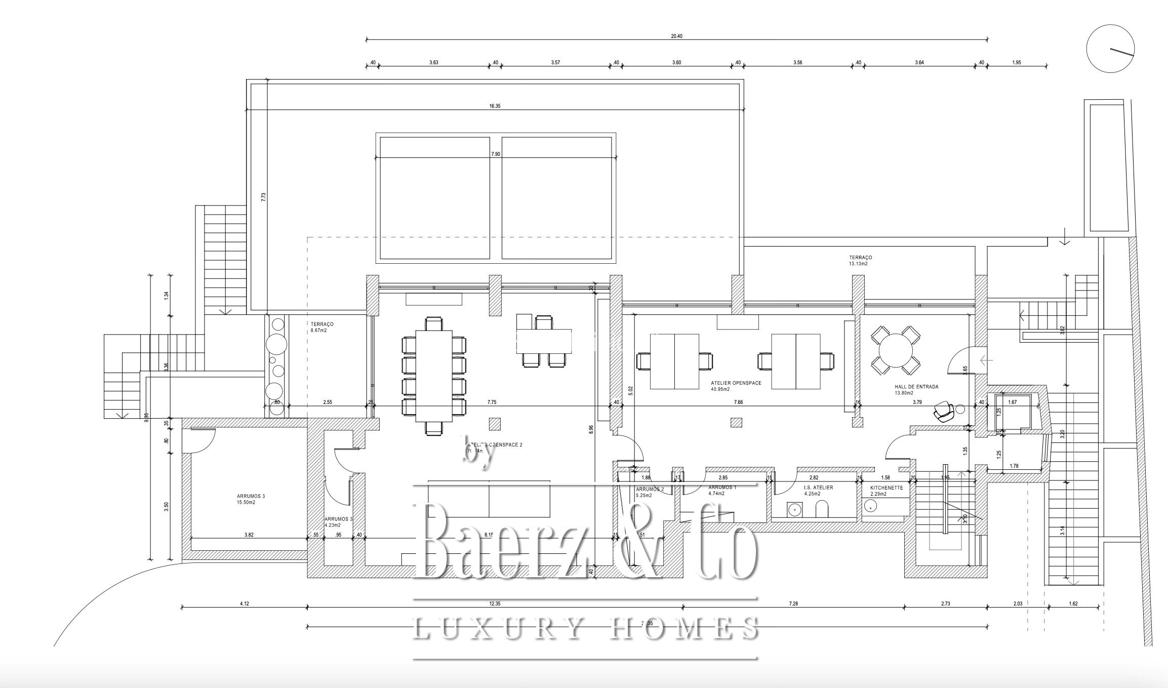De centrale woon- en eetkamer meet 100 m² en is onderverdeeld in drie subtiele zones, elk met toegang tot een panoramisch, rondom gelegen terras. Deze ruimtes sluiten aan op een royale keuken en ontbijtruimte, ideaal voor zowel ontspannen gezinsleven als stijlvolle ontvangsten. Het tuinniveau introduceert een lichte pool lounge met directe toegang tot de aangelegde tuin en een privézwembad, wat bijdraagt aan het karakteristieke samenspel tussen binnen en buiten.