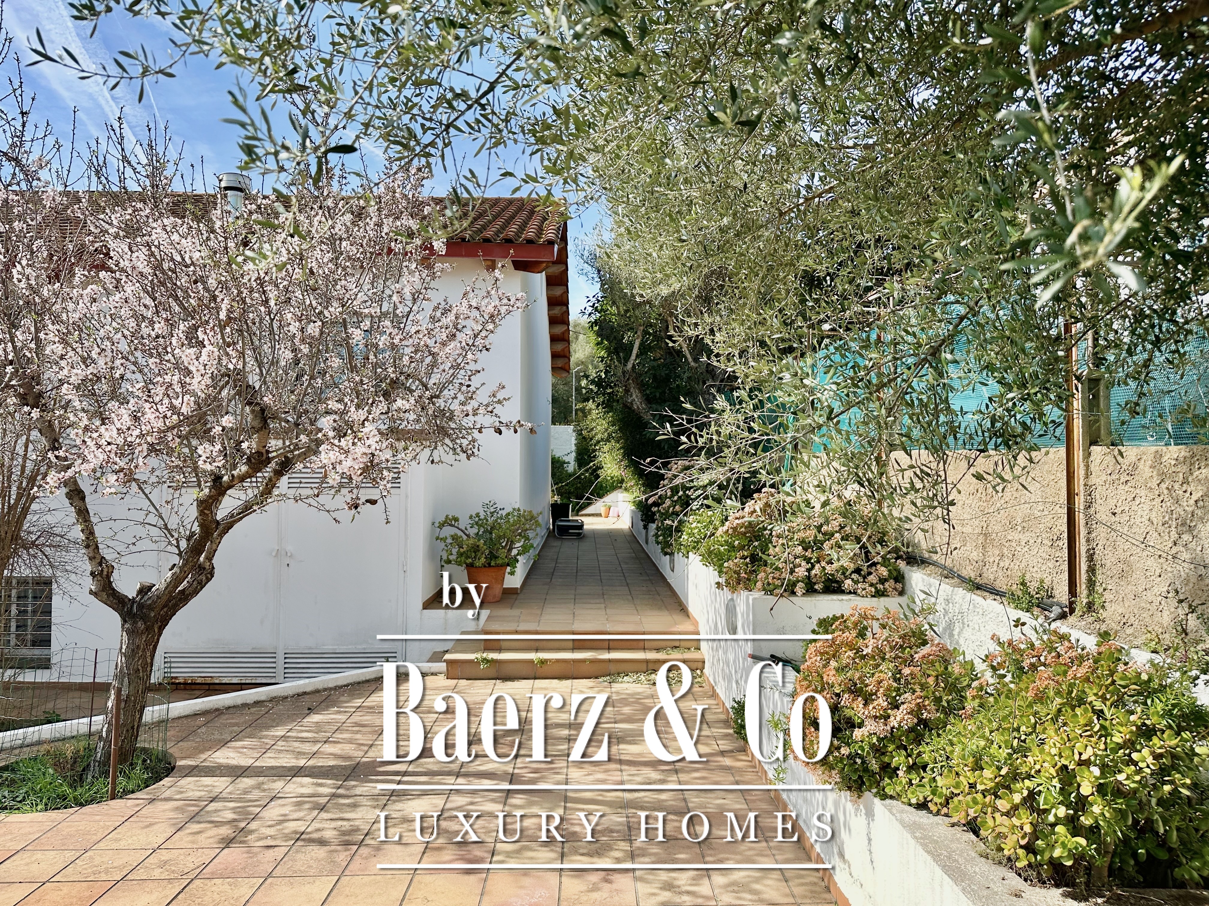 De hoofdverdieping wordt rijkelijk verlicht door grote ramen, waardoor de open keuken en eetruimte baden in daglicht. Een op het zuiden georiënteerd terras verlengt naadloos het woongedeelte naar buiten, waardoor het Mediterrane levensritme krachtig tot uiting komt. De eetkamer valt op door het schuin aflopende houten plafond met zichtbare balken, wat warmte en architectonisch karakter toevoegt. Deze ruimte is visueel en ruimtelijk verbonden met de royale woonkamer eronder en versterkt zo het gevoel van openheid in het huis.