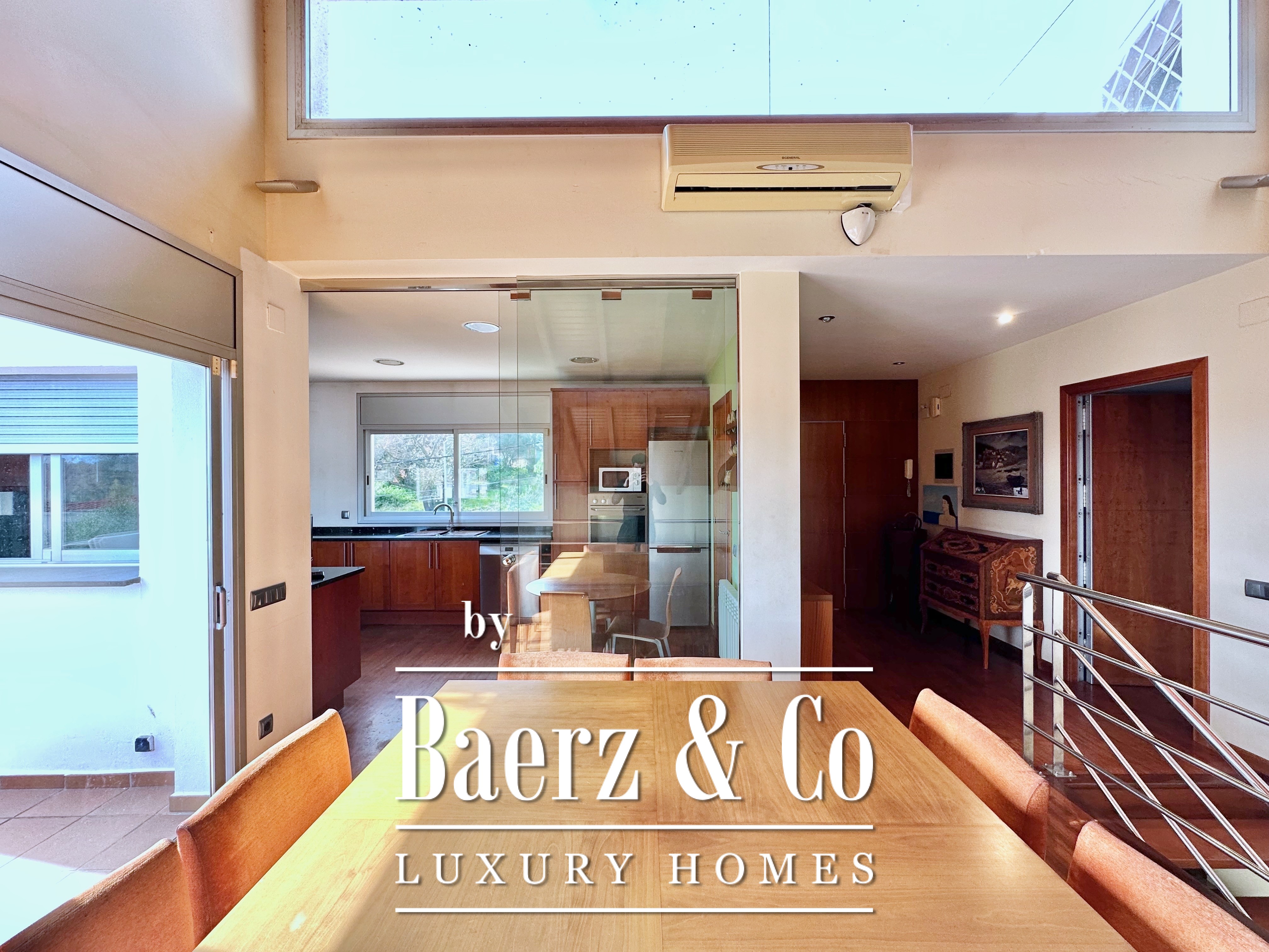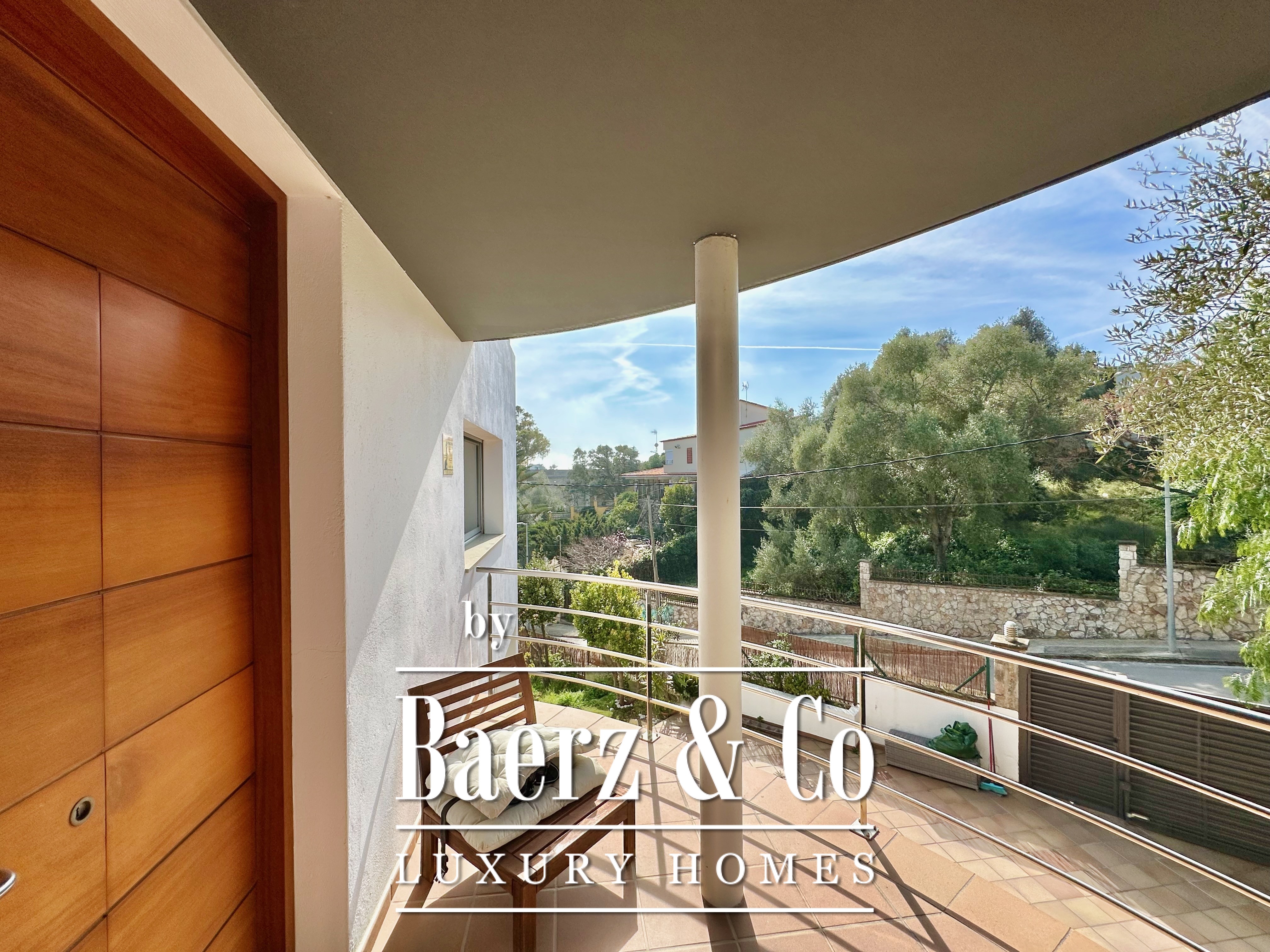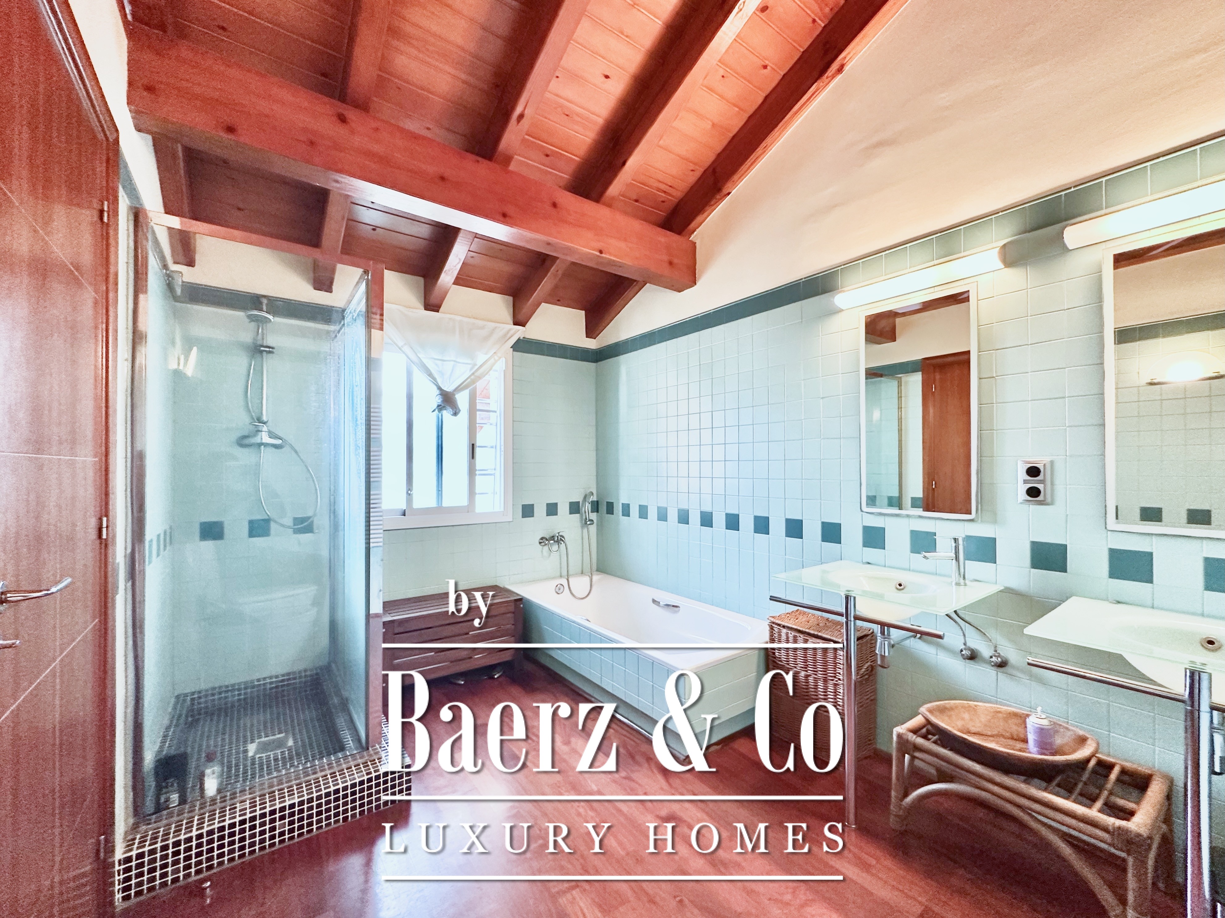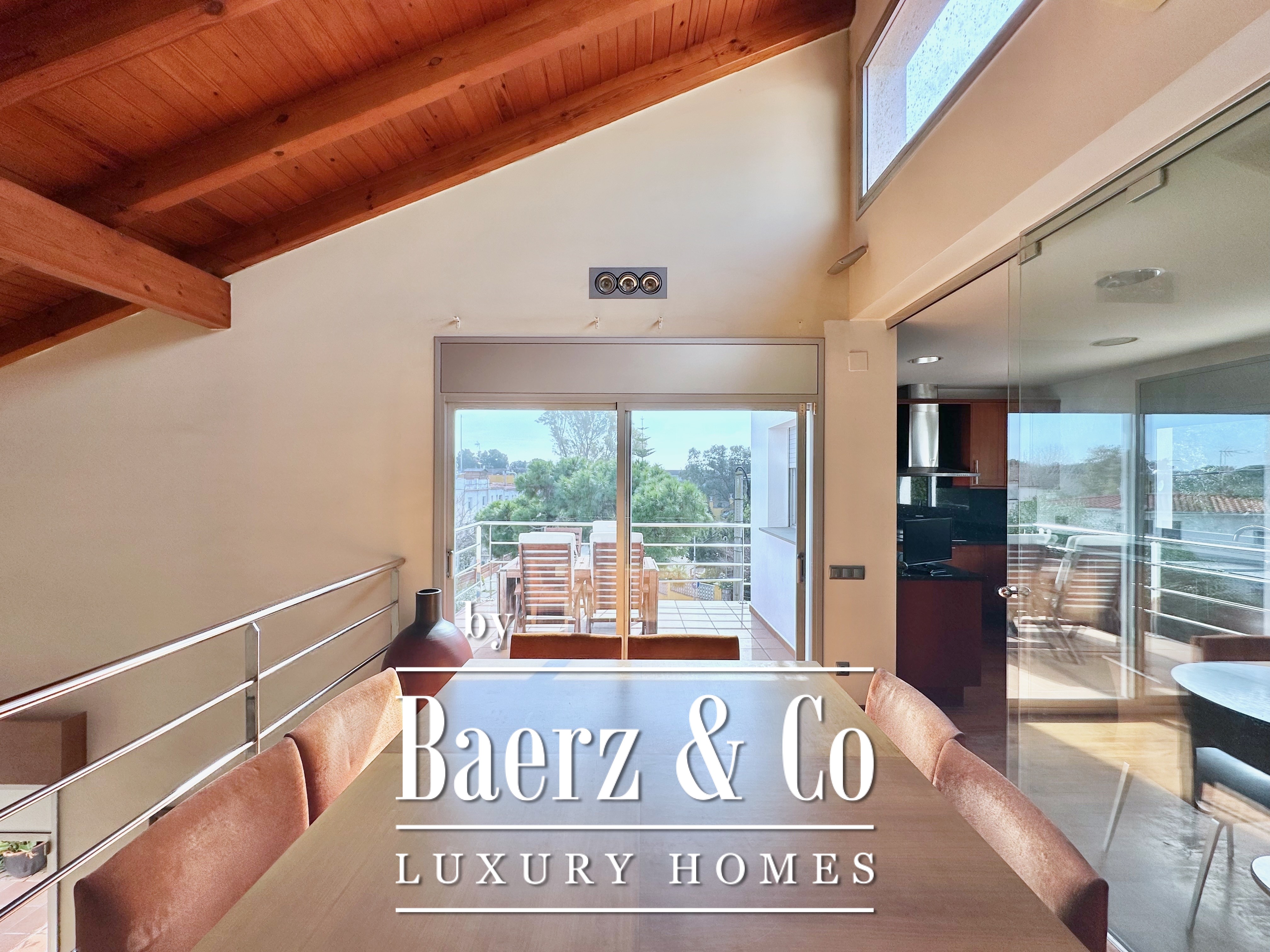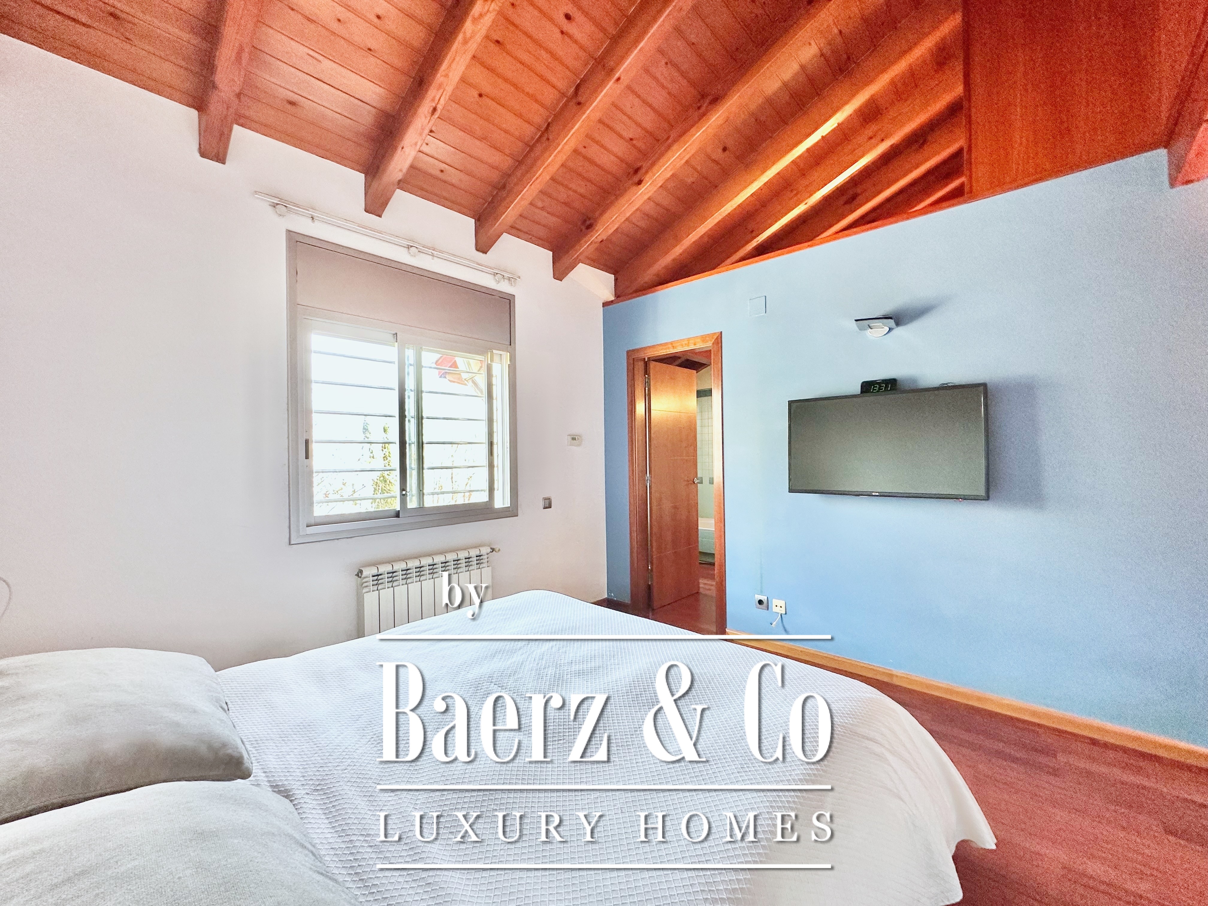 De privévertrekken bestaan uit vijf slaapkamers en twee badkamers. Twee dubbele kamers zijn samengevoegd tot een flexibele suite van meer dan 20 m², maar kunnen desgewenst eenvoudig weer gescheiden worden. Een zolder biedt mogelijkheden voor werk of ontspanning, met directe toegang tot een terras van 20 m² met panoramisch bergzicht. De hoofdsuite beschikt over een kleedruimte en een elegante badkamer met vijf elementen, en combineert comfort met ingetogen klasse. Deze vrijstaande woning te koop in Castelldefels integreert elk detail op doordachte wijze voor een levensstijl van allure in een van Spanje’s meest gewaardeerde kustplaatsen.