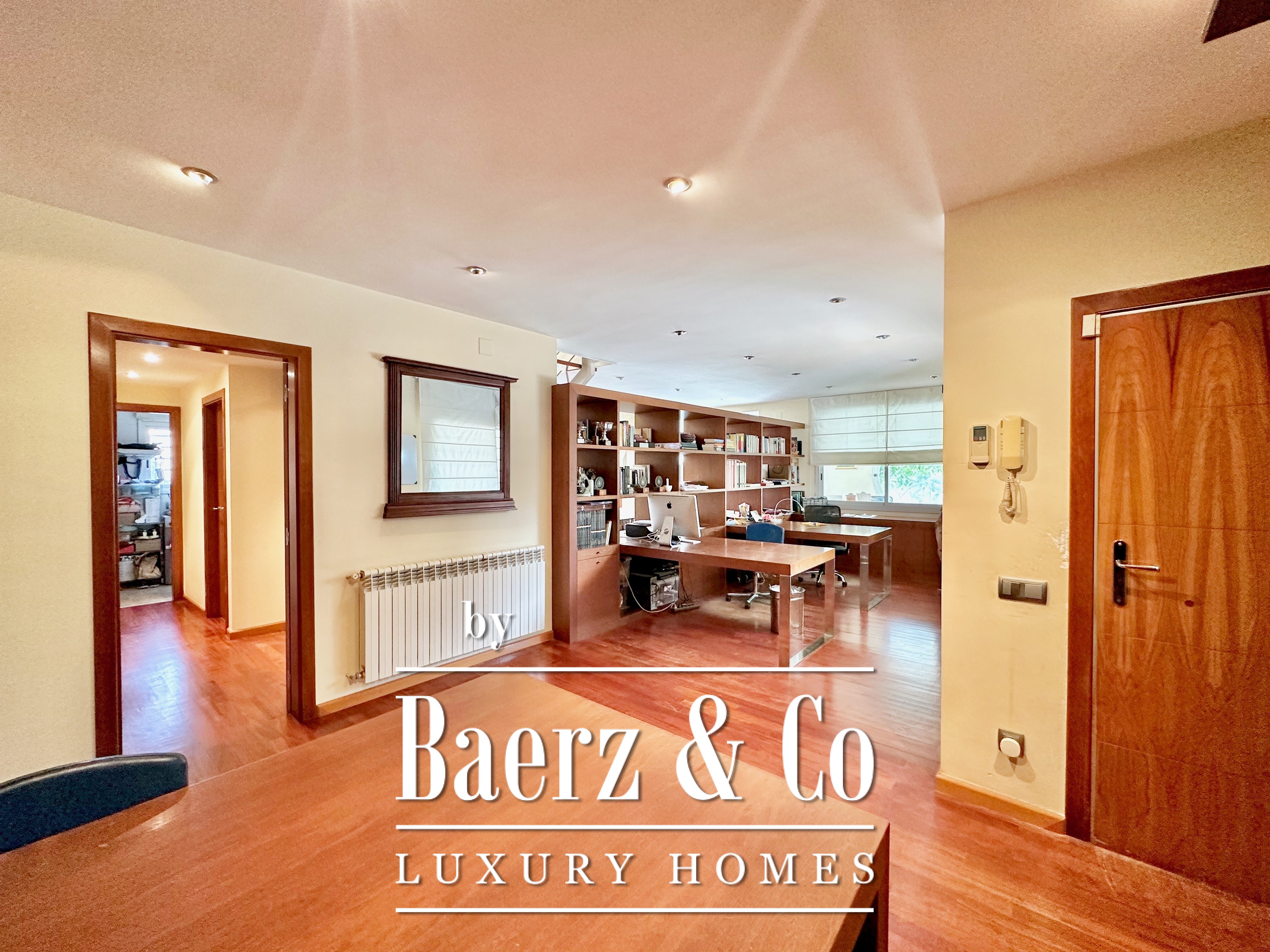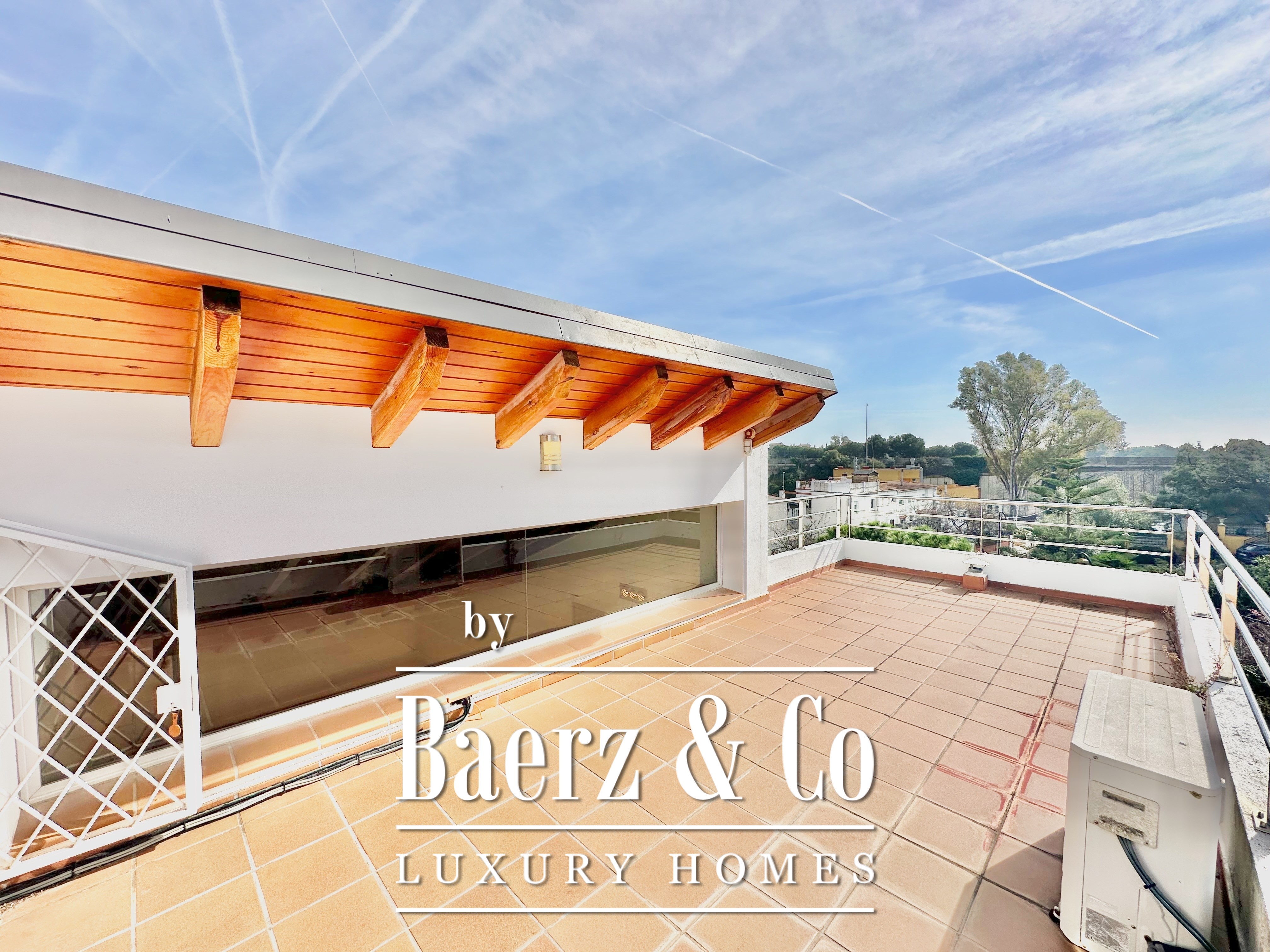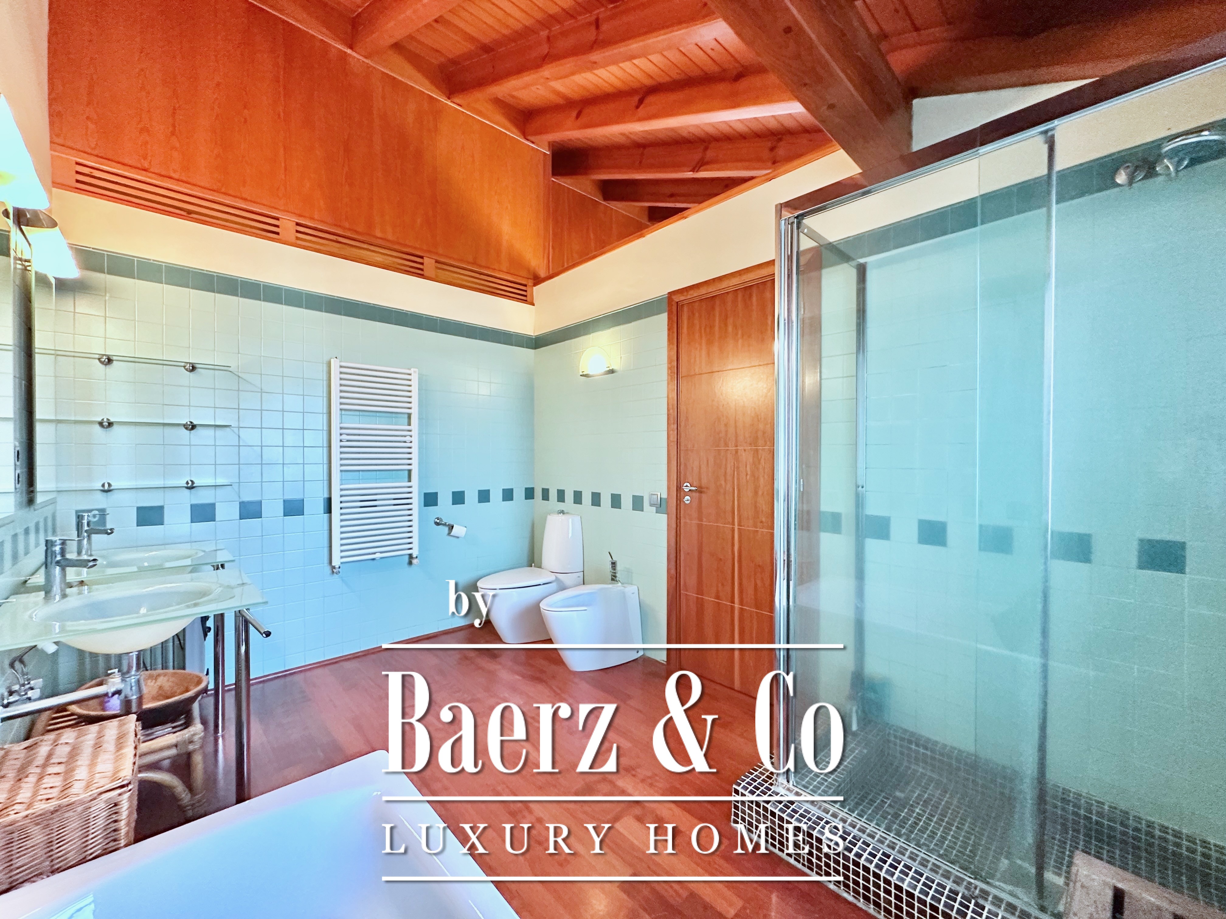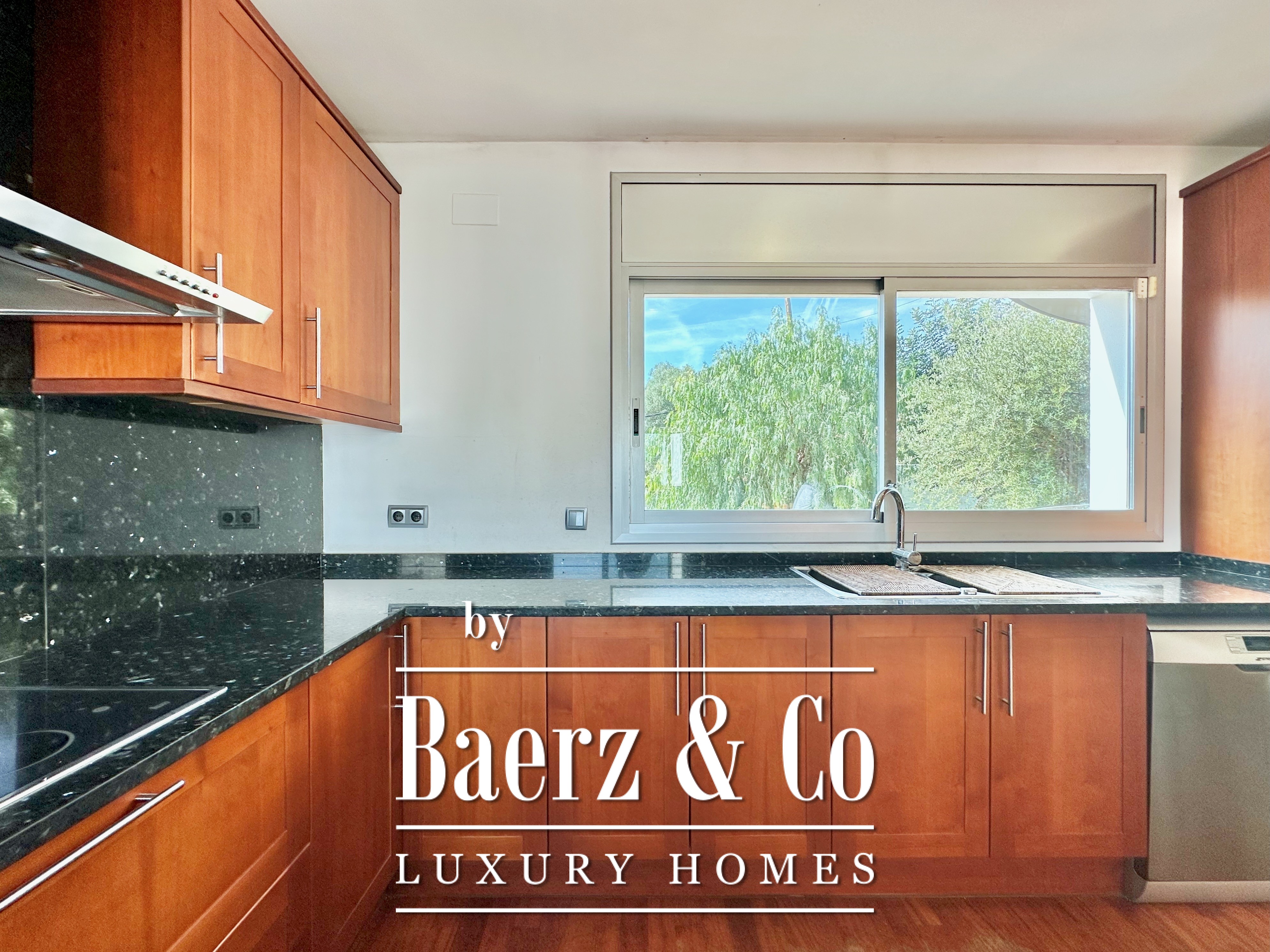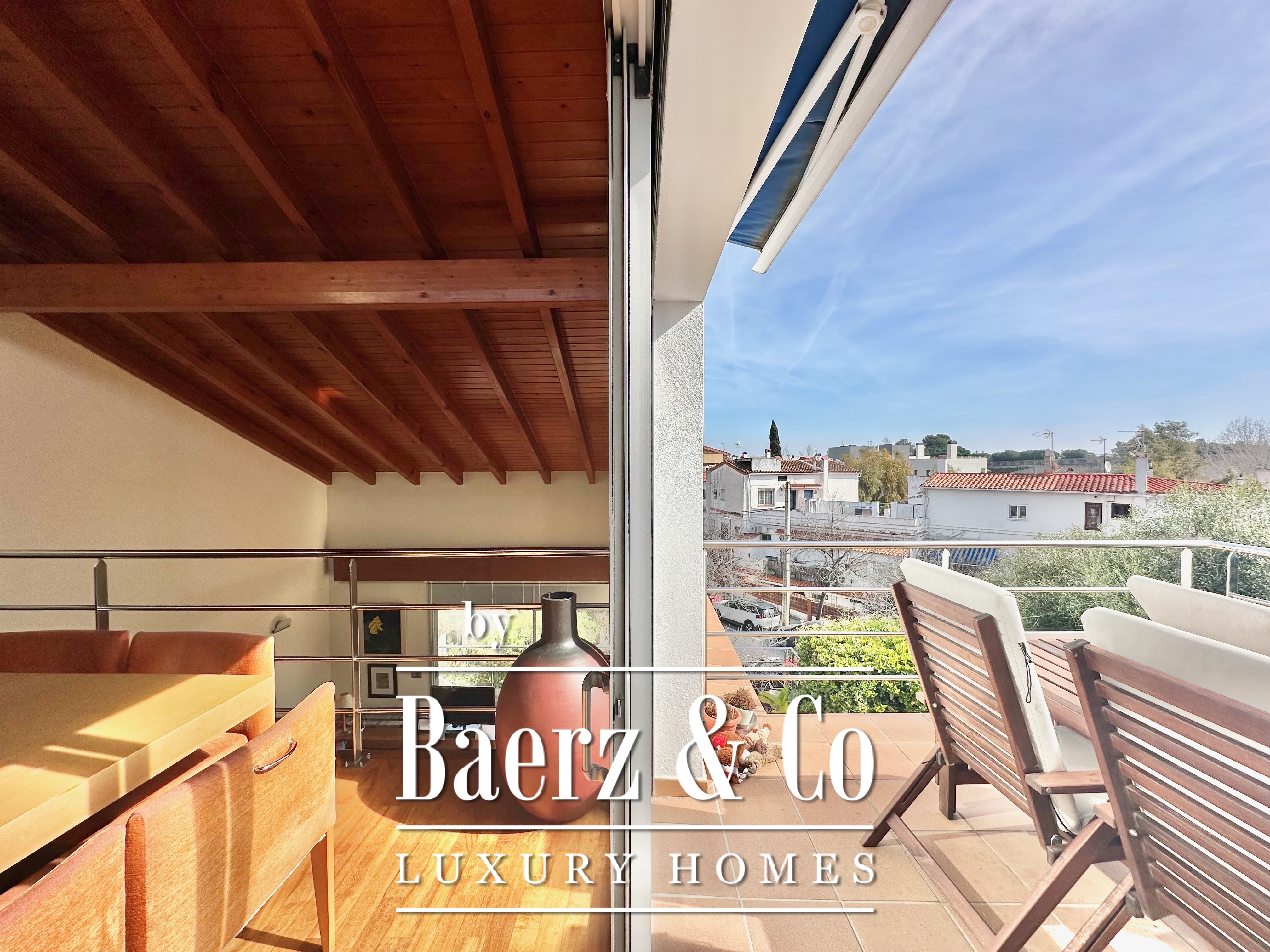 De privévertrekken bestaan uit vijf slaapkamers en twee badkamers. Twee dubbele kamers zijn samengevoegd tot een flexibele suite van meer dan 20 m², maar kunnen desgewenst eenvoudig weer gescheiden worden. Een zolder biedt mogelijkheden voor werk of ontspanning, met directe toegang tot een terras van 20 m² met panoramisch bergzicht. De hoofdsuite beschikt over een kleedruimte en een elegante badkamer met vijf elementen, en combineert comfort met ingetogen klasse. Deze vrijstaande woning te koop in Castelldefels integreert elk detail op doordachte wijze voor een levensstijl van allure in een van Spanje’s meest gewaardeerde kustplaatsen.