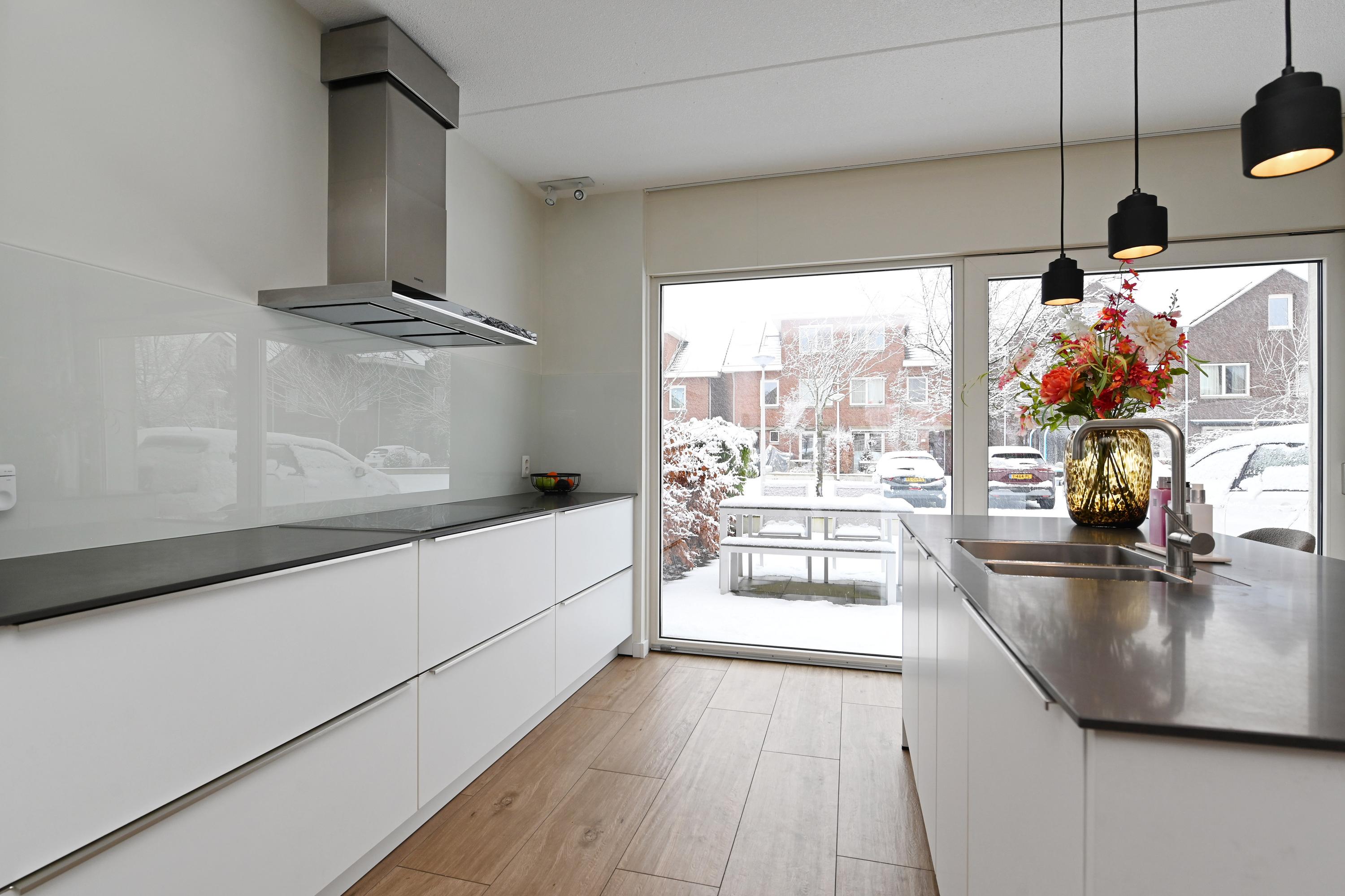 Bij binnenkomst in de woonkamer bevindt zich aan de voorzijde van het huis de ruime open keuken. De keuken is voorzien van een spoeleiland, veel kastruimte en diverse inbouwapparatuur. Via de schuifpui heb je direct toegang tot het terras in de voortuin – een heerlijke plek voor een kop koffie of een drankje in de zon.