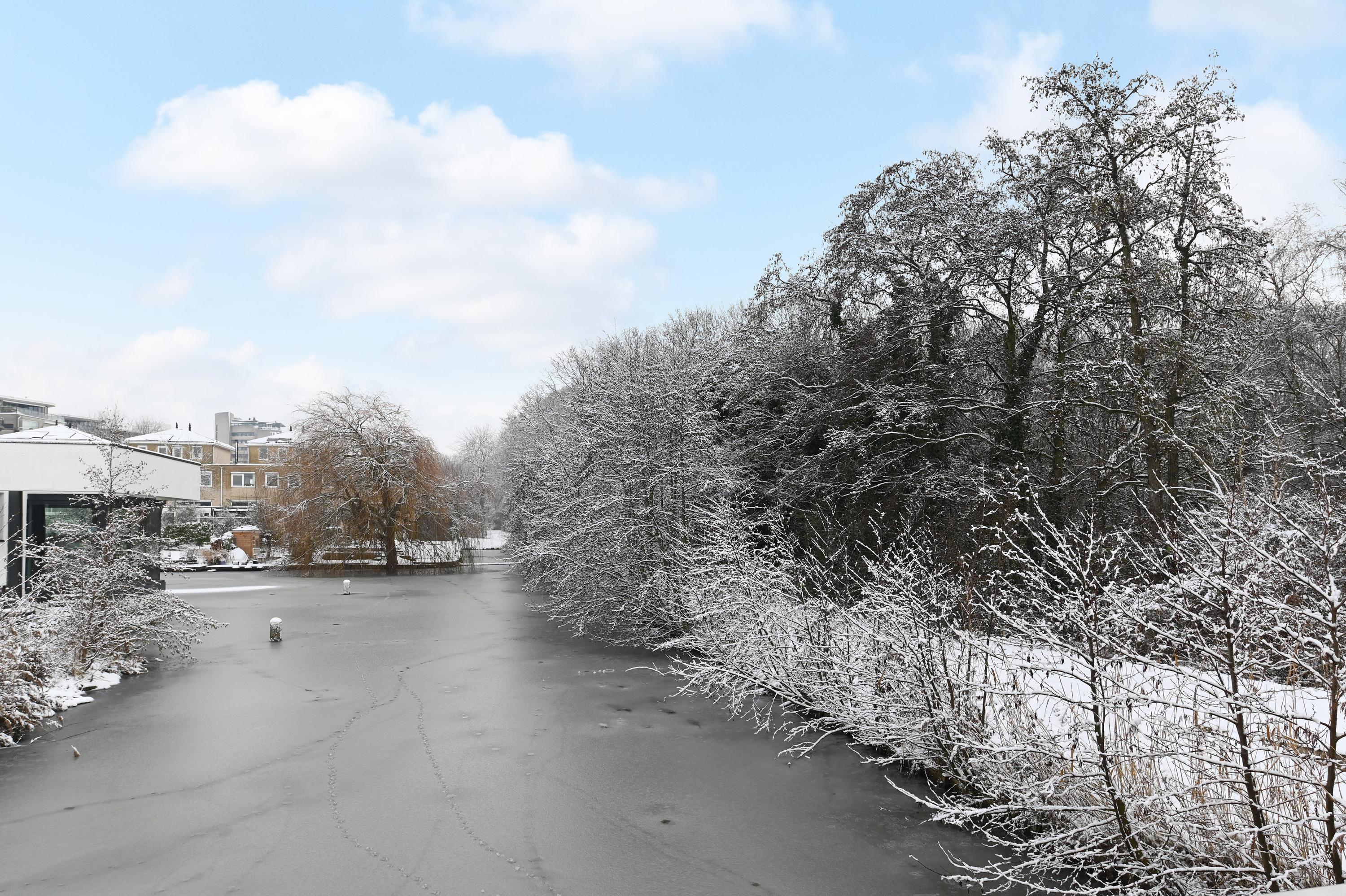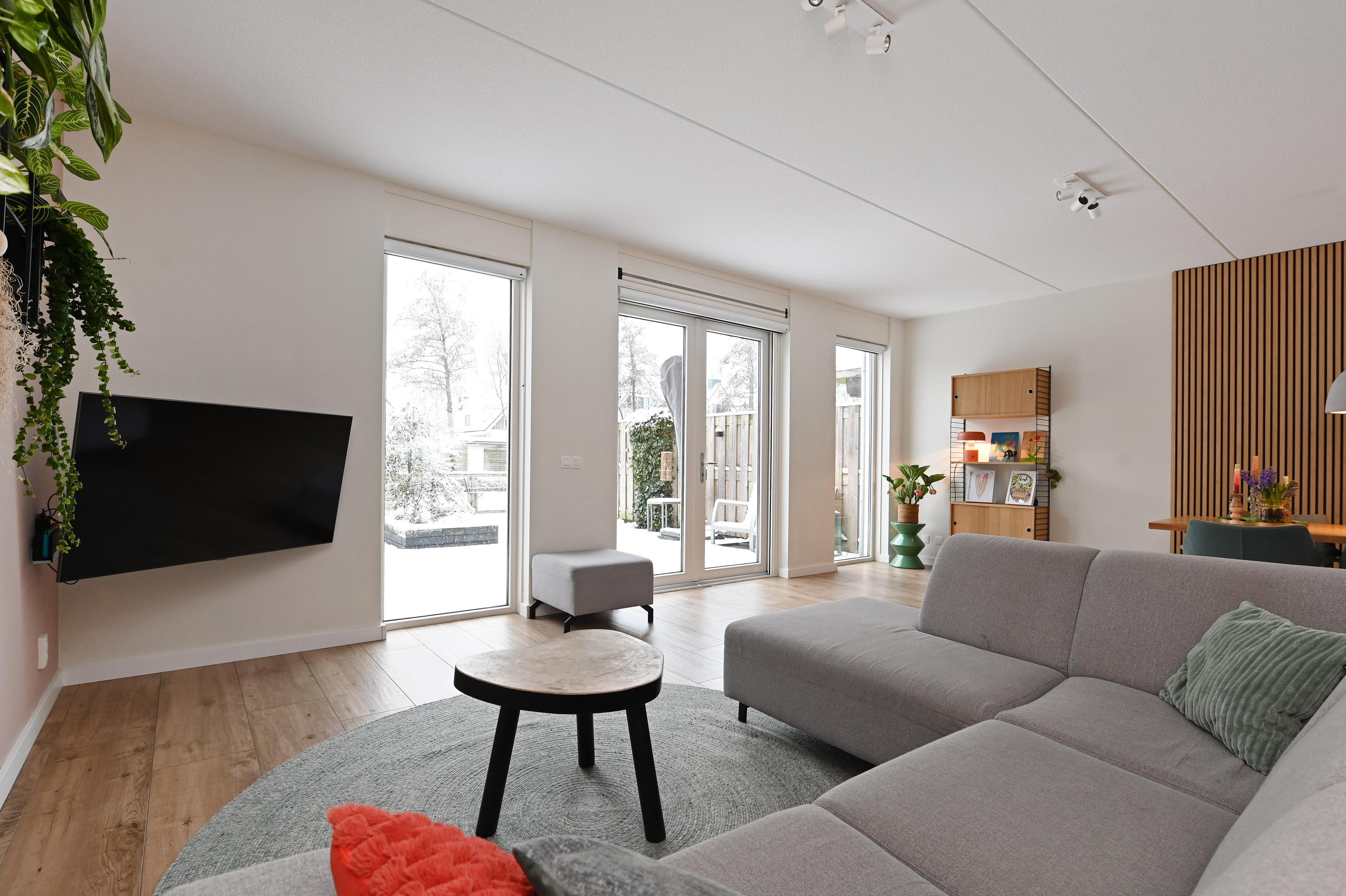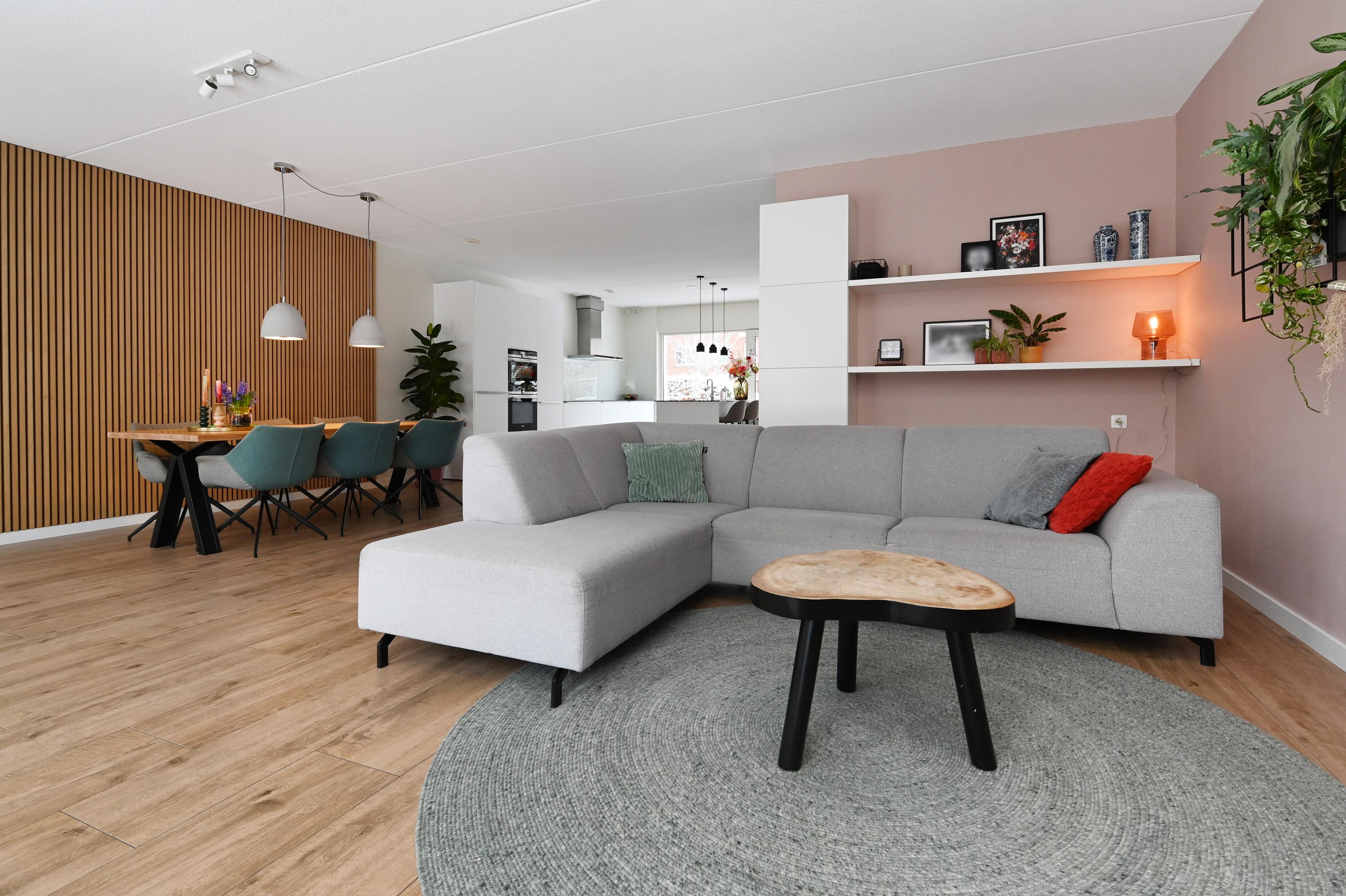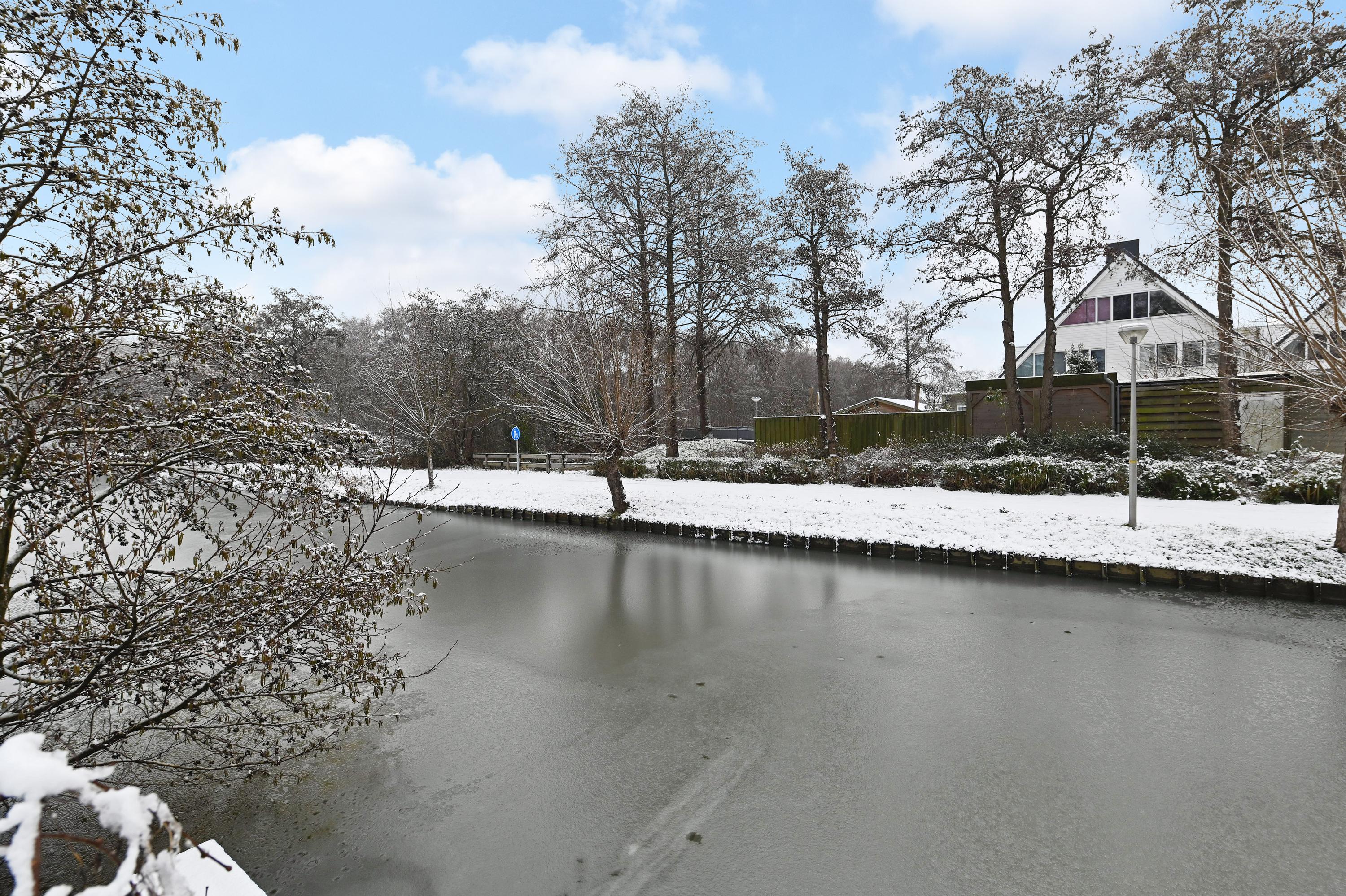 Aan de achterzijde is de woning uitgebouwd en bevindt zich het zit-/woongedeelte met zicht op de achtertuin die met een vlonder grenst aan het water. De woonkamer is breed en door de uitbouw veel dieper dan gebruikelijk en biedt daardoor ruimte voor een royale, riante zithoek.