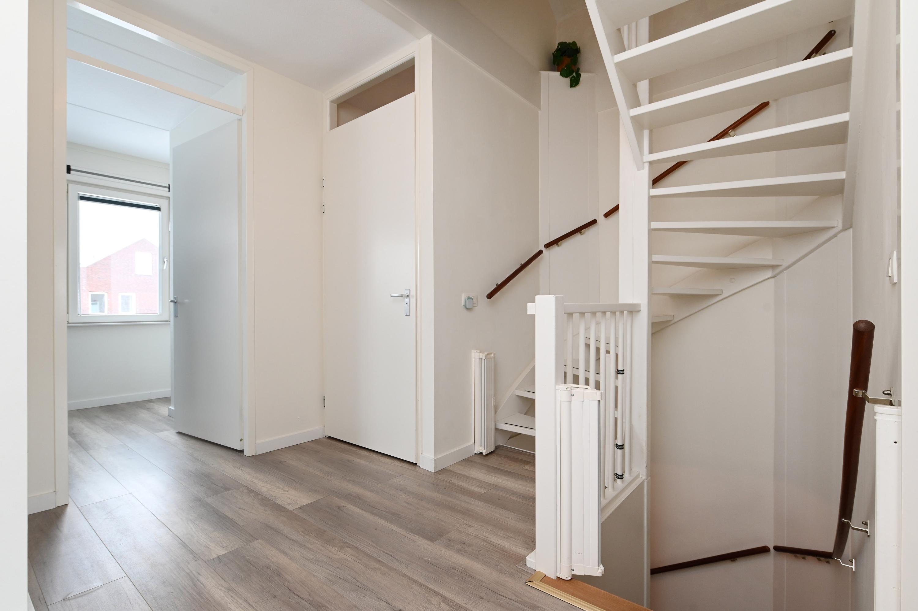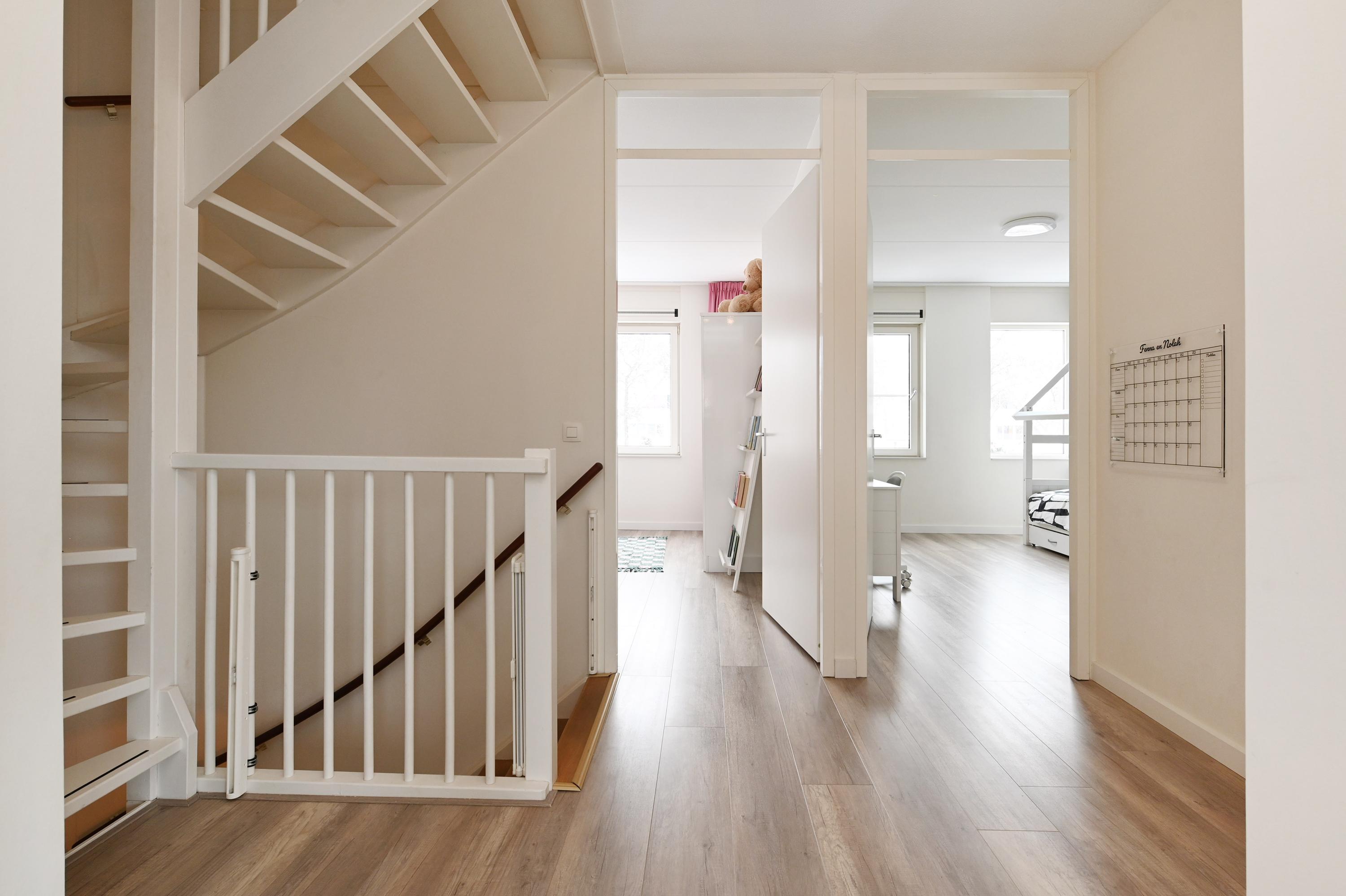 Via het ruime en lichte trappenhuis bereik je de eerste verdieping met een royale overloop die toegang geeft tot drie (van oorsprong vier) slaapkamers.