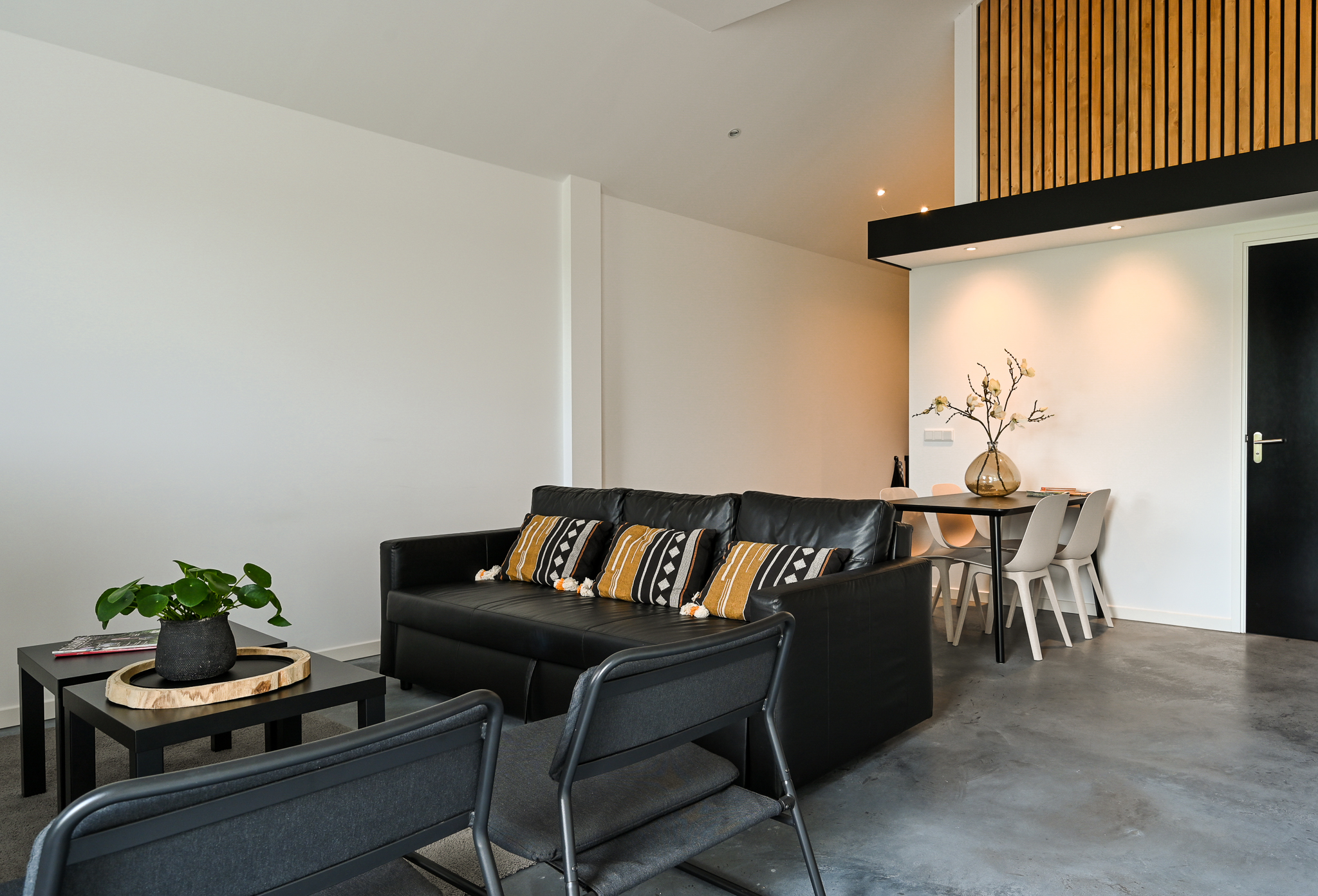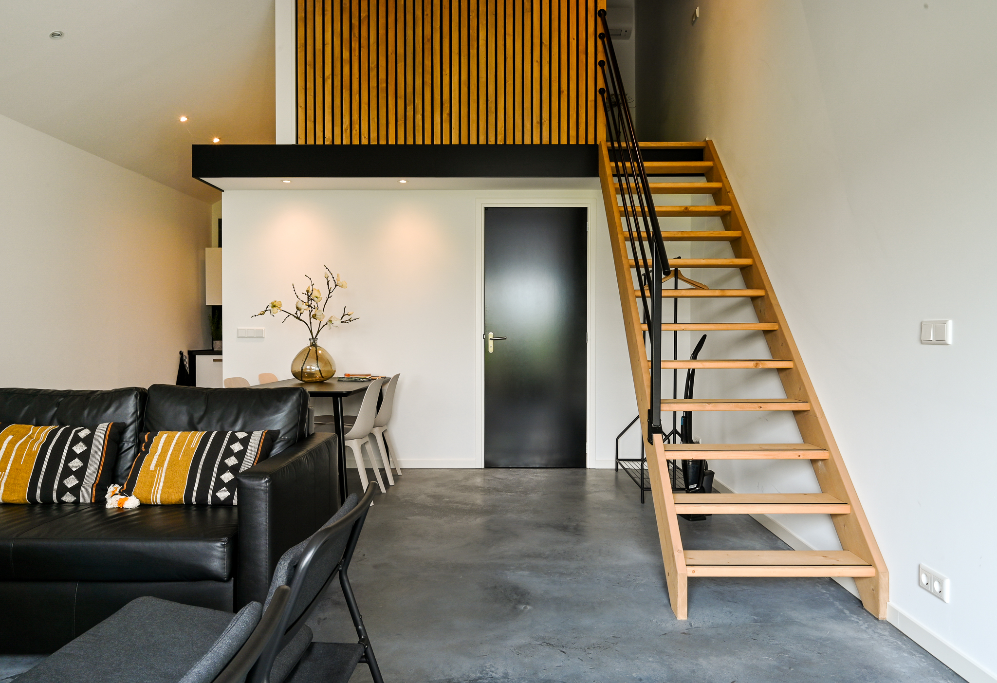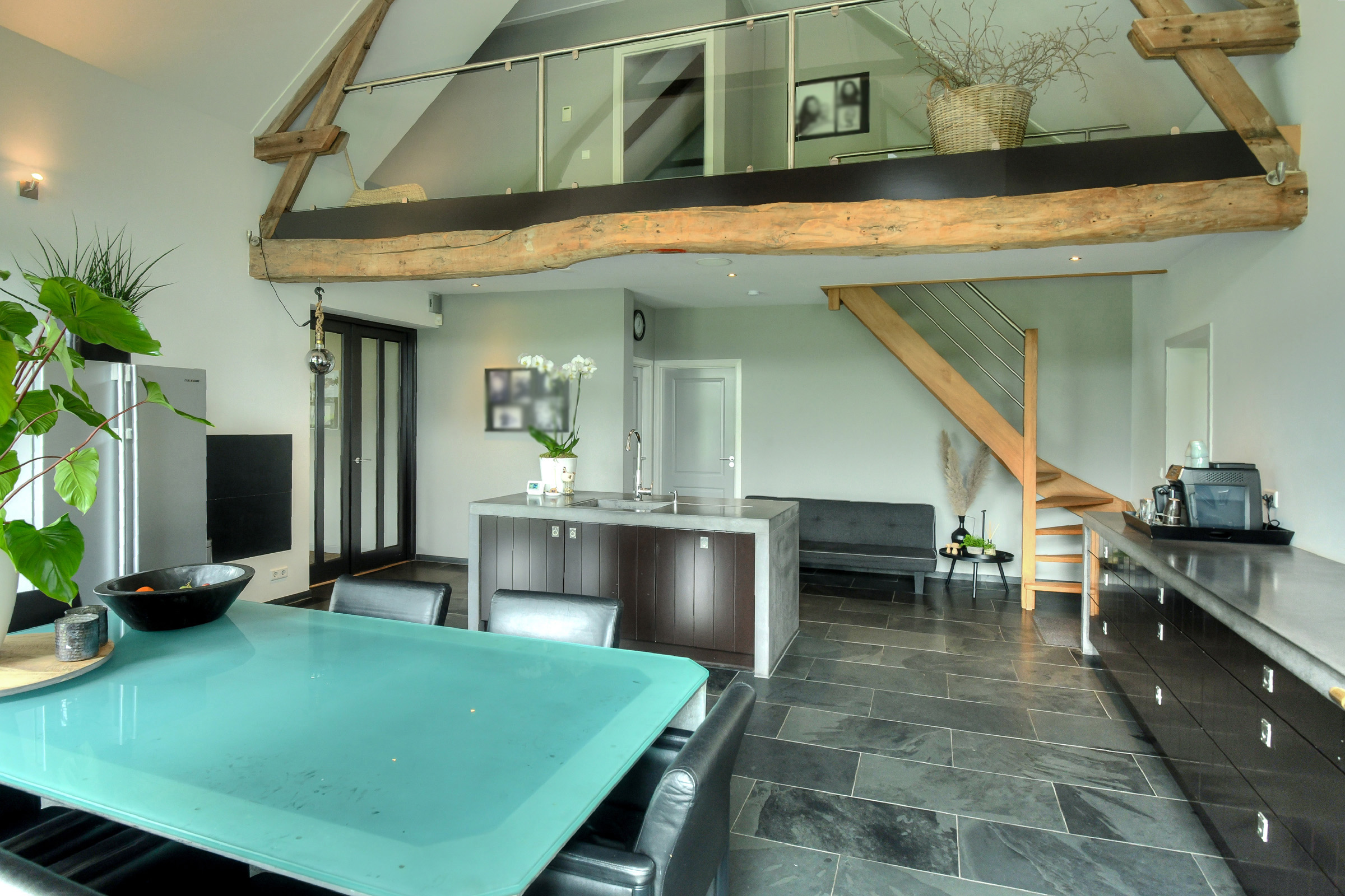 Een extra ruimtelijk effect wordt verkregen door de hoge kapconstructie die in het zicht gebleven is.