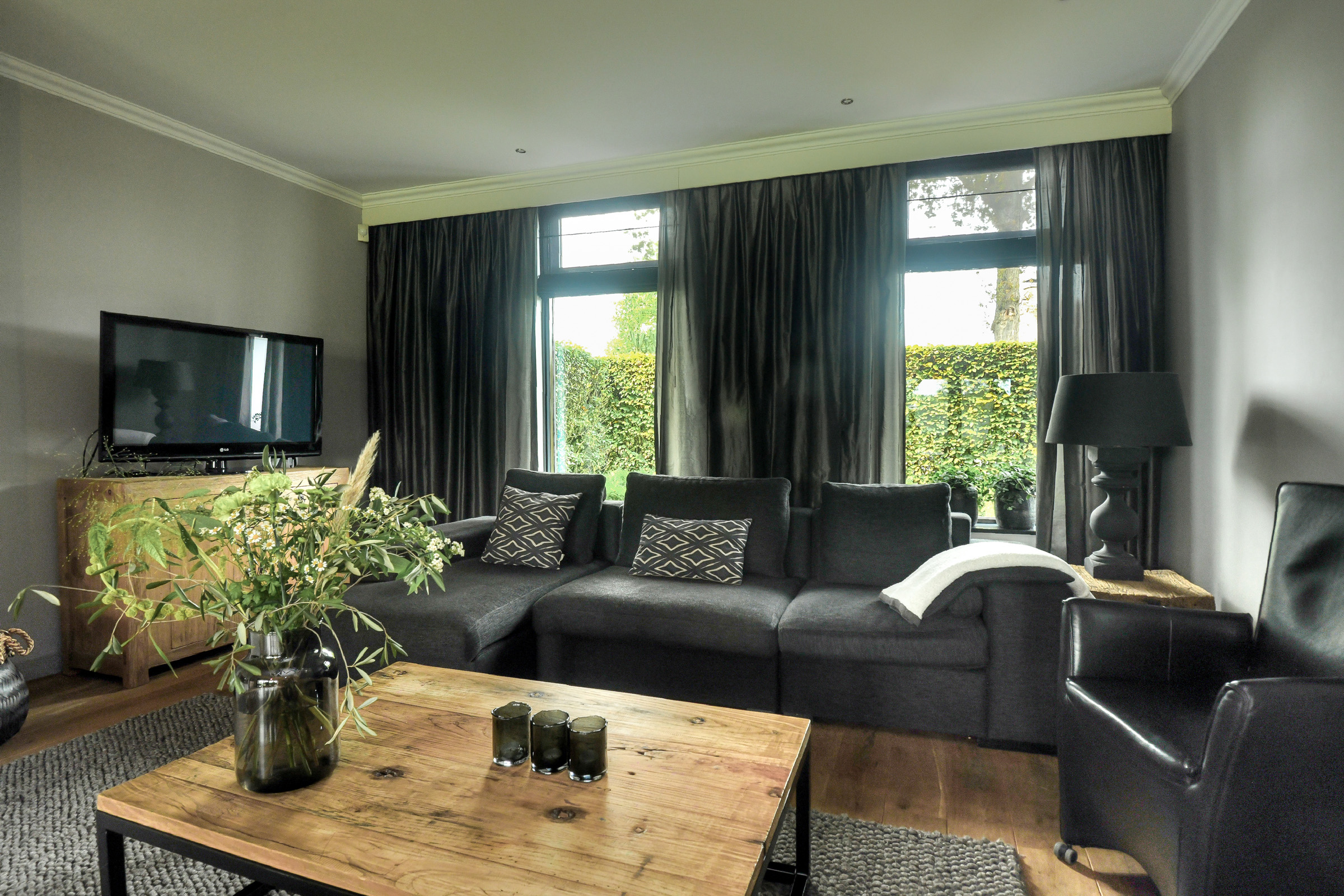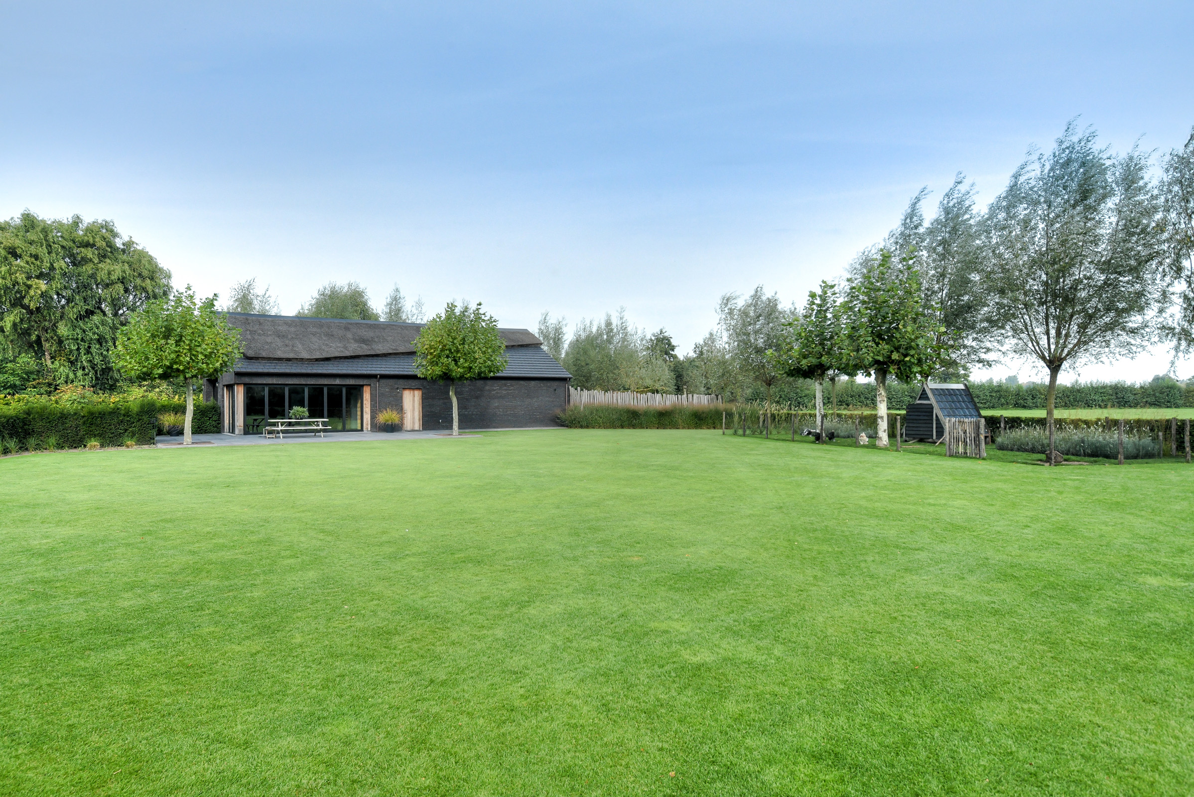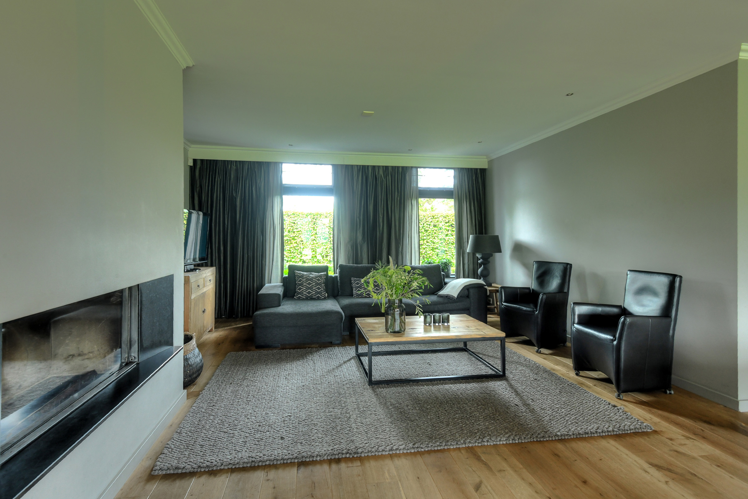 Aan de tuinzijde bevinden zich twee dubbele tuindeuren én een grote glaspartij waardoor u prachtig zicht heeft op de tuin en het achtergelegen weiland/natuurgebied. In de tussenliggende wand is een moderne gashaard geplaatst.