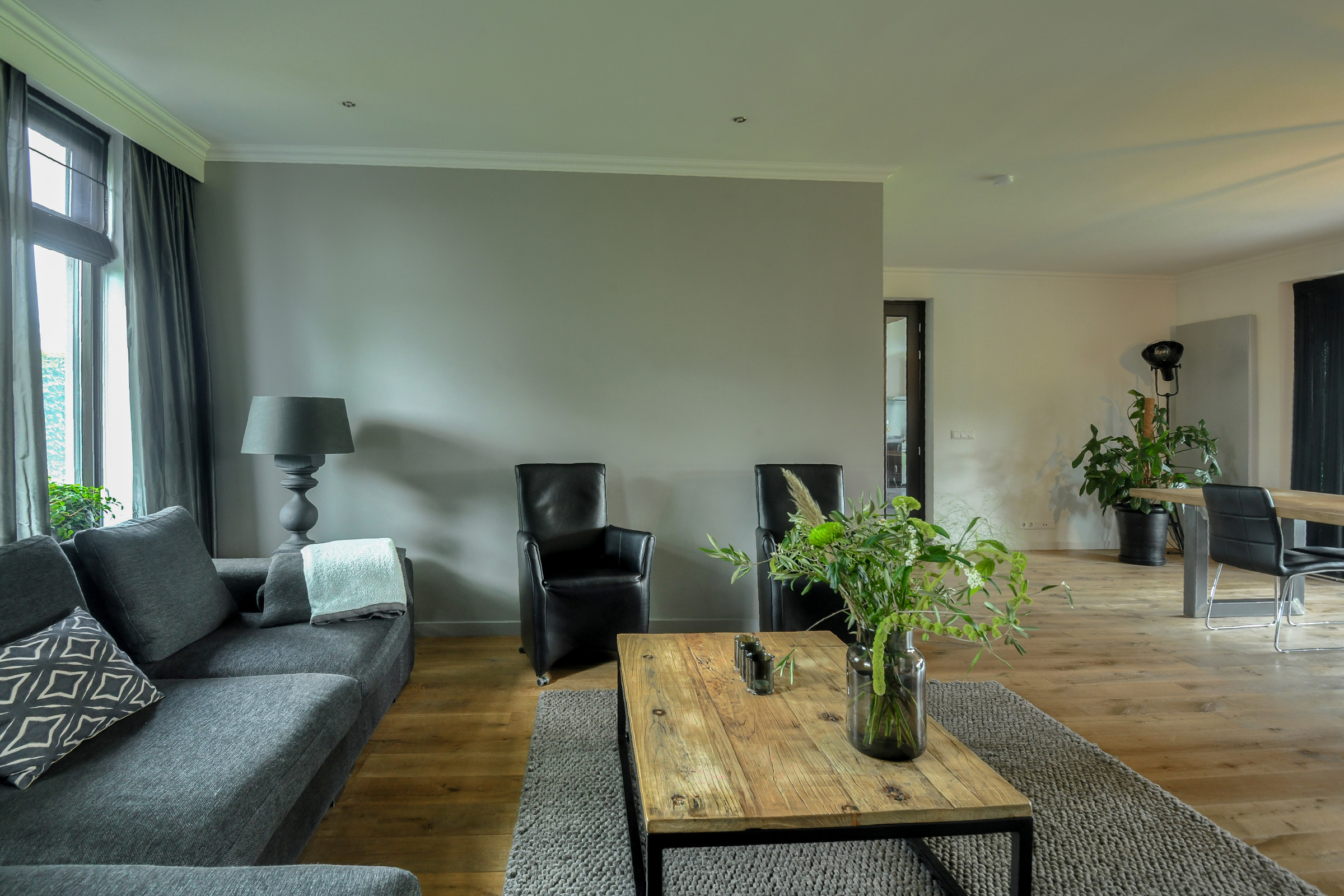 Ruime L-vormige woonkamer (ca. 47 m²) met moderne schouw met inzethaard. De woonkamer is voorzien van eiken vloerdelen.