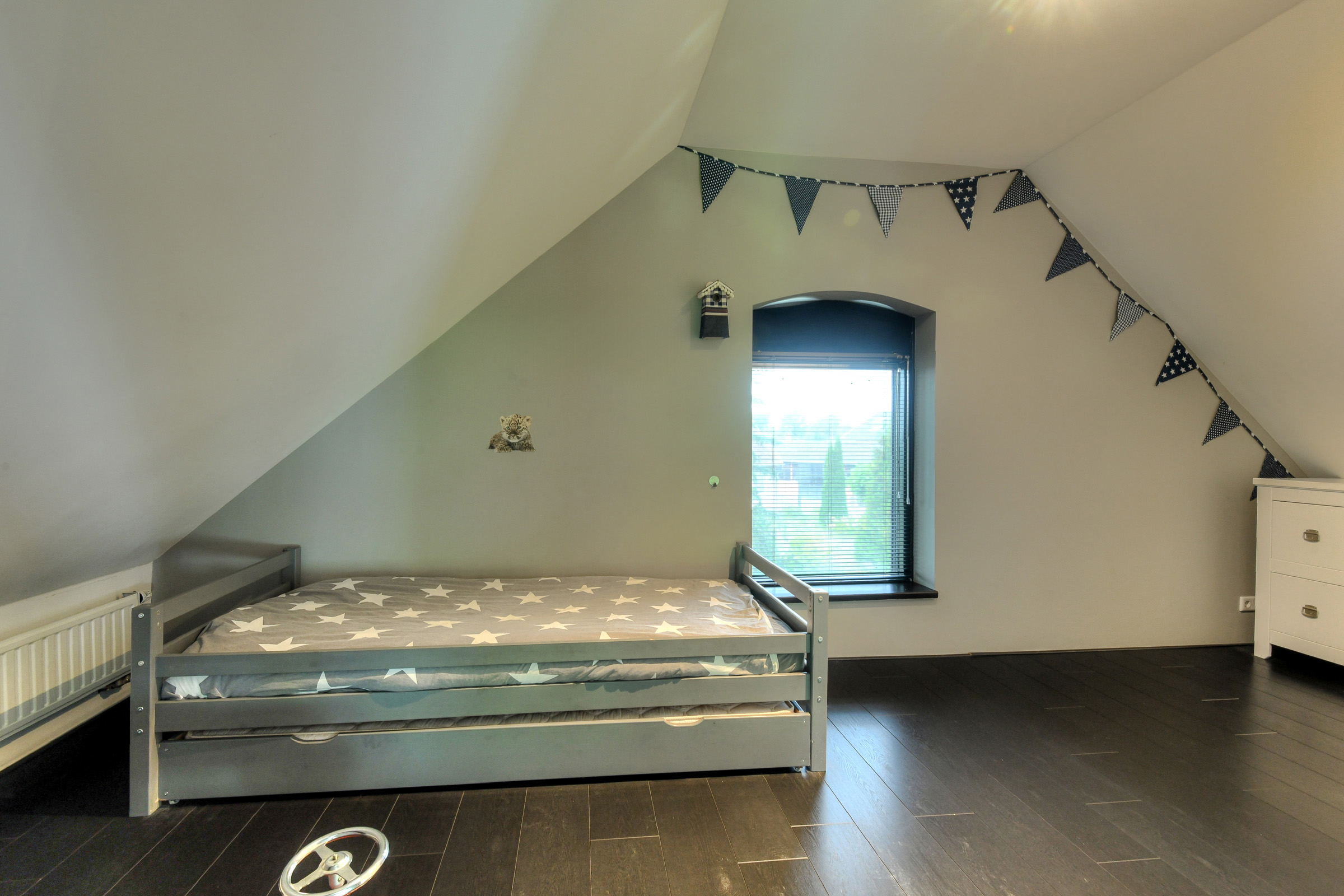 Ouderslaapkamer (ca. 4.55 x 3.00 m) met grote garderobekast, in deze ruimte bevindt zich ook de meterkast (8 groepen + krachtstroom + aardlekschakelaar). De vloer is voorzien van sfeervol donker laminaat.