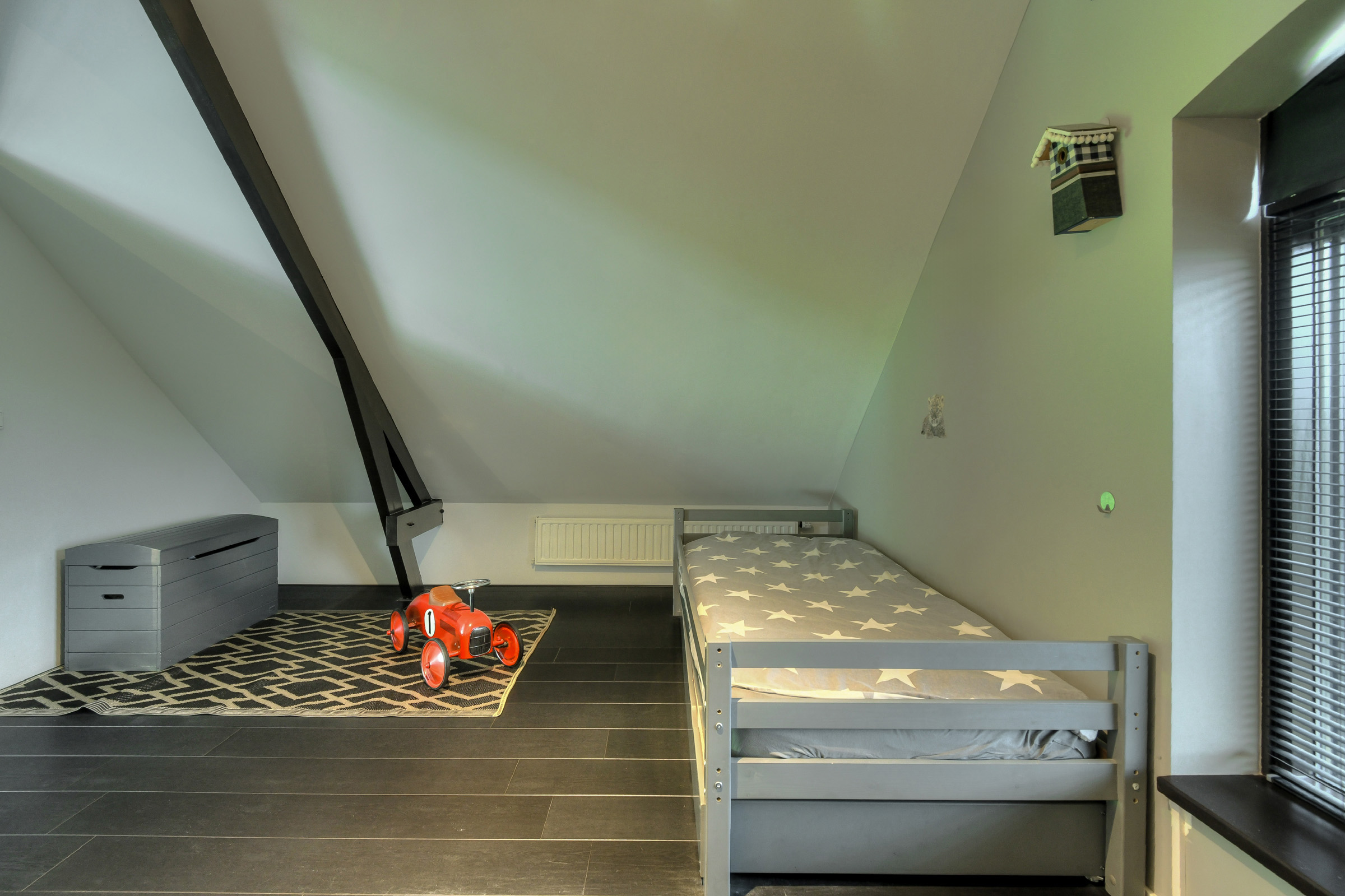 Voorslaapkamer (ca. 6.25 x 2.60/3.50 m), ook in deze kamer is de kapconstructie deels in het zicht gebleven.